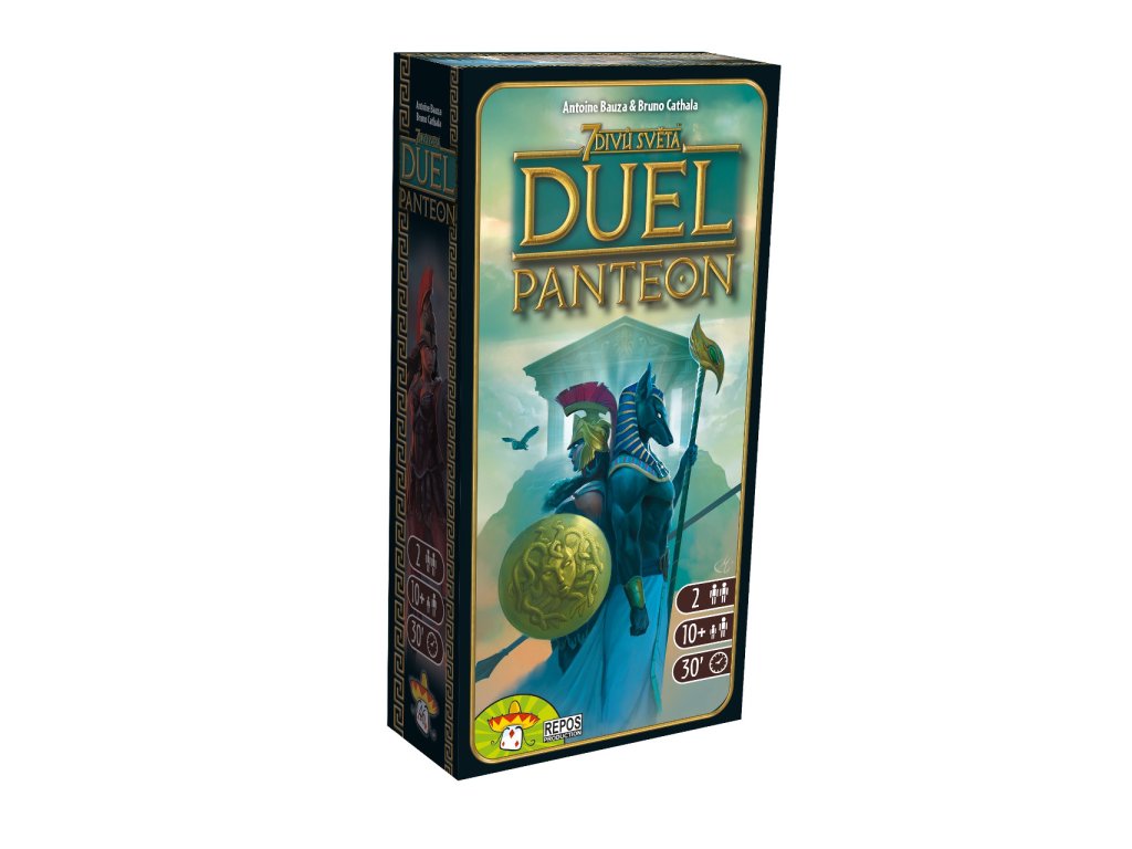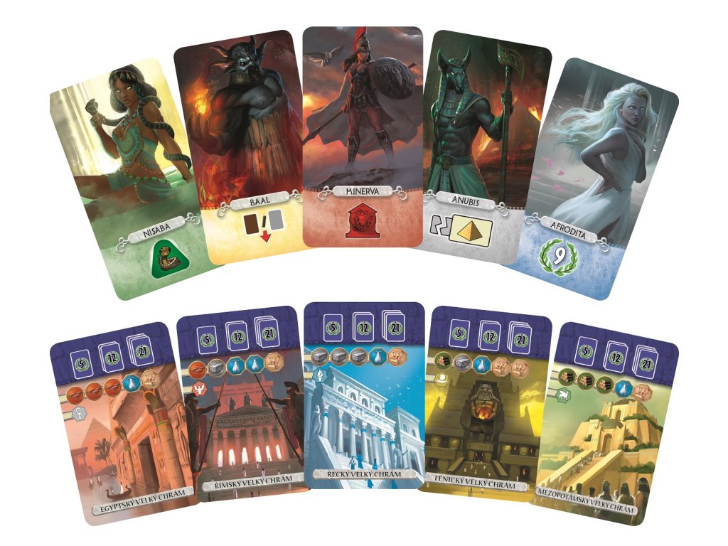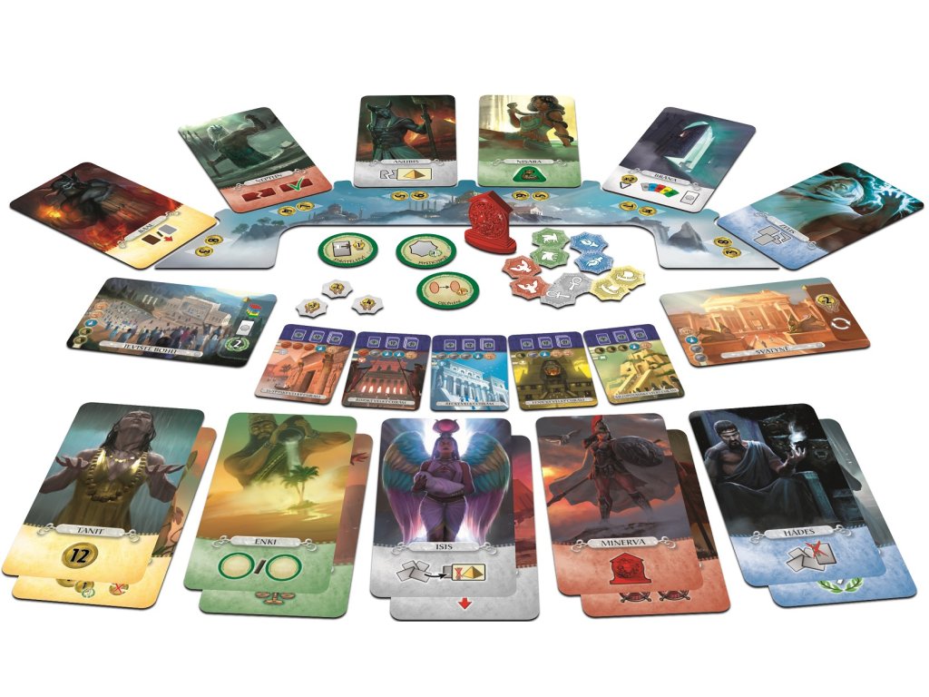 Obsah balení: 1 deska panteonu, 15 karet božstev, 1 karta brány, 5 karet velkého chrámu, 2 karty divů, 10 žetonů mytologie, 3 žetony obětin