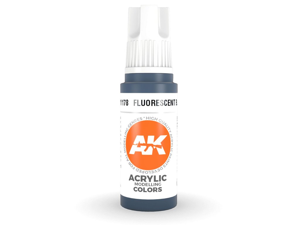 Akrylová barva Fluorescent Blue od výrobce AK Interactive je vhodná pro nanášení štetcem i airbrushem. Akrylové modelářské barvy 3. generace (3Gen) jsou doposud nejpropracovanější recepturou akrylových barev. Barvy General Series mají vynikající krytí, úžasnou přilnavost a nové složení zabraňuje ucpávání trysky bez nutnosti barvy zdlouhavě rozmíchávat.