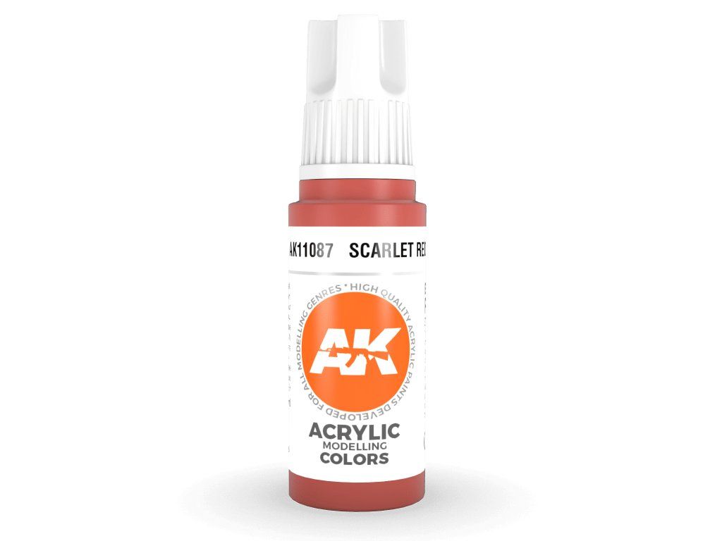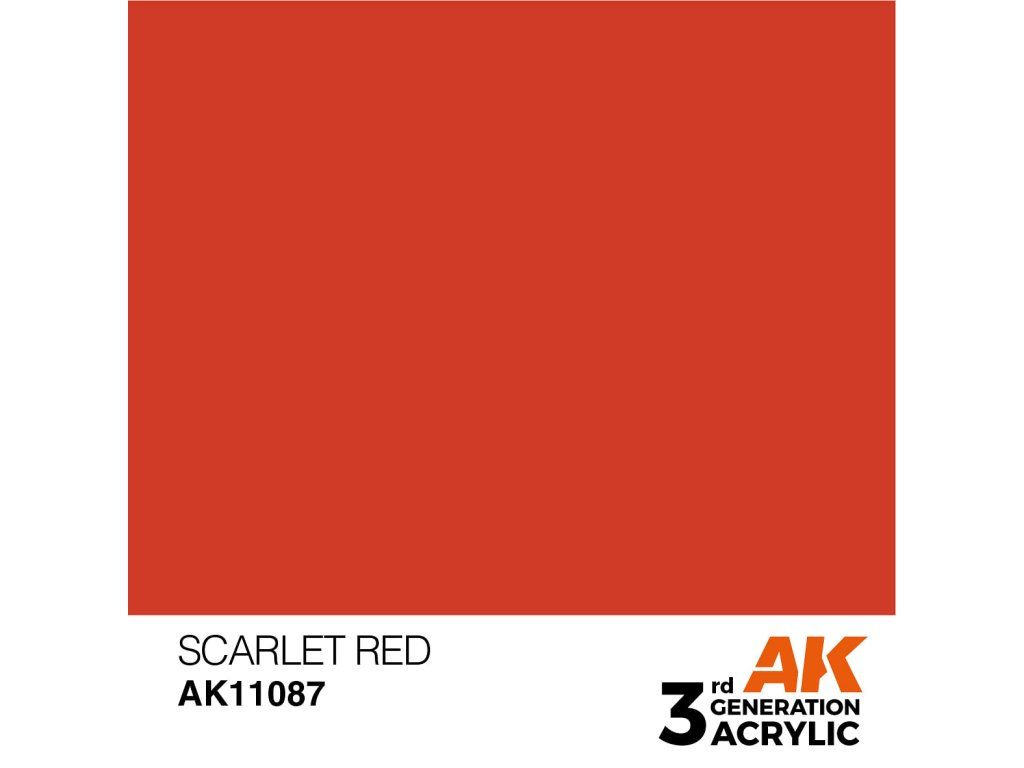 Akrylová barva Scarlet Red od výrobce AK Interactive je vhodná pro nanášení štetcem i airbrushem. Akrylové modelářské barvy 3. generace (3Gen) jsou doposud nejpropracovanější recepturou akrylových barev. Barvy General Series mají vynikající krytí, úžasnou přilnavost a nové složení zabraňuje ucpávání trysky bez nutnosti barvy zdlouhavě rozmíchávat.