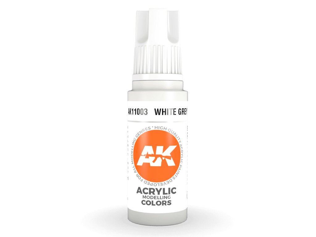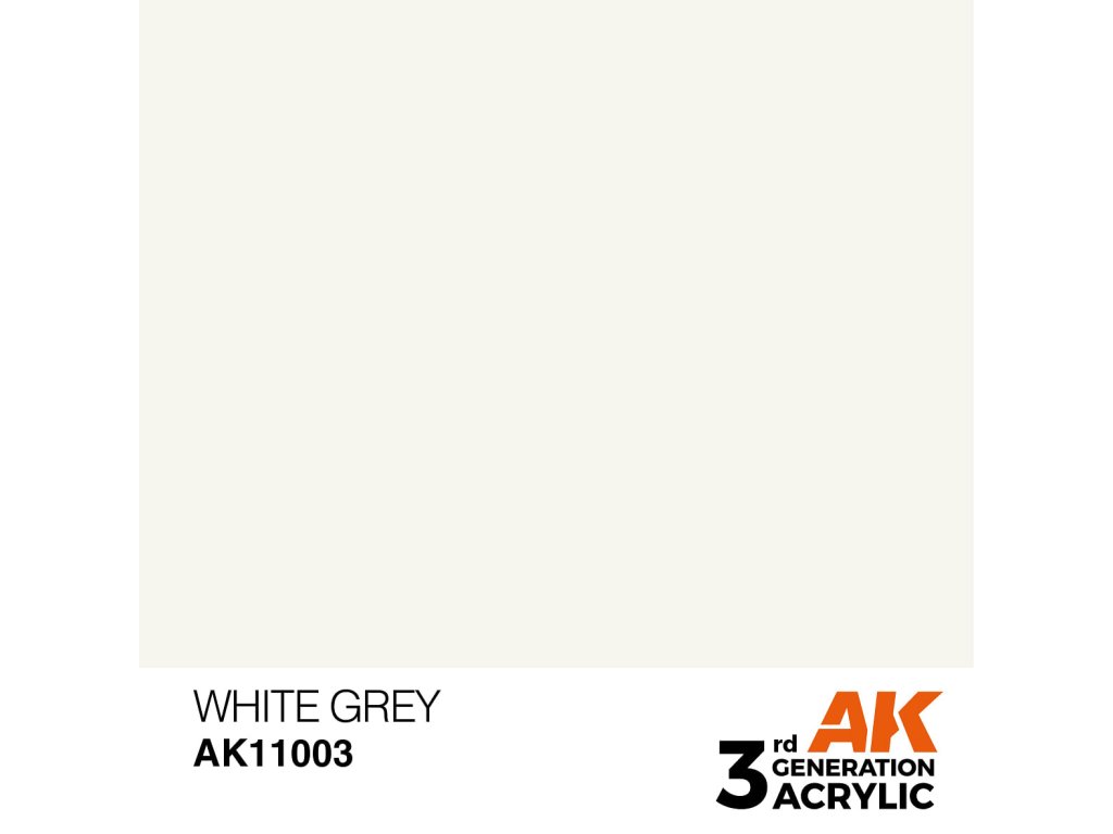 Akrylová barva White Grey od výrobce AK Interactive je vhodná pro nanášení štetcem i airbrushem. Akrylové modelářské barvy 3. generace (3Gen) jsou doposud nejpropracovanější recepturou akrylových barev. Barvy General Series mají vynikající krytí, úžasnou přilnavost a nové složení zabraňuje ucpávání trysky bez nutnosti barvy zdlouhavě rozmíchávat.