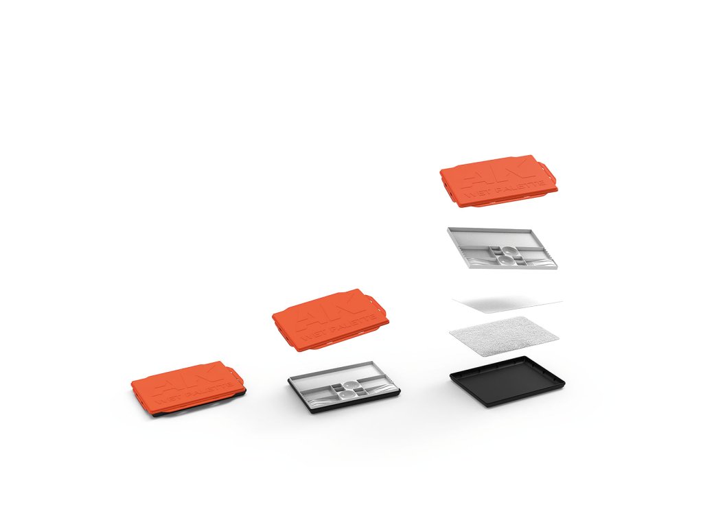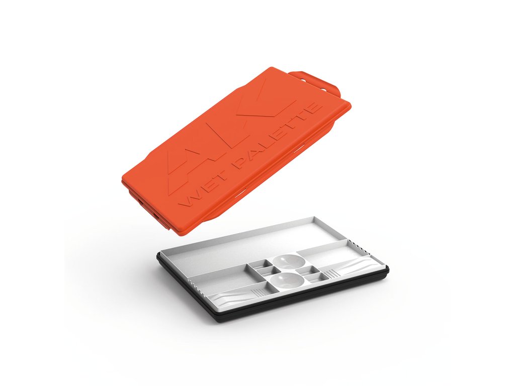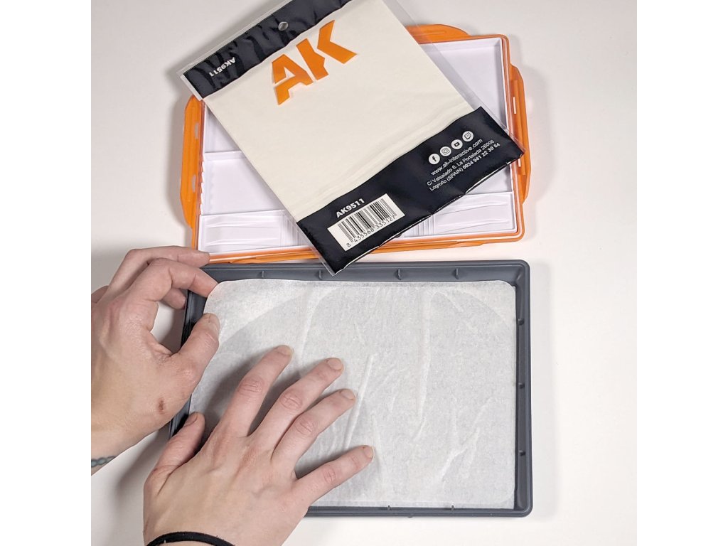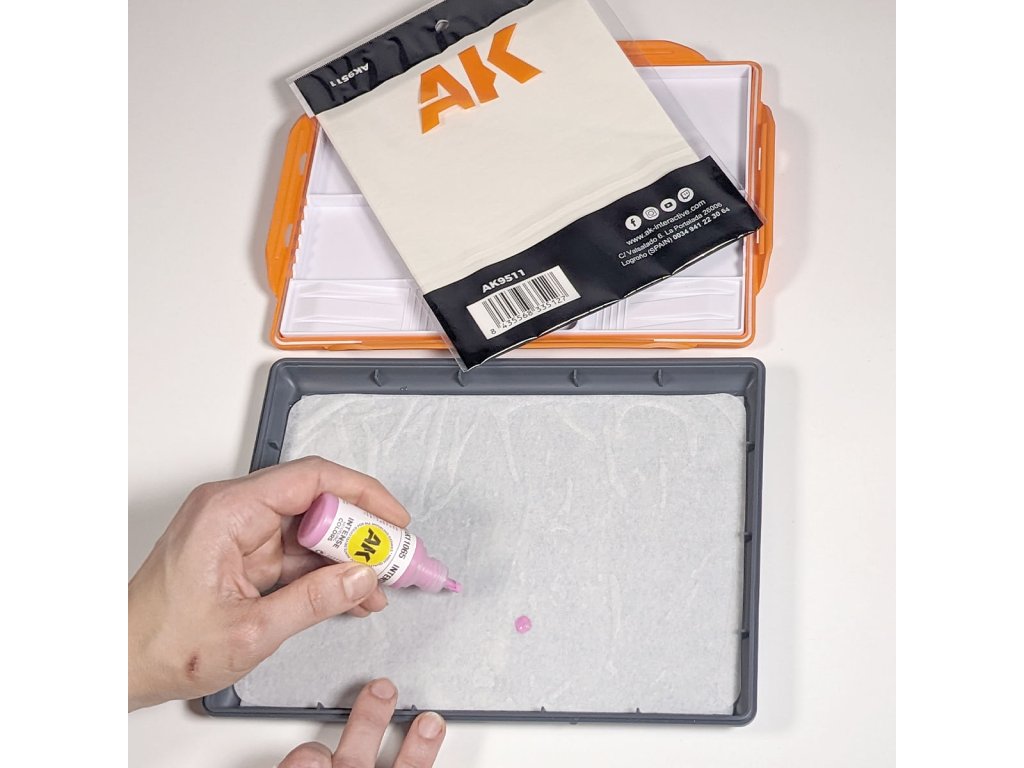 AK Interactive: Wet Palette je ideální velikosti a má vzduchotěsné víko, které uschová tvé barvy po delší dobu. Je vybavena užitečným podnosem s přihrádkami pro míchání barev nebo ukládání příslušenství. Wet Palette se používá především při malování figurek, ale je stále populárnější mezi všemi, kdo pracují s akrylovými barvami. Uchovává barvy čerstvé po celé hodiny a může být uschována v lednici. Obsahuje 40 papírových listů a 2 houbičky. Rozměry: 23,5 x 17,5 x 2,5 cm. Komponenty: Bavlněná látka, která udržuje paletový papír vlhký. Má neutrální bílou barvu, aby neovlivňovala viditelnost barev a usnadnila přesné míchání. Pro správnou funkci je nutné ji udržovat nasycenou vodou. Přírodní produkt bez úprav, aby nedocházelo k reakci s barvami. Speciální vysoce kvalitní vyměnitelný papír (40 g/m²) pro udržení vlhkosti akrylových barev. Obsahuje tenkou silikonovou vrstvu, která umožňuje přenos vlhkosti, ale brání průchodu vody a rozpouštění barev. Praktický podnos pro uložení příslušenství, s těsným uzávěrem.