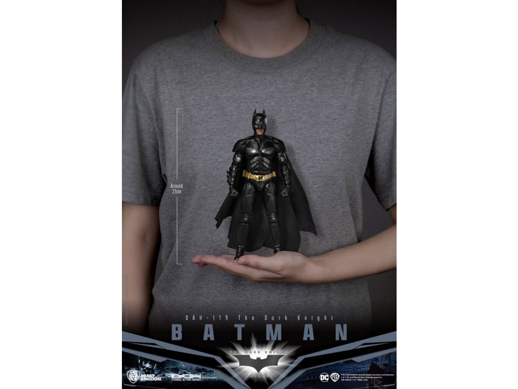 Temný rytíř je u fanoušků Nolana a nadšenců Batmana široce považován za vrchol batmanovských filmů. Toto filmové mistrovské dílo přesahuje typický superhrdinský příběh a zaměřuje se na hluboké emoční břemeno a morální zápasy hrdiny, čímž vytváří hluboké spojení s diváky. Nolanova ztvárnění Batmana dosáhlo ikonického statusu a nabízí bezprecedentní hloubku a rezonanci. Beast Kingdom je hrdý na to, že může odhalit nejnovější prvek ve své uznávané řadě DAH (Dynamic 8ction Heroes) - DAH-119 Batman (The Dark Knight). Tato figura se vyznačuje detailně zpracovaným modelem hlavy, který přesně zachycuje podobu Christiana Bale jako Batmana. Modernizovaný obrněný oblek je věrně znovu vytvořen s pečlivou pozorností k detailům, což zvýrazňuje znak netopýra a definované svalstvo. Klasický černý plášť vyrobený z prémiové látky, zvyšuje rozměrovost figury. Díky více než 22 bodům členění, tato figura umožňuje sběratelům Batmana pózovat v ikonických postojích z filmu, což z ní dělá nezbytný doplněk jakékoliv sbírky.