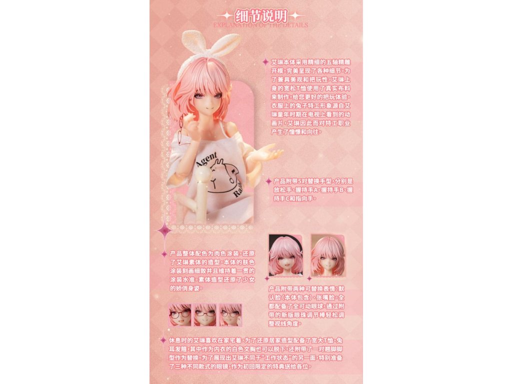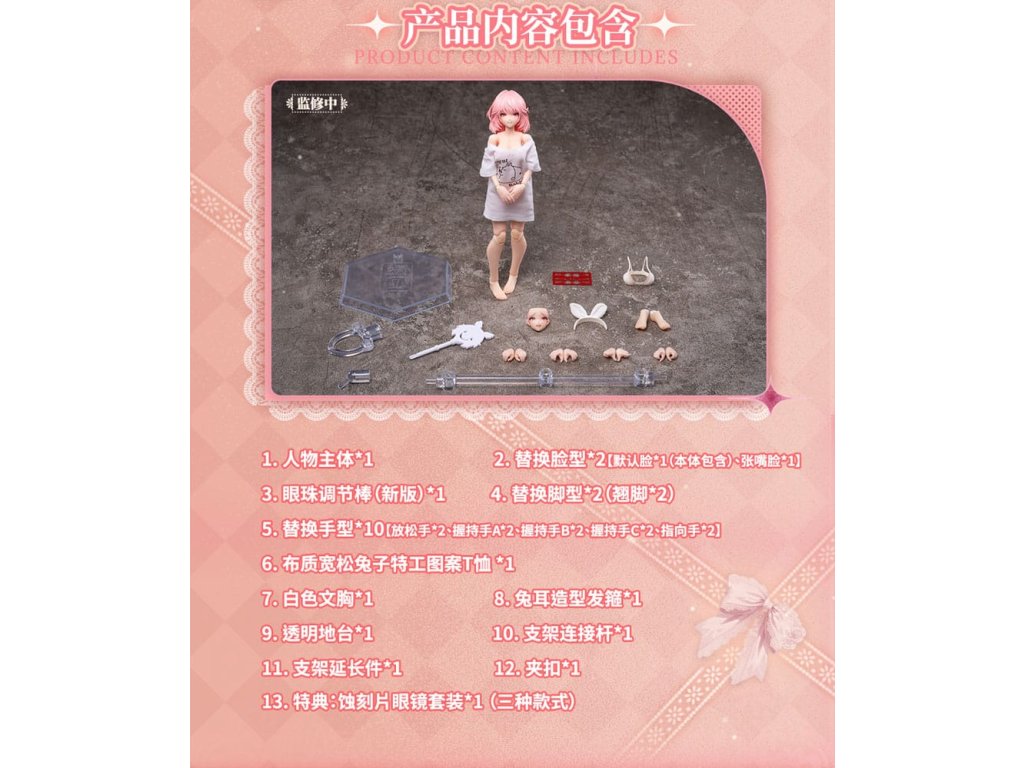 Z řady „Originální postava“ přichází tato úžasná akční figure z PVC. Měří přibližně 16 cm a je dodávána s doplňky v balení s okénkem. Součástí balení: - 1 x tělo figurky - 2 x náhradní části obličeje - 1 x hůlka pro změnu směru očí - 2 x náhradní části nohou - 10 x náhradní části rukou - 1 x tričko - 1 x podprsenka - 1 x pásek do vlasů ve tvaru králičích uší - 1 x průhledná základna - 1 x konektor - 1 x prodlužovací část konektoru - 1 x sponka - 3 x části brýlí z leptaného skla