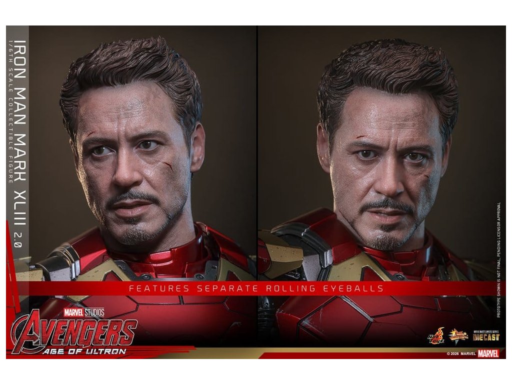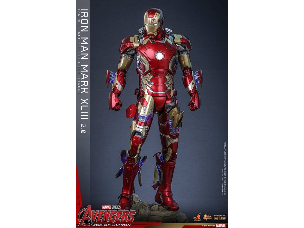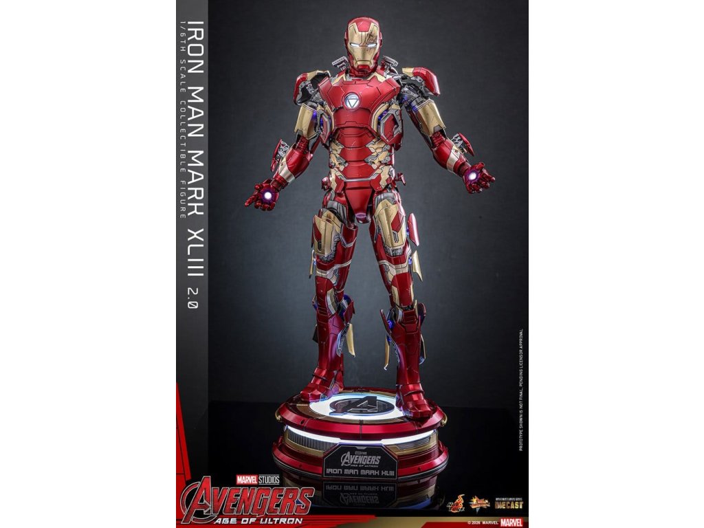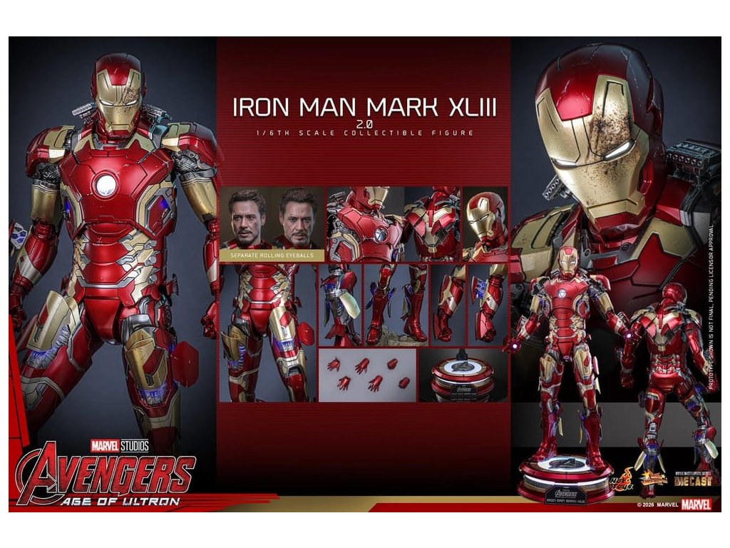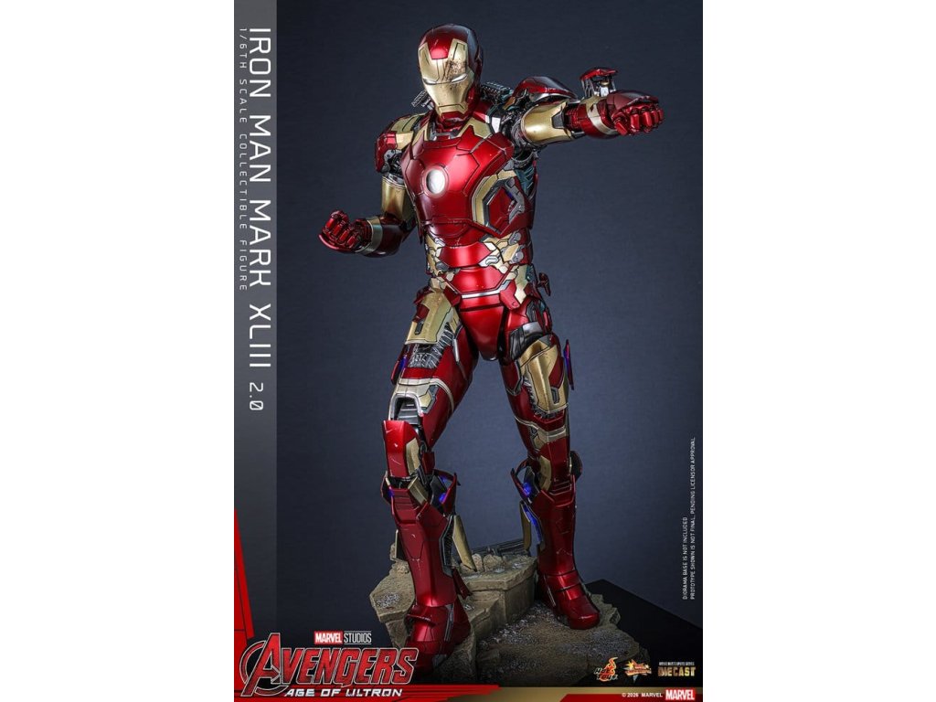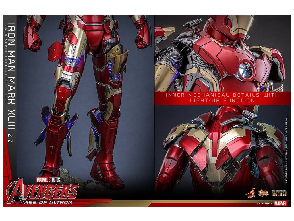 "Ve skutečnosti je šéfem on. Já jen všechno platím a navrhuji, a dělám, že všichni vypadají cool." - Tony StarkBrnění Mark XLIII, které debutuje v akcí nabité úvodní scéně Avengers: Age of Ultron, patří mezi nejikoničtější brnění Tonyho Starka. Je známé svým elegantním designem a návratem klasické červené a zlaté barevné schématy a v tomto filmu hrálo klíčovou roli.Sideshow a Hot Toys s potěšením oficiálně uvádí vysoce očekávanou sběratelskou figuru Iron Man Mark XLIII (2.0) v měřítku 1/6. Tato figura v šesté velikosti byla oživena s neuvěřitelnou pozorností k detailem, představuje přesnou hlavu Tonyho Starka vybavenou oddělenými otáčecími očima a bojem poškozenými malířskými aplikacemi, které přinášejí postavu Roberta Downeyho Jr. do života jako nikdy předtím. Helmetová figurka Iron Mana s funkcí LED osvětlení a dvěma výměnnými obličeji (normální a poškozený v boji) je také součástí balení pro alternativní možnosti zobrazení.Červená, zlatá a stříbrná odlitá brnění s efektem otěru zachycují intenzitu bitvy. LED osvětlené oči, arc reaktor, repulsory a zadní strana svítí bílým světlem, zatímco modré světlo prosvítá stranami hrudníku, předloktí a nohou - napájené systémem, který pohodlně využívá jediný USB-C port pro moderní setup. Mark XLIII (2.0) je vybaven výměnnými částmi brnění, včetně raket magneticky připevnitelných na předloktí a ramenní střely. Figurka Iron Mana odpočívá na speciálně navrženém stojanu s LED osvětlením, na kterém je logo Avengers.Předobjednávejte teď a vylepšete svou sbírku Iron Mana a Avengers touto definitivní verzí Mark XLIII!