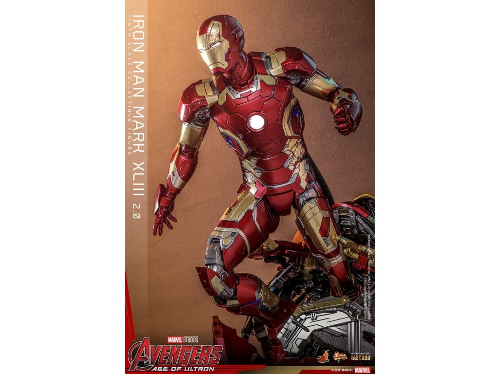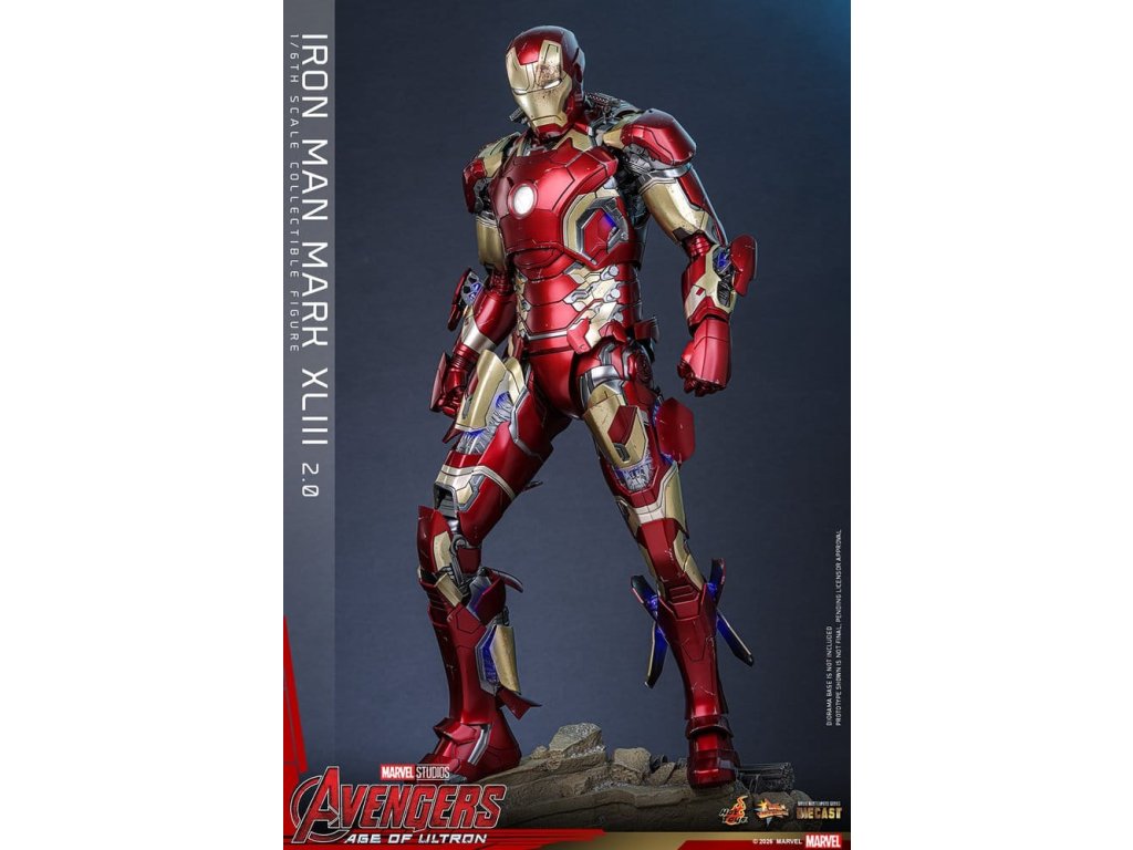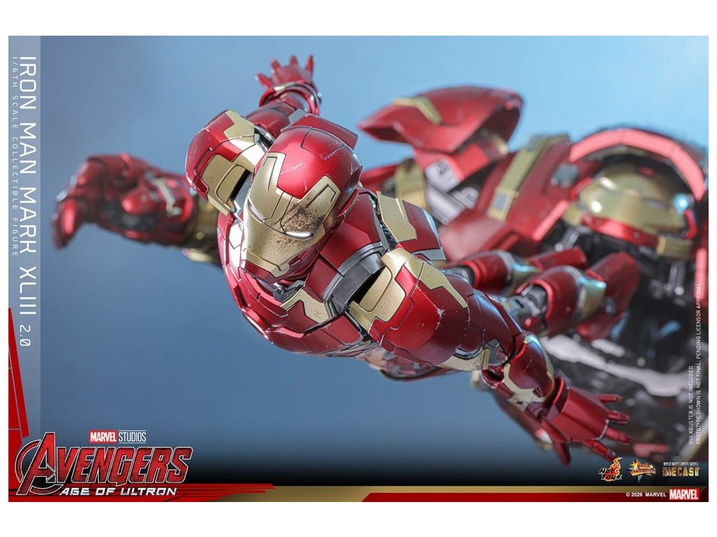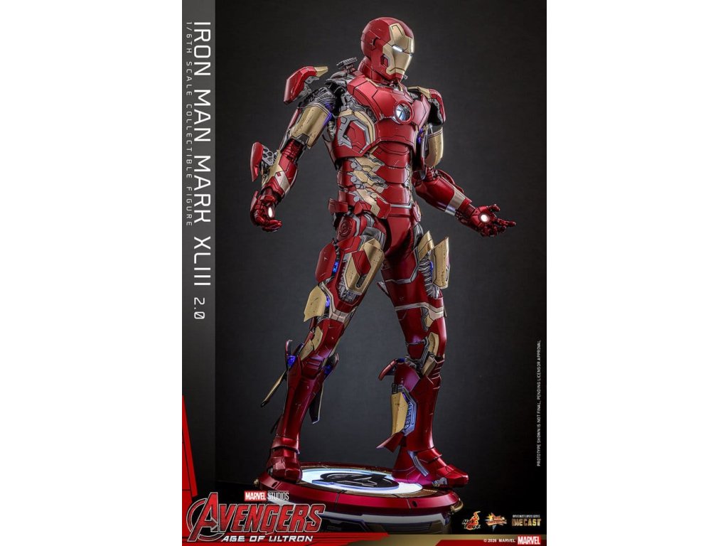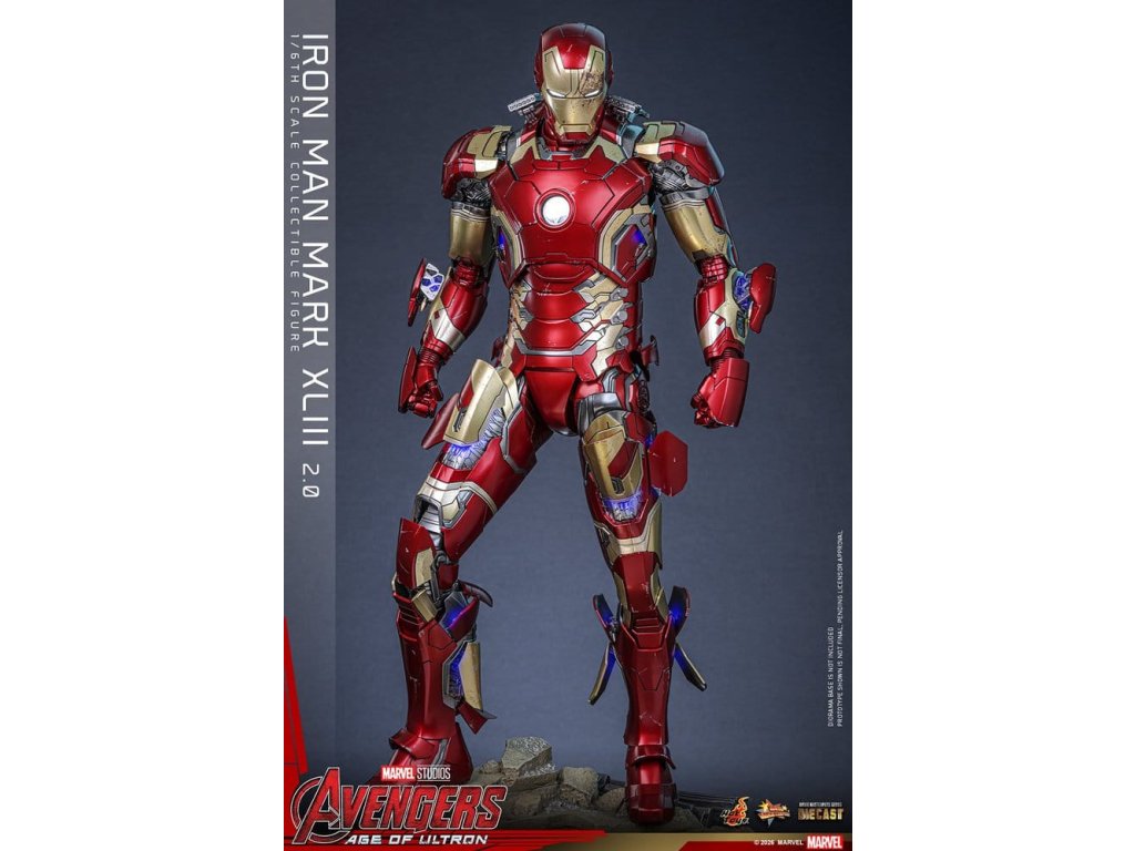 "Ve skutečnosti je šéfem on. Já jen všechno platím a navrhuji, a dělám, že všichni vypadají cool." - Tony StarkBrnění Mark XLIII, které debutuje v akcí nabité úvodní scéně Avengers: Age of Ultron, patří mezi nejikoničtější brnění Tonyho Starka. Je známé svým elegantním designem a návratem klasické červené a zlaté barevné schématy a v tomto filmu hrálo klíčovou roli.Sideshow a Hot Toys s potěšením oficiálně uvádí vysoce očekávanou sběratelskou figuru Iron Man Mark XLIII (2.0) v měřítku 1/6. Tato figura v šesté velikosti byla oživena s neuvěřitelnou pozorností k detailem, představuje přesnou hlavu Tonyho Starka vybavenou oddělenými otáčecími očima a bojem poškozenými malířskými aplikacemi, které přinášejí postavu Roberta Downeyho Jr. do života jako nikdy předtím. Helmetová figurka Iron Mana s funkcí LED osvětlení a dvěma výměnnými obličeji (normální a poškozený v boji) je také součástí balení pro alternativní možnosti zobrazení.Červená, zlatá a stříbrná odlitá brnění s efektem otěru zachycují intenzitu bitvy. LED osvětlené oči, arc reaktor, repulsory a zadní strana svítí bílým světlem, zatímco modré světlo prosvítá stranami hrudníku, předloktí a nohou - napájené systémem, který pohodlně využívá jediný USB-C port pro moderní setup. Mark XLIII (2.0) je vybaven výměnnými částmi brnění, včetně raket magneticky připevnitelných na předloktí a ramenní střely. Figurka Iron Mana odpočívá na speciálně navrženém stojanu s LED osvětlením, na kterém je logo Avengers.Předobjednávejte teď a vylepšete svou sbírku Iron Mana a Avengers touto definitivní verzí Mark XLIII!