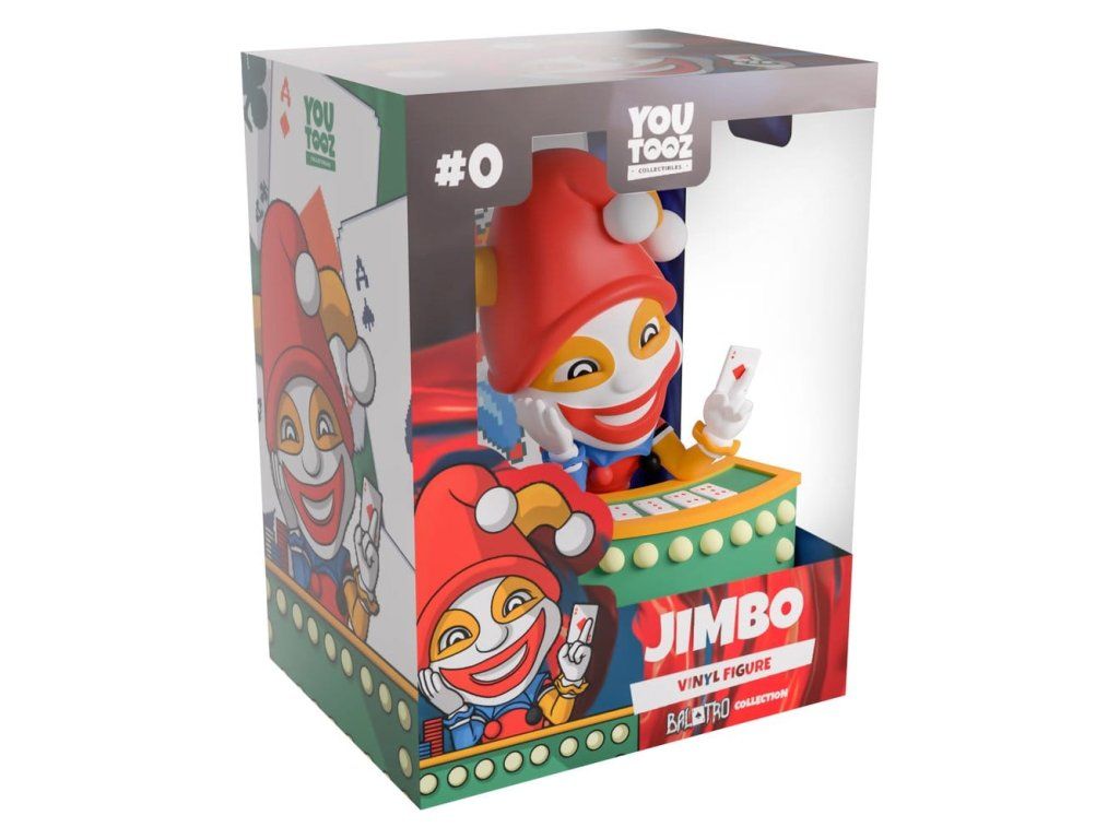 "Máte eso!" Jste připraveni na hru? Jaké máte štěstí?! Jimbo dorazil do Youtooz, aby zjistil, jestli se vám s jeho debutem podaří dosáhnout nového rekordu. Figurka měří 12 cm a sedí za zeleno-žlutým pokerovým stolem, na jehož přední straně probíhají bledá světla; hlavu si opírá o pravou ruku v rukavici a jeho bílá tvář je pokrytá červeným a oranžovým líčením, které ladí s trojcípou šaškovskou čepicí na hlavě. V levé ruce drží eso kárové mezi prsty; má na sobě červeno-modro-oranžovou košili s volánovým límcem, z jehož okrajů visí bambulky, a vícebarevné kalhoty, vedle něj jsou tři hromádky žetonů. Na vnější straně obalu je vyobrazená pokerová ruka plná es s žolíkem uprostřed, zatímco vnitřek je posetý hracími kartami na vířícím modrém pozadí. To pak přechází do sytě červené, která se vlní přes ochranný návlek, přičemž figurka je viditelná skrz velké průhledné okénko na přední straně balení. Tento sběratelský kousek je zasílán v matném, raženém ochranném vnějším návleku a v plastovém krytu na míru pro maximální ochranu během dopravy.