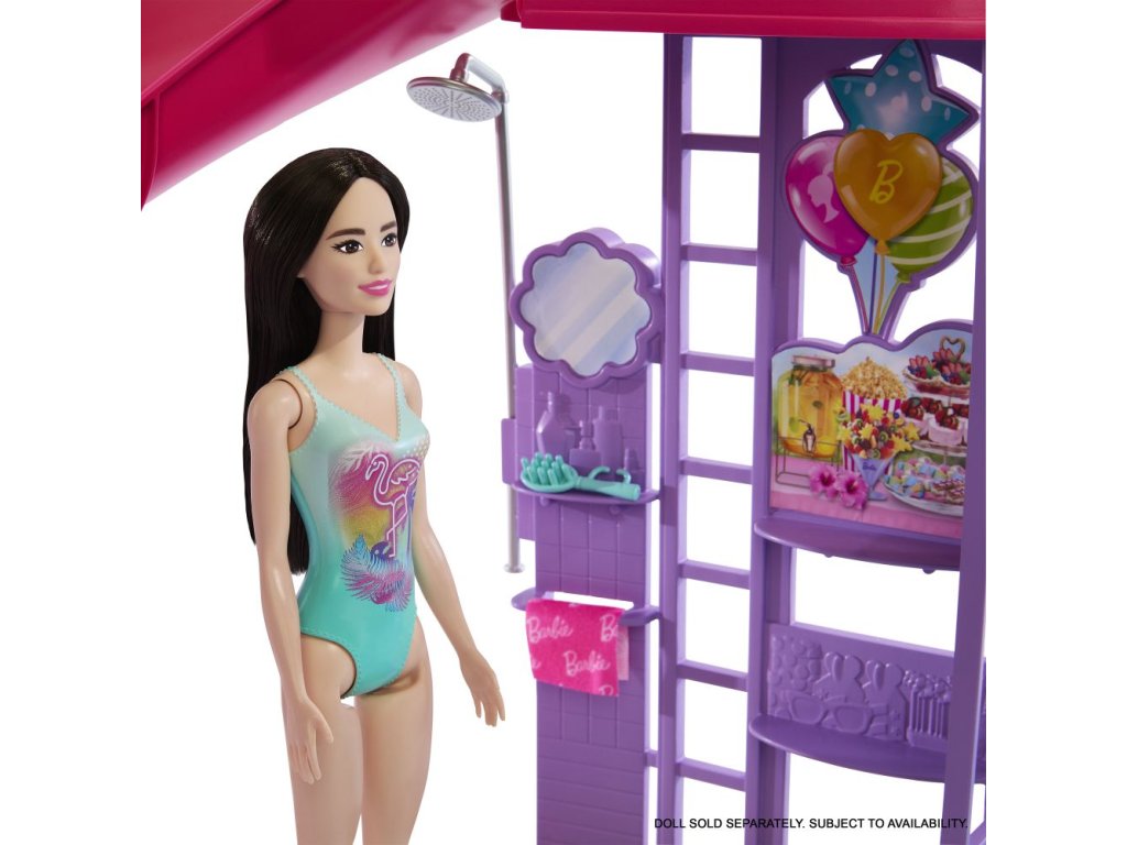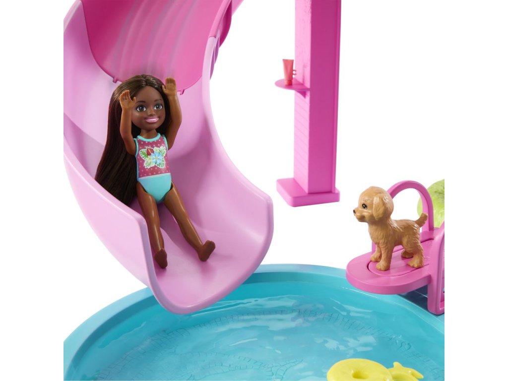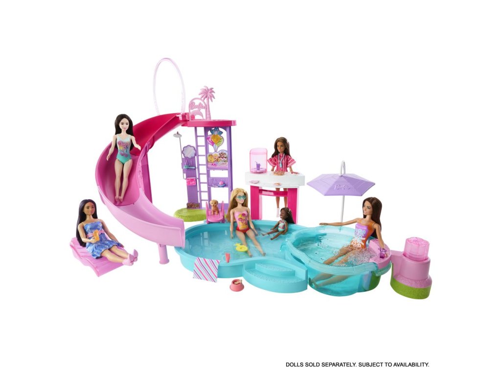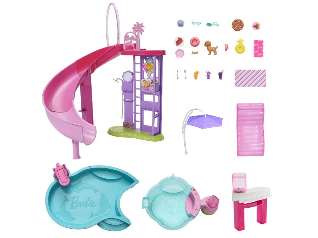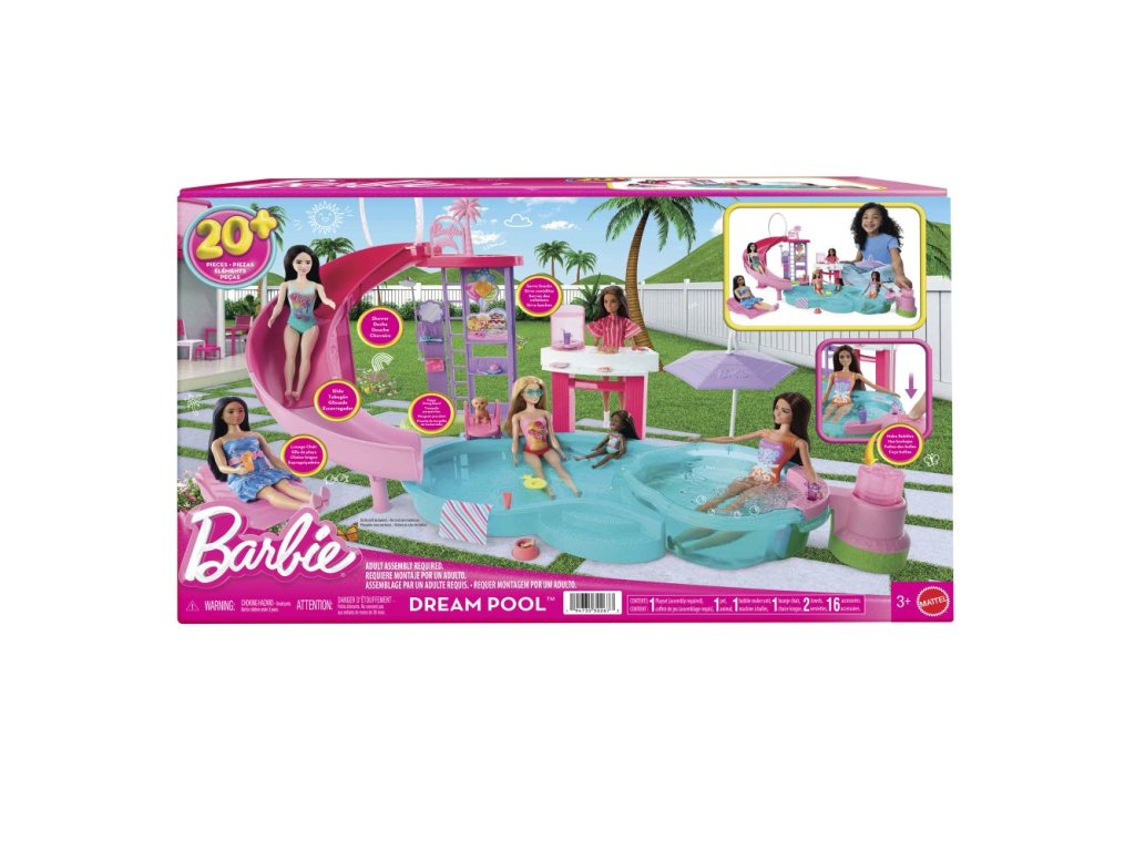 Vítejte u Barbie bazénu snů! Tady je každý den ten nejlepší na koupání! Herní set nabízí šest hracích zón, včetně bazénu, skluzavky, vířivky a snack baru, a více než 20 doplňků. Naplň bazén vodou a uspořádej pořádnou párty! Panenky Barbie (prodávají se samostatně) mohou klouzat po skluzavce do vody, páčkou spustíš bublinky ve vířivce a u snack baru naservíruješ další zábavu. Barvy a vzhled výrobku se mohou lišit.