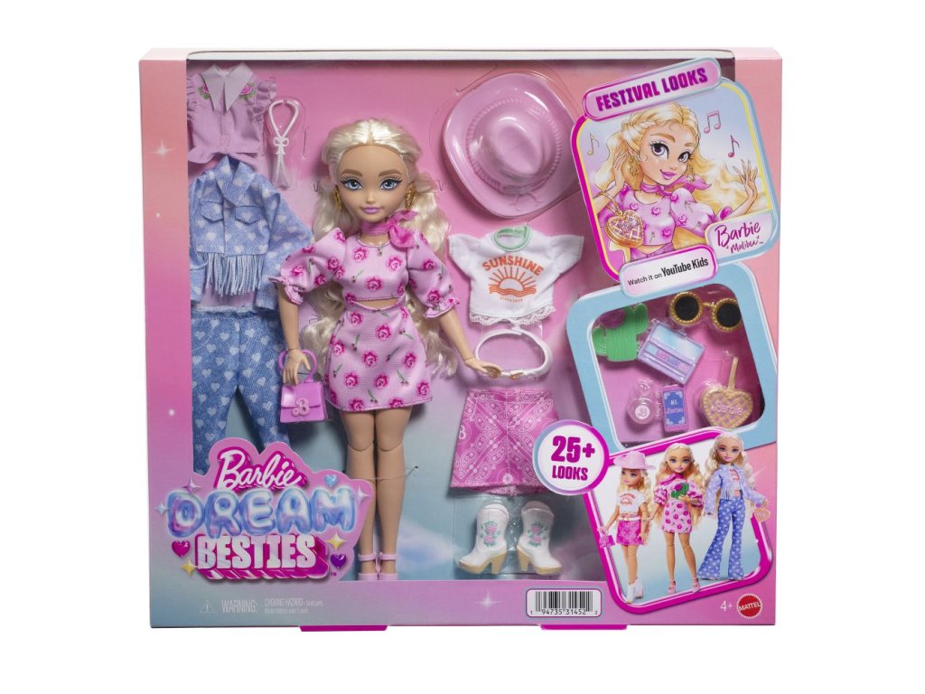 Barbie „Malibu“ si plánuje outfity na svůj oblíbený hudební festival! Set Dream Besties festivalový look povzbuzuje děti, aby pomocí módy vyjadřovaly své pocity a nálady. Pomozte Barbie vybrat ten pravý outfit pro barevný a jedinečný festival – může kombinovat dva topy, růžovou paisley sukni, džínovou bundu s třásněmi s ladícími kalhotami s potiskem srdíček nebo růžové šaty s květinovým vzorem. Díky stylovým doplňkům, jako jsou kovbojský klobouk, paletka make-upu nebo kabelky, může Barbie zazářit v jakémkoli stylu. Má také dlouhé blond vlasy, které jsou ideální pro kreativní účesy.