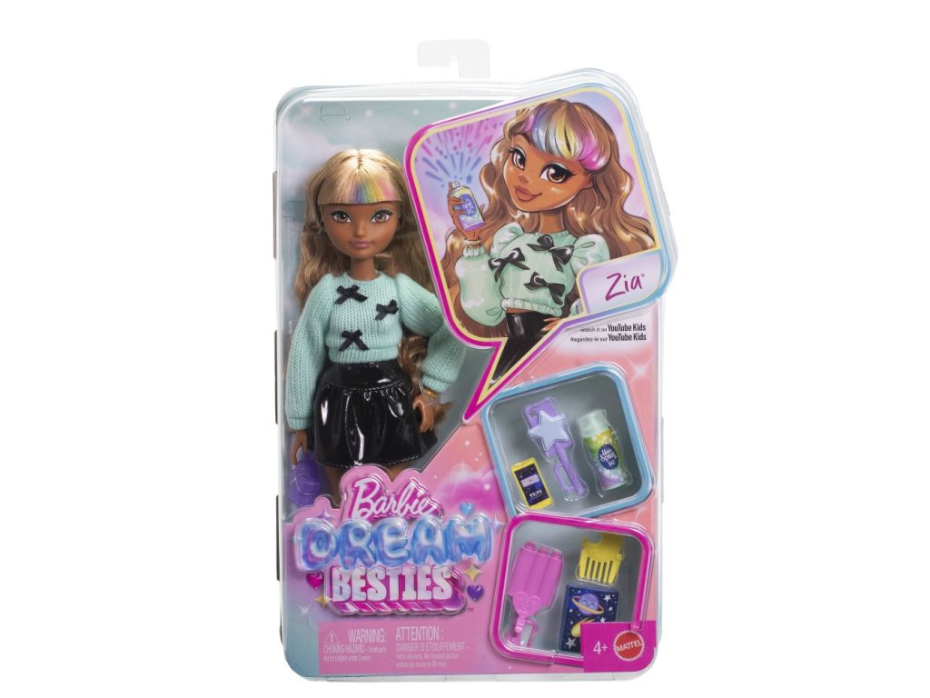 Panenky Barbie Dream Besties povzbuzují děti, aby sdílely své jedinečné nadání se světem – stejně jako Zia. Zia, která se z rivalky stala nejlepší kamarádkou, sní o tom, že se stane uznávanou kadeřnicí. Pomozte jí jít za svým snem se 7 doplňky na téma hairstylingu, mezi které patří hřeben ve tvaru měsíce, lak na vlasy nebo kulma. Tato módní panenka má dlouhé, vlnité hnědé vlasy, ideální pro zábavné česání.