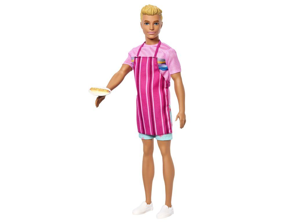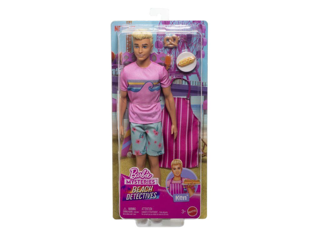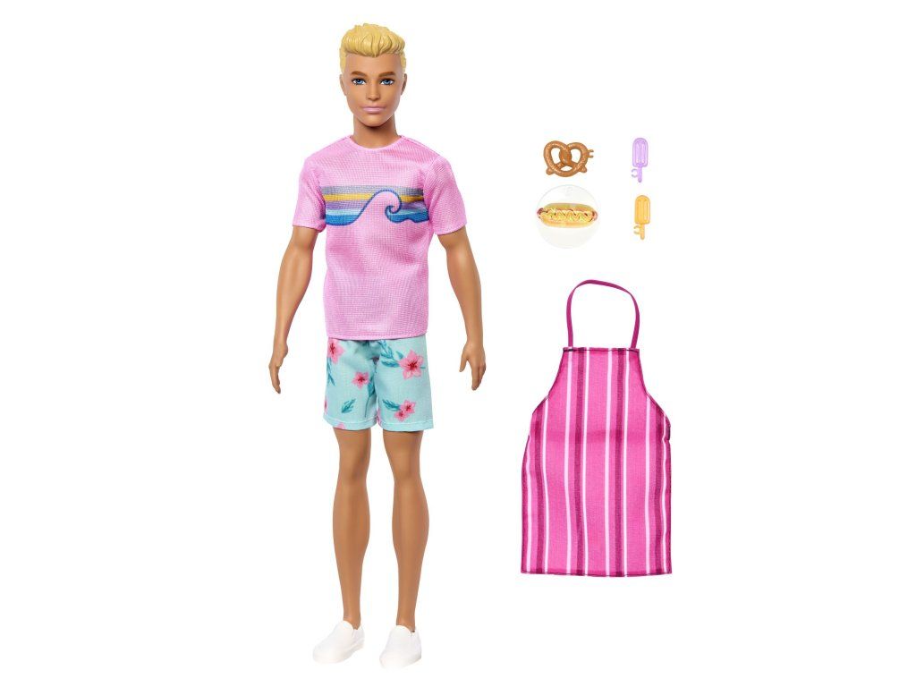 Představivost dokáže vykouzlit nejrůznější příběhy s panenkou Kenem! Tato módní panenka je oblečená do typického růžového trička s potiskem a ležérních kraťasů s květinovým vzorem. Celkový vzhled doplňují bílé tenisky a doplňky, které ještě víc podpoří zábavné vyprávění příběhů! Děti mohou Kena obléknout do přiložené pruhované zástěry a pomoct mu servírovat klasické plážové dobroty – preclík, párek v rohlíku a dvě mražené dobroty. Děti a fanoušci od 3 let si zamilují přehrávání scén i vymýšlení vlastních příběhů z pláže! Panenka neumí samostatně stát. Barvy a vzhled výrobku se mohou lišit.