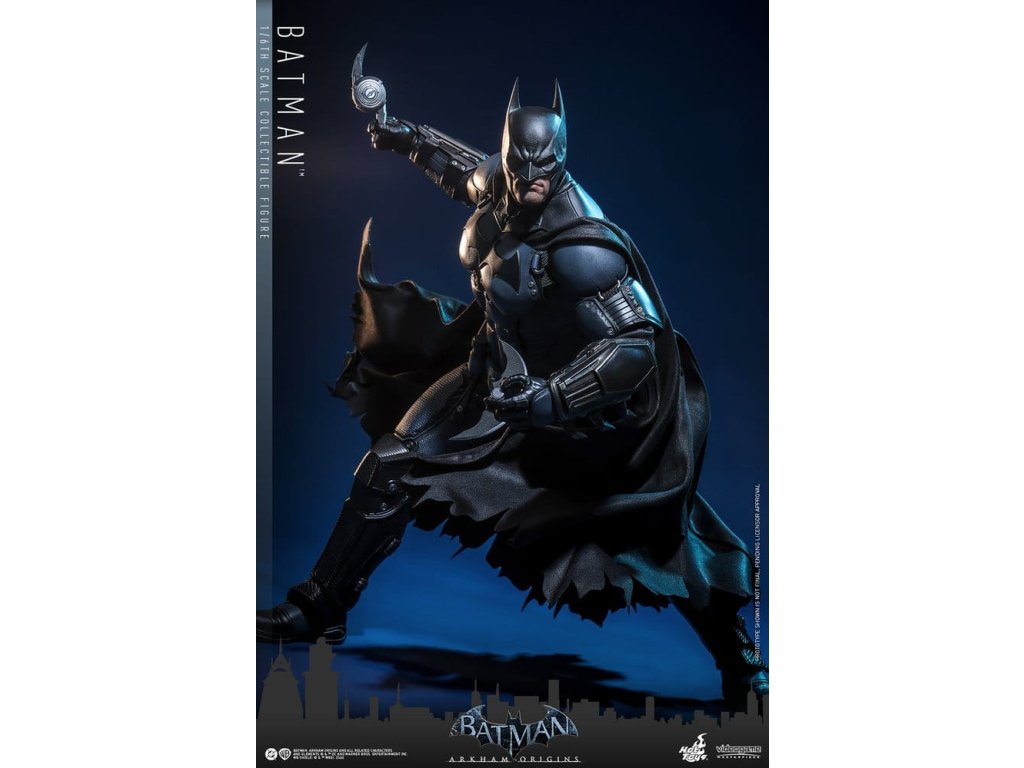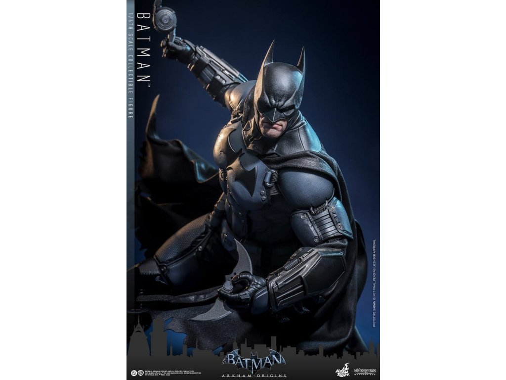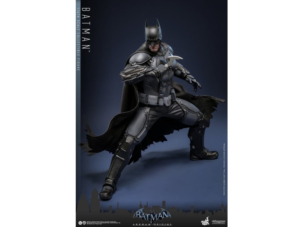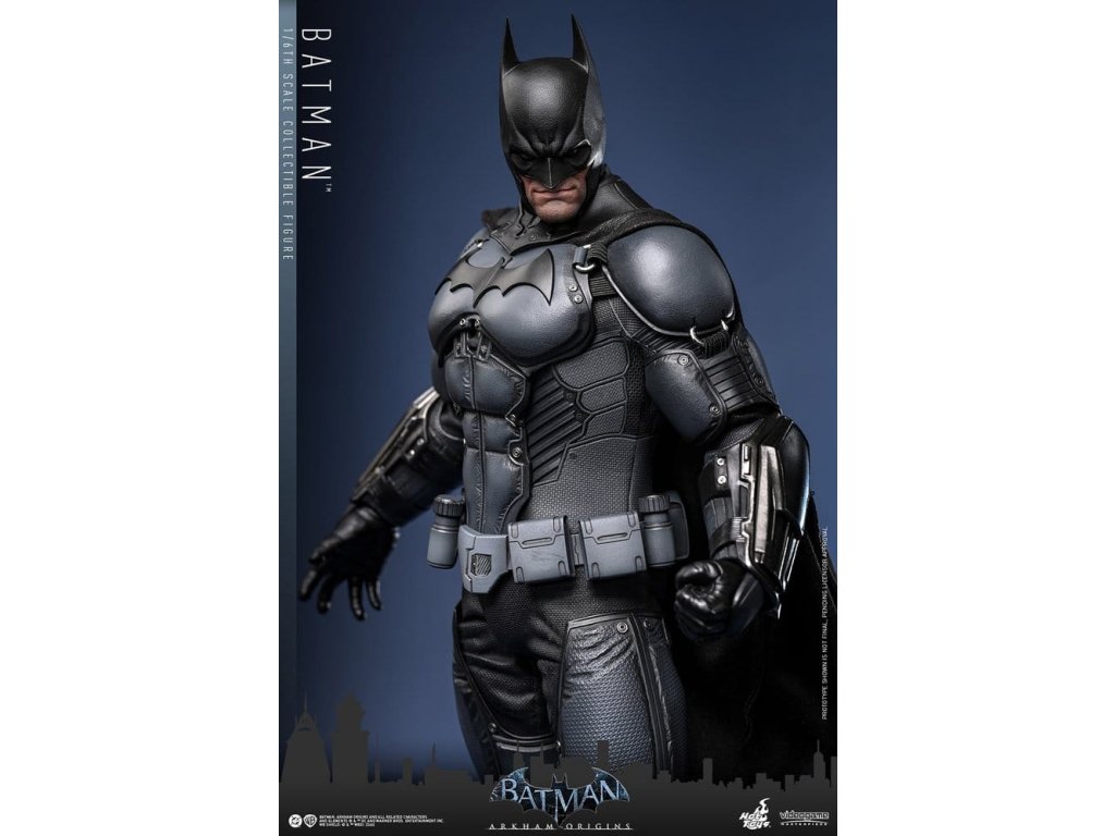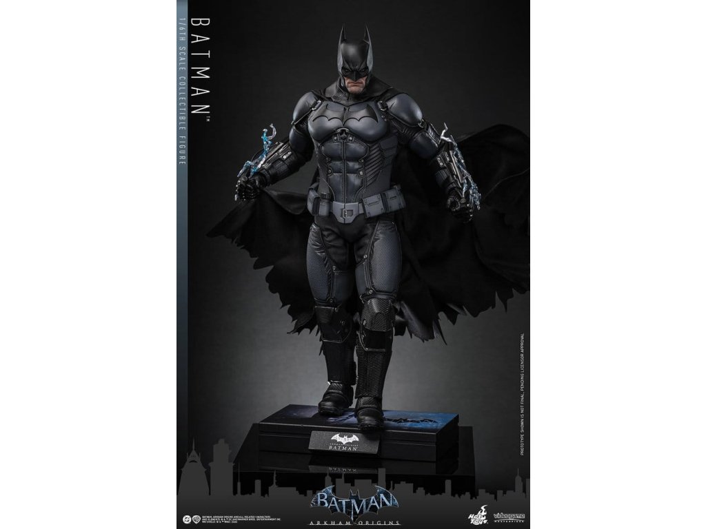 Videohra z roku 2013 Batman: Arkham Origins představuje hráčům prequel příběh odehrávající se několik let před Batman: Arkham Asylum a Batman: Arkham City. V Arkham Origins mladý, syrový a nevybroušený Batman čelí definujícímu momentu ve svém druhém roce jako ochránce Gothamu. Na zasněžený Štědrý den, když na něj Black Mask vypíše odměnu 50 milionů dolarů, se střetává s nejnebezpečnějšími žoldáky světa, včetně Killer Croca, Deathstrok a Bane. Uprostřed zmatků si vybuduje křehkou důvěru s několika členy GCPD a občany Gotham City. Sideshow a Hot Toys jsou hrdí na to, že mohou představit vysoce očekávanou sběratelskou figurku Batman™ v šesté škále z videohry Batman: Arkham Origins. Tato figurka v šesté škále má nově vyvinutou maskovanou hlavu se dvěma vyměnitelnými spodními tvářemi, které ukazují jak jeho zamračený výraz, tak jeho odhodlání a stisknuté zuby. Kostým Batmana je věrně zrekonstruován podle praktického designu hry, který je neforemný a obrněný, a obsahuje nově vyvinutý Batsuit s šedým a černým plně obrněným tělem vrstveným nad základní oblek na svalnatém těle. Pár těžkých rukavic, bot, užitkový opasek a plášť s dráty dokončují jeho oblek. Figurka také obsahuje pár desek s brněním Shock Gloves, které mají průhledné modré bleskové efekty, aby představovaly jejich elektrizovaný dopad. S sedmi výměnnými rukama, včetně pěstí, otevřených rukou a rukou držících zbraně, sběratelé mohou zobrazovat jeho dynamické pózy. Tato figurka DC Comics je vybavena arzenálem zbraní, které odrážejí Batmanovu inovaci v boji a utajení. Součástí je Grapnel Gun, Disruptor, Sonic Batarang, Batarang, Remote Claw, Smoke Pellet a Explosive Gel, které poskytují různé možnosti zobrazení a věrně reprezentují nástroje, které Batman používá v průběhu hry. Prezentace je dokončena speciálně navrženým stojanem na figurku. Tato dlouho očekávaná sběratelská akční figurka přináší původ Temného rytíře do života - nezbytný doplněk pro fanoušky Batman: Arkham Origins a pro každého, kdo oceňuje jemně vyrobené videoherní figurky. Orientační datum vydání: květen 2027