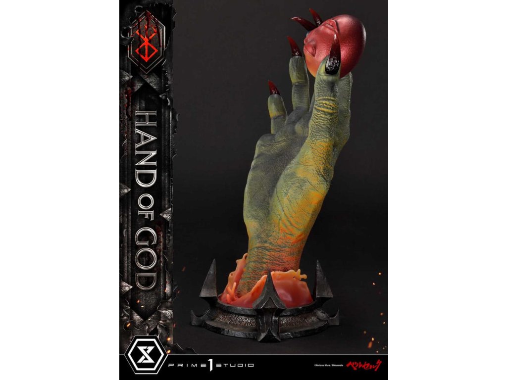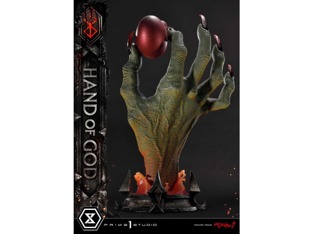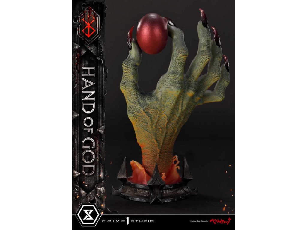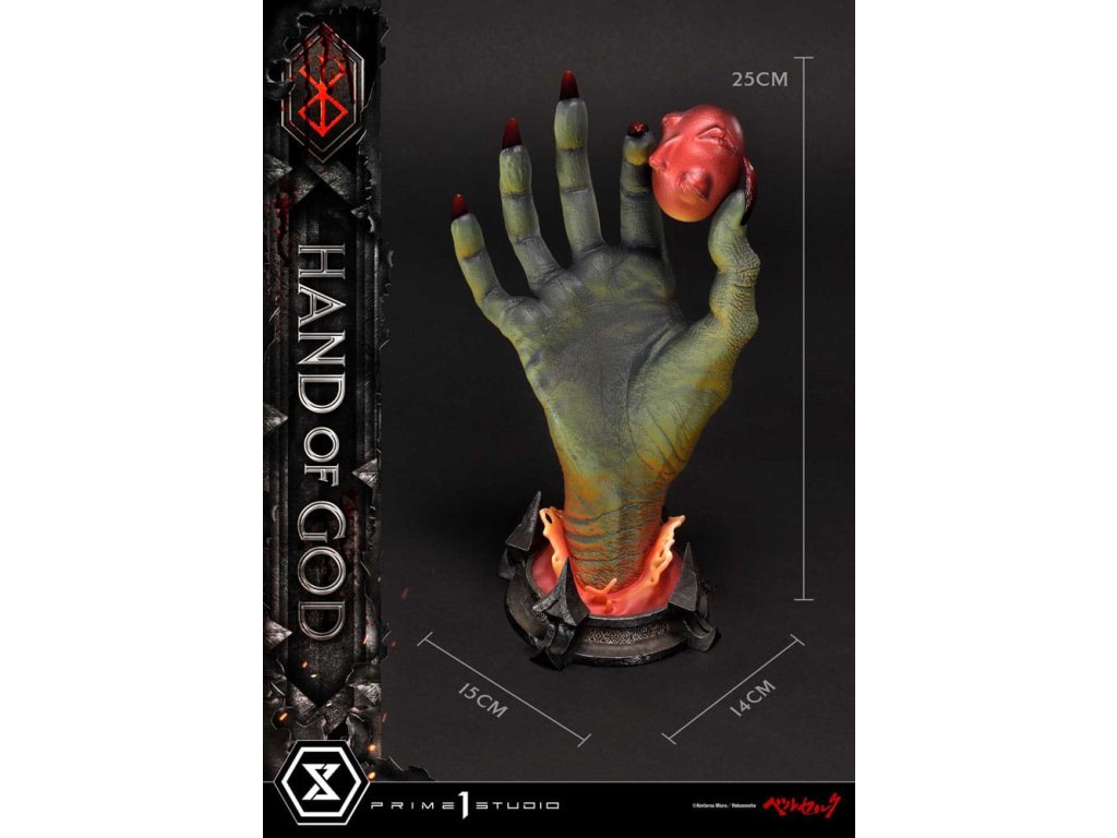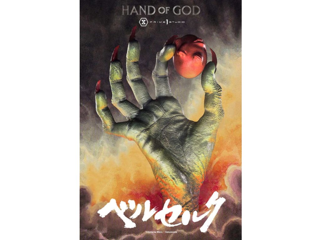 Existuje nějaký druh transcendentálního "Zákona" nebo "Ruky Boží", který určuje lidský osud v tomto světě? Prime 1 Studio je hrdé na prezentaci nejnovějšího přírůstku do série soch Berserk: Životní velikosti Ruka Boží z Berserku! Založeno přímo na revolučním umění Sensei Kentaro Miura přichází Ruka Boží. Držící rudý Behelit (také známý jako "Vejce Dobyvatele") Ruka Boží soudí neschopnost lidstva ovládat i svou vlastní vůli. Umělci Prime 1 Studio, s naprostou úctou k zesnulému Sensei Miura, věnovali čas a péči k výrobě hodného doplňku k zbytku úžasné řady soch Berserk. Přímo z mangy, téměř 25cm vysoká Ruka Boží prorazí vzhůru z primitivního bláta, s rudým Behelitem v palci a ukazováčku. Realistická, kovaná železná základna je minimální a dobře ladí s tématem Berserk. "Specifikace: - Založeno na umění Sensei Kentaro Miura". Orientační datum vydání: duben 2026
