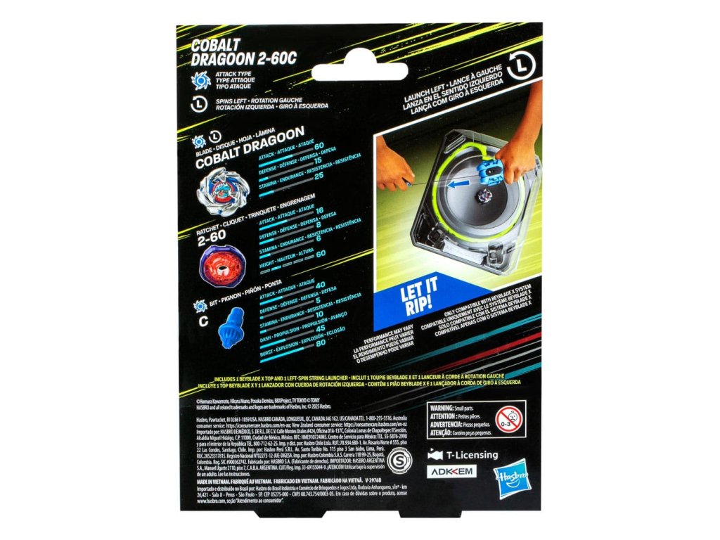 Zažijte vzrušení z další generace vrcholků Beyblade, Beyblade X. Set s levotočivým odpalovačem Cobalt Dragoon 2-60C vám pomůže ve vašem hledání Beymastery. Deluxe levotočivý odpalovač a útočný typ levotočivého vrcholu Cobalt Dragoon 2-60C fungují se systémem X-Celerator Gear, abyste vylepšili svou hru a dokázali to v bitvě! Když ozubené kolo vrcholu zasáhne X-Celerator Rail v Beyblade X Beystadium (prodává se odděleně), může se super-urychlit do Xtreme Dash, raketuje po aréně a vyvolává devastující kolize a epické výbuchy. Tahem lanka odpalovače uvolněte Cobalt Dragoon 2-60C v šílenství zuřivosti. Bladers odpali svůj vrchol proti vrcholu soupeře, přičemž s každým střetem získávají body - první, kdo získá 4 body, vyhrává. Můžete kombinovat vyměnitelný břit, ratchet a bit s těmi od ostatních Beyblade X vrcholků (prodávají se samostatně), abyste vytvořili svůj vlastní nepřekonatelný Bey. Hračky Hasbro Beyblade s autentickými vrcholky Takara Tomy z odlitého kovu jsou skvělé dárky pro chlapce a dívky od 8 let.