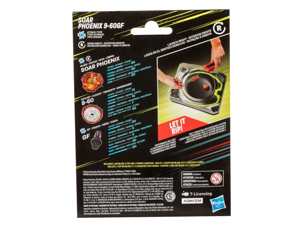 Zažijte vzrušení z nové generace vrcholků Beyblade, Beyblade X. Sada Beyblade X Soar Phoenix Deluxe se spouštěcím zařízením na šňůru vám pomůže v hledání mistrovství Bey. Deluxe spouštěcí zařízení na šňůru a útočný vrchol Soar Phoenix 9-60GF s pravým otáčením fungují s X-Celerator Gear Systemem, aby vám pomohli vylepšit svou hru a prokázat to v bitvě! Když se ozubení vrcholu spojí s X-Celerator Rail of a Beyblade X Beystadiumem (prodává se samostatně), může se superrychlostně dostat do Xtreme Dash, což ho raketa kolem arény pro drtivé kolize a epické výbuchy. Natáhněte šňůru na svém spouštěcím zařízení, abyste uvolnili Soar Phoenix 9-60GF v zuřivém vzteku. Bladers vypustí svůj vrchol proti soupeřovu a skórují body za každou konfrontaci - první, kdo dosáhne 4 body, vyhrává. Smíchejte a kombinujte výměnné čepele, ratchet a bit s vrstvami ostatních vrcholů Beyblade X (prodávají se samostatně), abyste vytvořili své vlastní nepřekonatelné Bey. Hračky Hasbro Beyblade s originálními odlévanými kovovými vrcholy Takara Tomy jsou skvělými dary pro děti pro chlapce a dívky od 8 let a více.