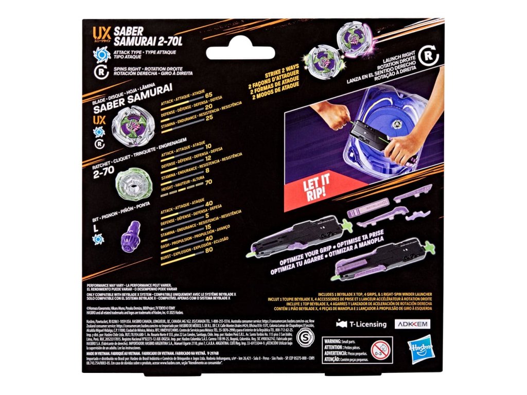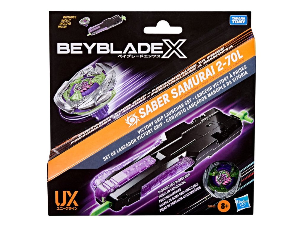 Zažijte Beyblade X, další generaci stadionů Beyblade, spouštěčů a vrcholů! Sada Victory Grip Launcher zahrnuje pravotočivý spouštěč s 25 cm natáhnutelným šňůrou a přizpůsobitelnými gumovými držadly. Je vybaven vrcholkem Saber Samurai 2-70L Right-Spin Attack Type, který pracuje se systémem X-Celerator Gear, abyste mohli posunout hru na vyšší úroveň a dokázat to v bitvě! Když se ozubené kolo vrcholu zapojí do kolejí X-Celerator Rail stadionu Beyblade X Beystadium (prodává se samostatně), může se super-zrychlit do Xtreme Dash po celé aréně pro drtivé srážky a epické výbuchy. Hráči vypouštějí svůj vrchol proti vrcholu svého soupeře a sbírají body - první s 4 body vyhrává. Smíchejte a kombinujte vyměnitelné čepele, ratsche a bit s těmi z jiných vrcholků Beyblade X (prodávají se samostatně) a vytvořte svůj vlastní nepřekonatelný Bey. Hračky Hasbro Beyblade s autentickými vrcholy z kovového odlitku Takara Tomy jsou skvělé dárky pro chlapce i dívky od 8 let a výše.