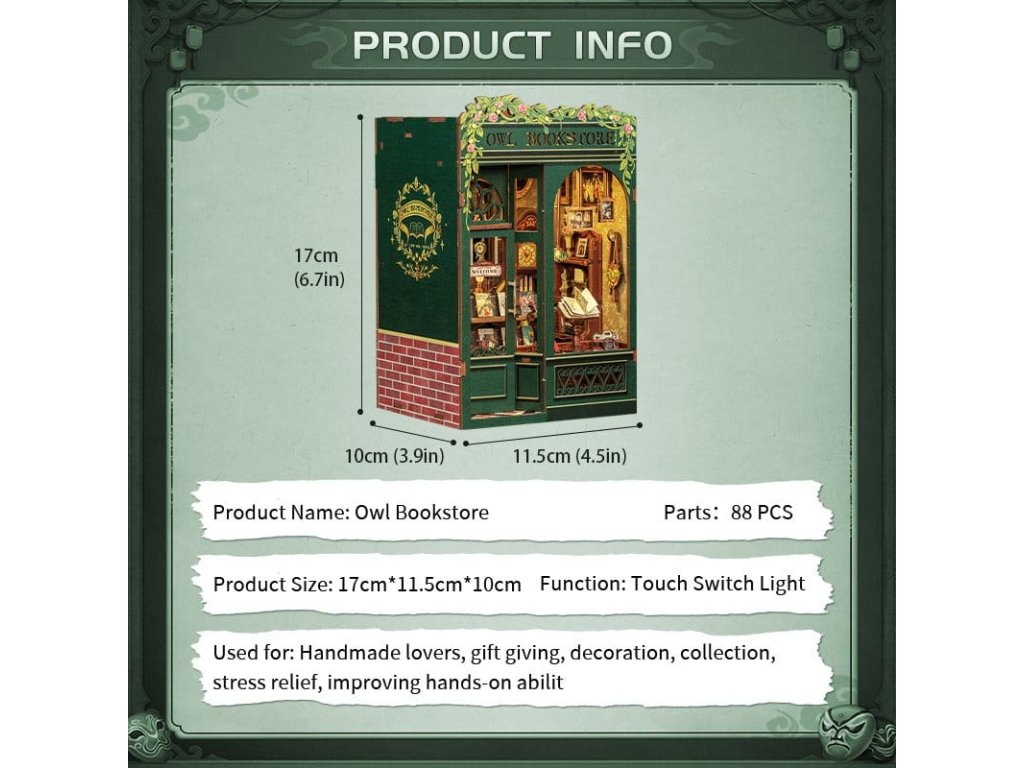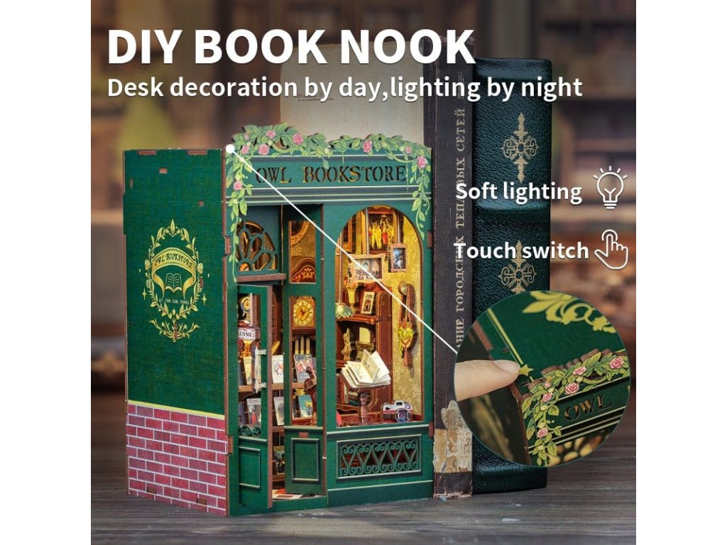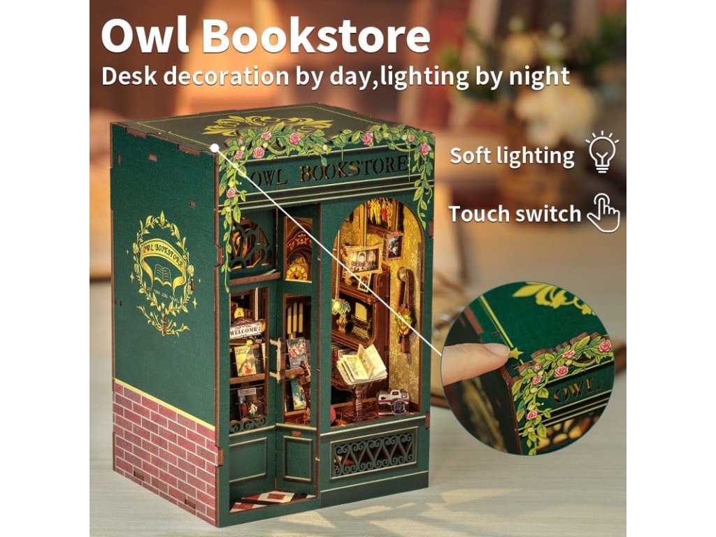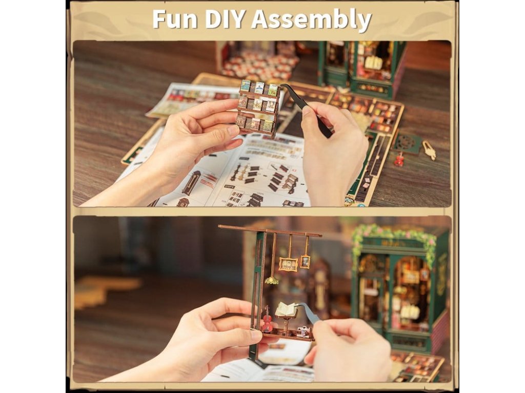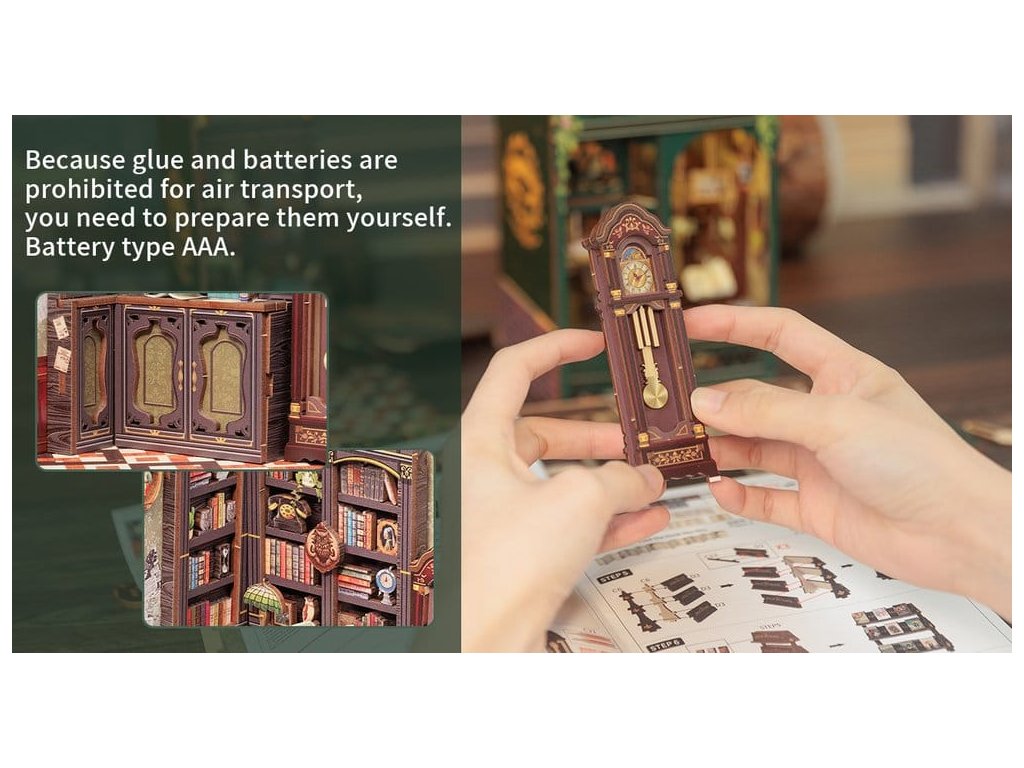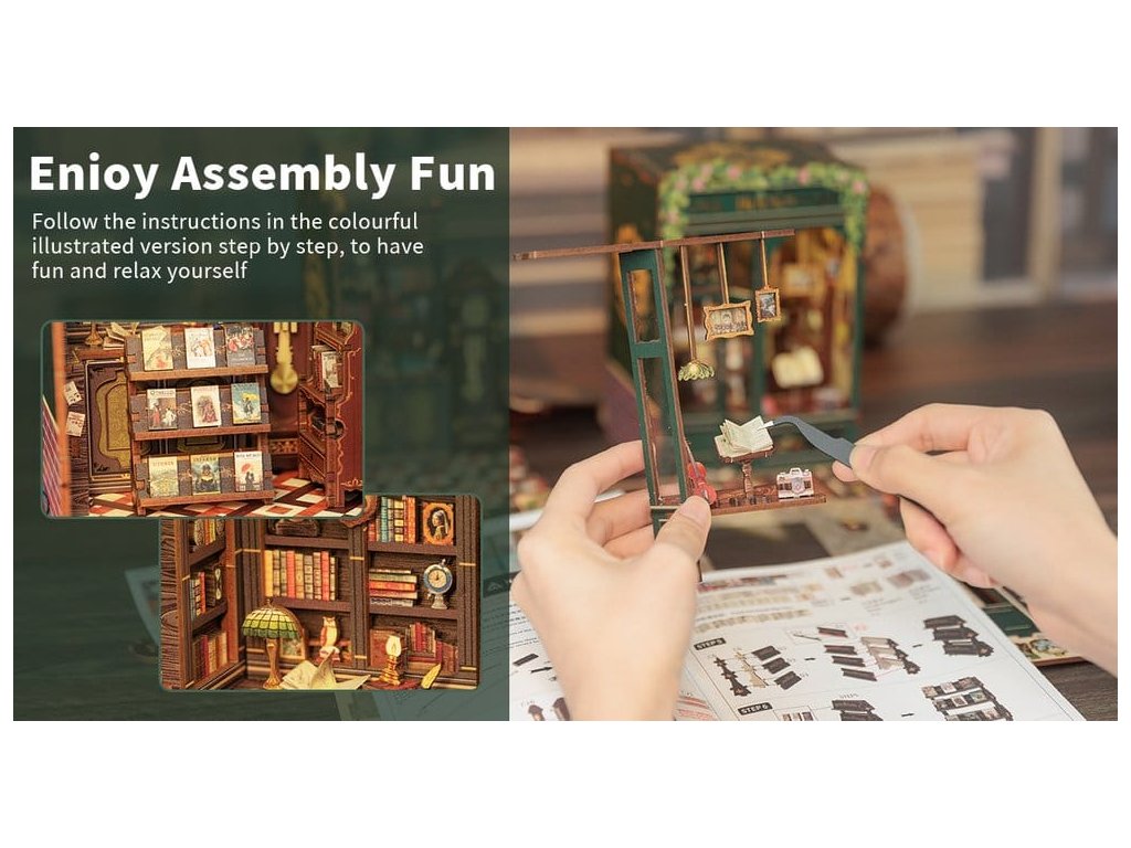 Tvořivý únik mezi vašimi knihami - Knihkupecké Koutky CuteBee. Knihkupecké Koutky CuteBee jsou více než dekorativní kousky do regálu - jsou to poutavé tvořivé zážitky pro děti, rodiny a dospělé, doporučené pro věk 12 let a více. Jako detailní 3D dřevěné puzzle nabízejí klidný, soustředěný stavební proces, který povzbuzuje k odpočinku bez obrazovky a redukuje stres. Každý model následuje jasnou a logickou strukturu s lehce srozumitelnými pokyny, čímž vytváří rychlé momenty úspěchu během stavby. Rovnováha mezi zapojením do stavby a krásným finálním výsledkem přináší hluboký pocit uspokojení a relaxace. Ideální pro fanoušky LEGO, konstrukčních kostek, modelů a japonských stavebnic. Dřevěné dílce řezané laserem poskytují prémiový pocit s přesnými spoji, čistými hranami a vysoce kvalitním povrchem. Díky systému Easy-Snap lze většinu prvků sestavit s minimem lepidla, což zjednodušuje proces pro začátečníky, je to čisté a reverzibilní. S širokou škálou témat včetně fantasy, středověkých světů, magie, asijsky inspirovaných scén a útulných prostředí, poskytují Knihkupecké Koutky CuteBee silnou sběratelskou a prodejní hodnotu - rozhodně to není jednorázová nákupní položka. Poznámka: Baterie a dřevěné lepidlo nejsou součástí balení.