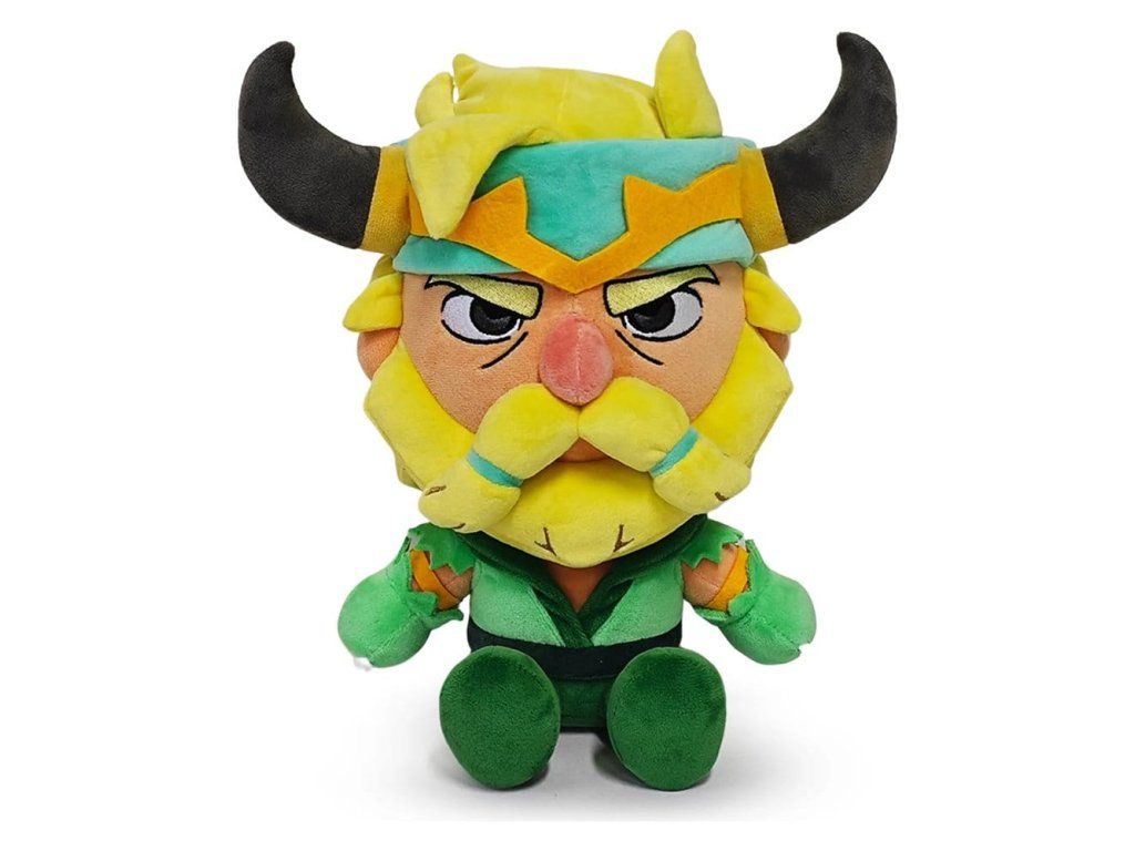 Sedí ve výšce 22 cm, s vážnými šedými očima vyhlížejícími z přísného obličeje pokrytého hustým knírem a špičatým vousem. Modro-zlatá čelenka obepíná jeho blond vlasy a z obou stran z ní vyrůstají dva dlouhé špičaté rohy. Zelené tričko se otevírá do širokého límce přes ramena a má roztrhané rukávy ladící s jeho ostnitými rukavicemi; tmavé kalhoty přecházejí v odpovídající boty a na kolenou jsou malé emblémy. Tento plyšák je vycpaný až po okraj 100% polypropylenovou výplní (PP), je vyroben z minky a materiálu s dlouhým vlasem a doplněn detaily z filcu — naprosto ideální k mazlení i do soubojů!