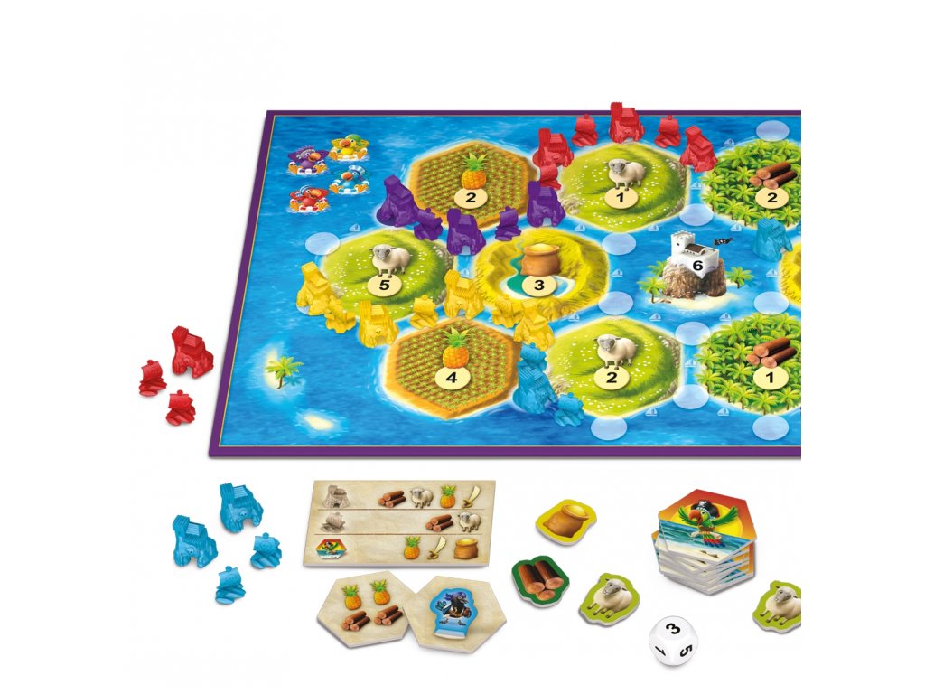 Hra obsahuje: herní plán, 28 lodí, 28 doupat, 90 žetonů zásob, 16 kartiček s papouškem, 4 přehledové karty, kostku a pravidla. Autor hry: Klaus Teuber