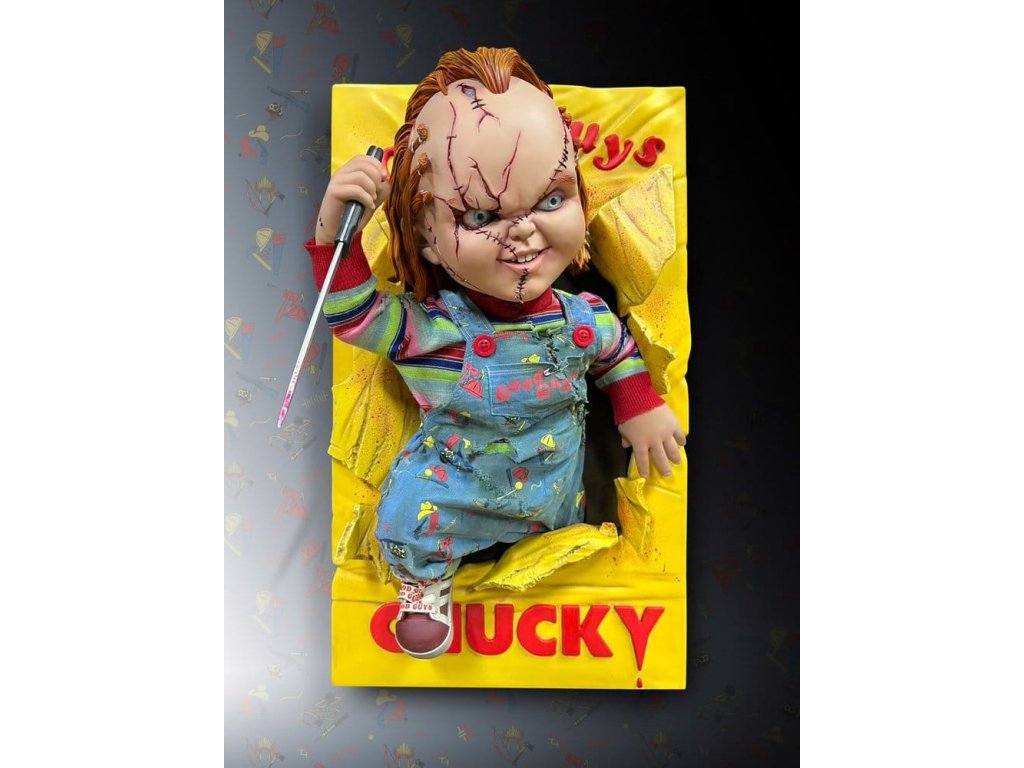 Je zpět! Ale tentokrát přichází přímo z vaší zdi! K dispozici v životní velikosti i v poloviční velikosti, tato sochařské nástěnné umění z Nevěsty Chuckyho zachycuje vražednou panenku v jejím největším nepořádku, prudce vystřelující z jeho ikonické krabice 'Dobří kluci', nůž v ruce, uprostřed šílenství. Chucky je zmrzlý uprostřed úniku, probíjí se skrze plně sochařsky vypracovanou, roztrhanou krabici přidávající hloubku a vynucenou perspektivu scéně. Výsledek je působivá iluze, že se násilně probíjí do vaší místnosti, místo toho, aby byl v ní vystaven. Socha vlastní obrazově přesné, na míru ušité látkové oblečení a akrylové oči s vysokým leskem, které mu dodávají znepokojivý, živý pohled. Každá jizva a steh byly pečlivě vysochařeny a oživeny pomocí vrstvení odstínů barvy, čímž vznikl bohatě detailní povrch, který předává hloubku, texturu a realismus bez přehánění. Limitovaná edice 500 kusů!