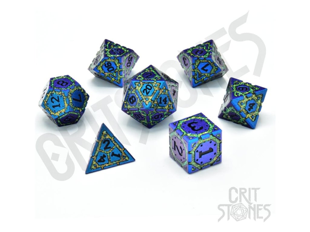 Tyto kostky jsou vyrobené z pevného kovu. Jsou těžké, opravdu těžké! Dobře se drží v ruce a mají dlouhý a uspokojující rolovací pohyb. Vyrobena z prémiové slitiny hliníku a zinku, tyto kostky jsou vyrobeny tak, aby vydržely. Kovová konstrukce zaručuje odolnost a uspokojivou váhu v ruce. Tato sada obsahuje všechny standardní mnohostěnné kostky - d4, d6, d8, d10, d12, d20 a procentuální kostka (d10 označená desítkami). Obsahuje: 7 kostek.