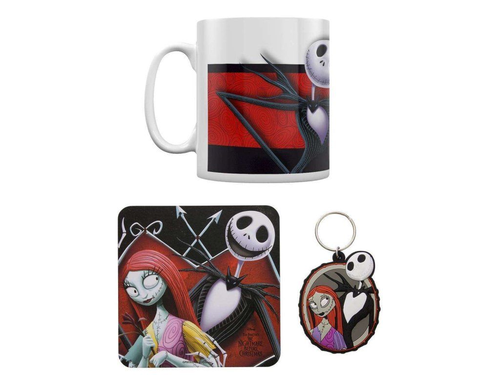Dárková sada pro fanoušky animovaného filmu Ukradené Vánoce (The Nightmare Before Christmas) od Tima Burtona obsahuje pěkný keramický hrnek, podtácek a klíčenku.
