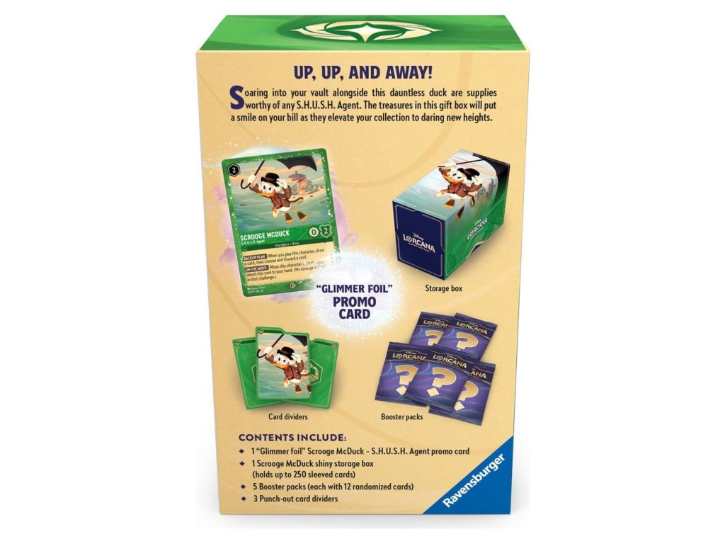 Obsah: 5 booster balíčků, 1 promo karta 'Glimmer Foil' Scrooge McDuck - agent S.H.U.S.H., 1 úložná krabička Scrooge McDuck (pojme až 250 rukávů na karty), 3 vyřazovací oddělovače karet. Orientační datum vydání: březen 2026