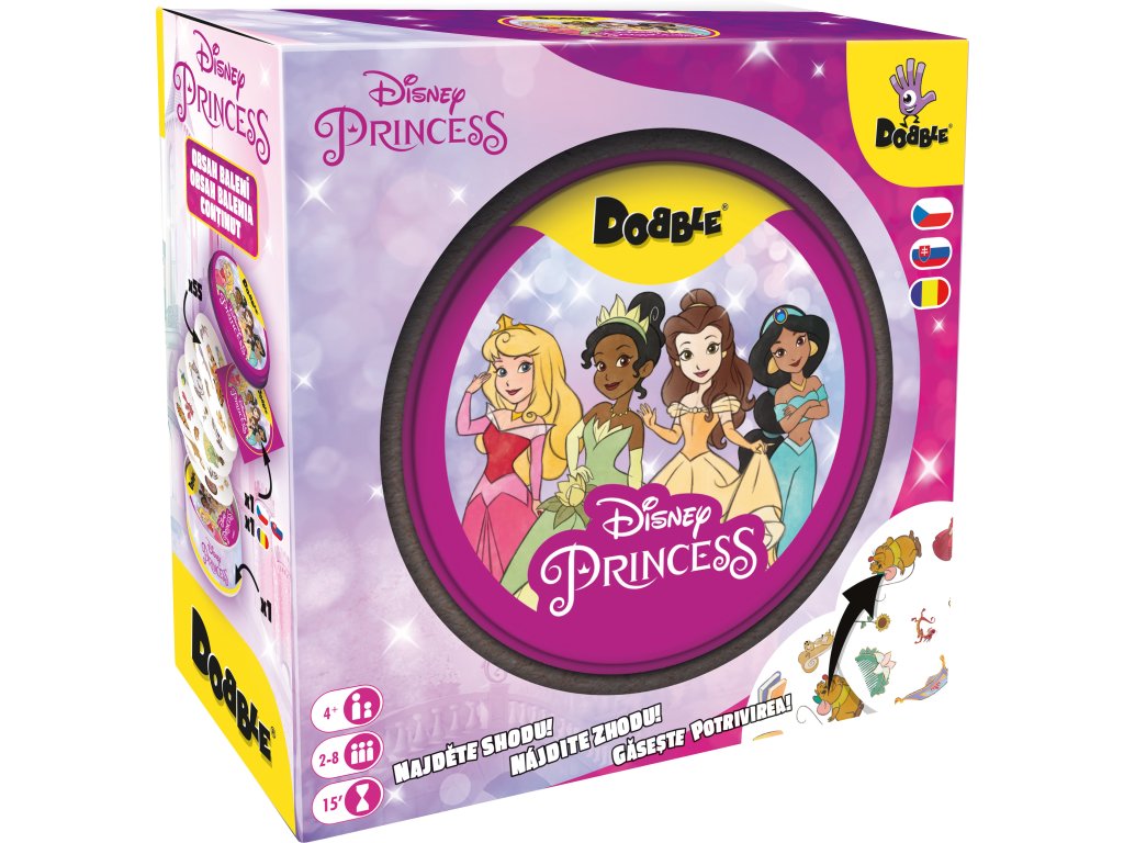 Rychlost, postřeh, reflexy! Dobble Disney princezny, to je 57 různých symbolů, 55 karet, 8 obrázků na kartě a každé dvě karty spolu mají společný jen jeden obrázek!