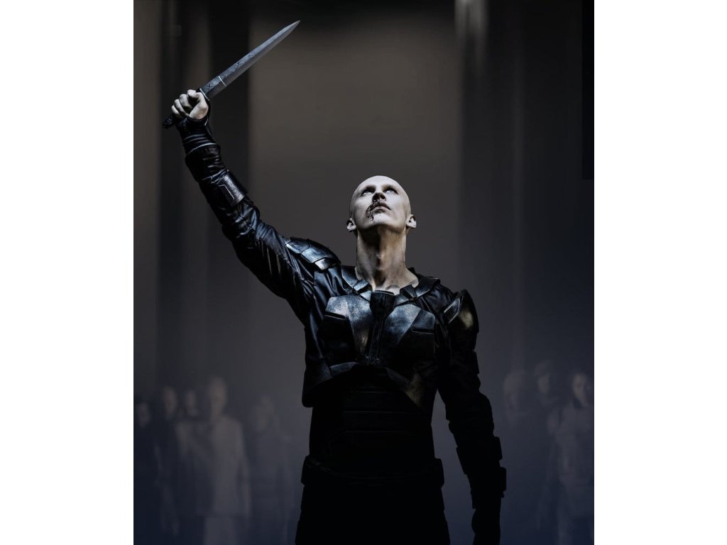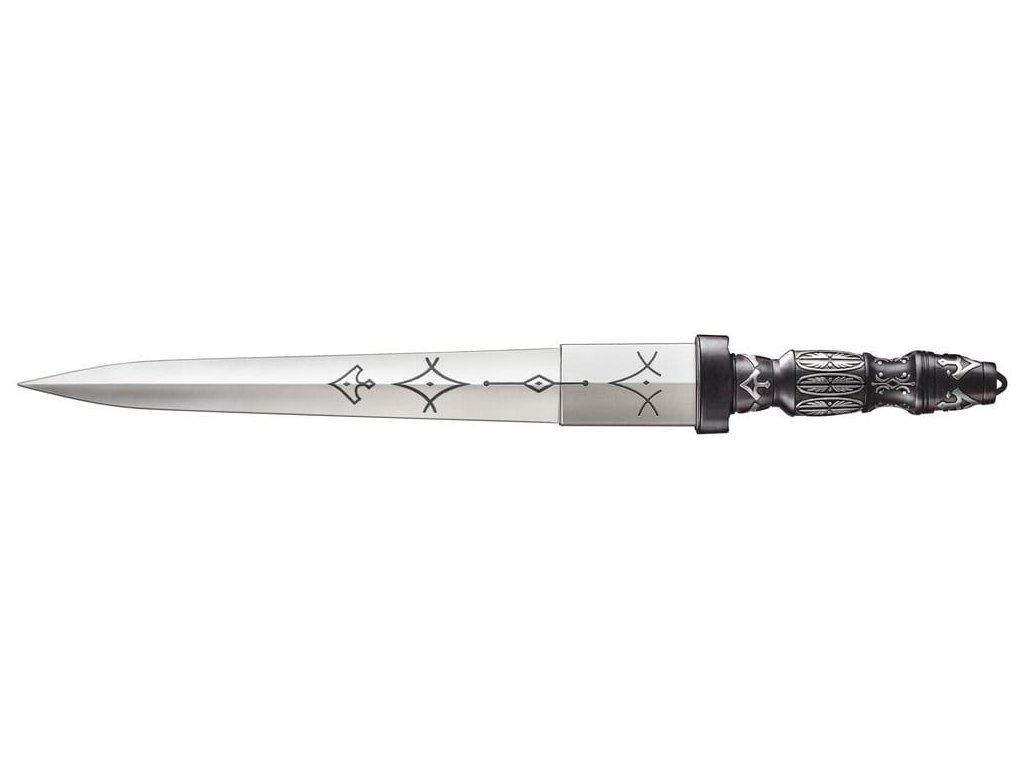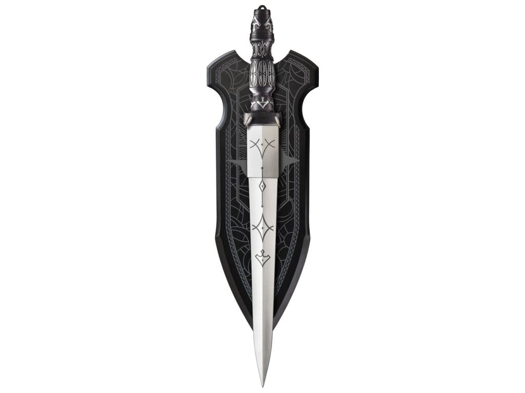 Replika Císařovy čepele od společnosti United Cutlery je přesnou reprodukcí skutečného rekvizity použitého ve filmech Duna. Nerezový ocelový hrot o délce 15 1/4 '' (neostřený) je vyrytý císařskými symboly. Rukojeť z metalového odlitku je potažená černou barvou s vyvýšenými stříbrnými dekoracemi, což přesně odpovídá filmové rekvizitě. Tato ohromující replika je vystavena na dřevěném stěnovém displeji zdobeném pečetí Domu Harkonnen. Spolu s Císařovou čepelí je také zahrnut certifikát pravosti, který zákazníkům zaručuje její hodnotu a oficiálně licencovaný status. Detaily: - Délka čepele: 38,74 cm - Materiál čepele: ocel - Materiál rukojeti: kovový odlitek.