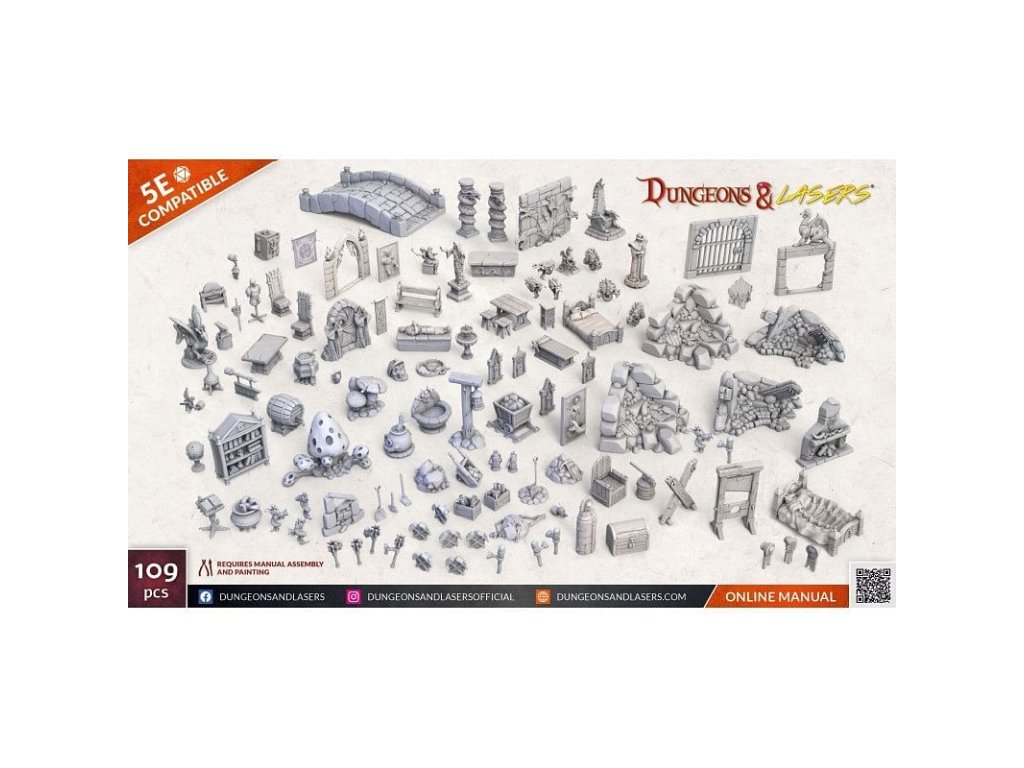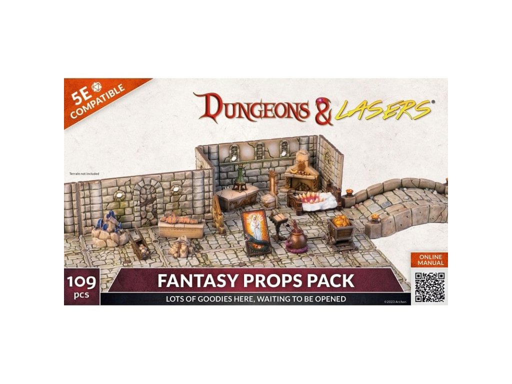 Sada Dungeons & Lasers: Fantasy Props Pack obsahuje 109 plastových součástí a dekorací pro váš fantasy svět, dungeony i města. Díky těmto rekvizitám jednoduše vytvoříte úžasnou atmosféru pro vaše hráče! Dungeons & Lasers: Fantasy Props Pack je kompatibilní s Dungeons & Dragons 5E nebo kteroukoliv jinou hrou na hrdiny. Součástí balení je anglická příručka s instrukcemi pro složení a nabarvení.