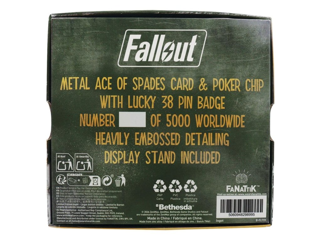 "Těšte se na nejexkluzivnější místo na Stripu s tímto šťastným kasinem 38 v imitaci zlata, trojicí lesklých pokladů, které vypadají, jako by byly přímo ukradeny z osobní zásoby pana House. V krabici najdete: - Odznak šťastného kasina 38 - 45 × 18,2 mm - Pokerový žeton Lucky 38 - 38 mm - Kovová hrací karta - 90 × 63,5 mm Limitováno na 5,000 sad po celém světě, každá tematická krabice je individuálně číslována na zadní straně a měří 135 × 125 × 25 mm. Perfektní pro fanoušky Fallout, milovníky kasin a pro každého, kdo si užívá trochu předválečného glamouru se svými dobrodružstvími ve vypleněné krajině. Vsadte se... štěstí je určitě na vaší straně - Oficiálně licencované - Omezeno na 5,000 - Napodobenina zlatého pokovení - Individuálně číslováno na krabici - Obsahuje 3 kusy.
