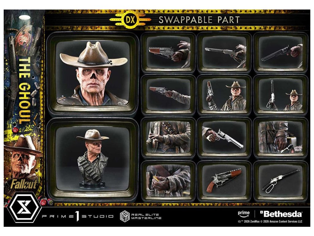 „No, možná ne, ale já se přivítám sám.“ Tulák, hledaný lovčí, který ožil se skutečností Pustině. Fallout je post-apokalyptické souborné drama, kde se prolíná brutální násilí a černý humor. Z živé adaptace dlouhodobě běžné RPG přichází jedna z jeho klíčových postav, Ghoul - který se nyní připojuje k řadě Real Elite Masterline. Jeho přítomnost, kterého se všichni v Pustině obávají, je zachycena s vynikající přesností v měřítku 1/4. Pozice, kdy Ghoul míří revolverem od boku, připomíná nezapomenutelnou přestřelku ve Filly. Od oblouku trupu po roztáhnutou levou ruku, každý detail byl vylepšen, aby se vytvořil napjatý, naplněný napětím rovnováhou. Odkrytá nosní dutina, vysušená kůže a chladný, bezcitný lesk v očích. Do tohoto divoce opotřebeného portrétu jsme nalili sochařské a malířské špičkové dovednosti. Od roztrhaného dlouhého kabátu po lesklé pouzdro je jeho západní styl vyveden se pečlivou texturou a stárnutím. A s vyměnitelnými částmi ho můžete také ozbrojit Ghoulovou pákovou puškou. Zvlášť navržený podstavec je složen tak, aby odrážel jeho zákonodárný způsob života. Pes Dogmeat stojící blízko u jeho boku. Opotřebovaná lednička Nuka-Cola. Televize s LED obrazovkou zobrazující předválečnou hvězdu Coopera Howarda. Každý prvek vtahuje příběh do vaší sbírky. Bohatá sada dalších částí dále rozšiřuje herní hodnotu. Prohlížení okolí při míření. Dosahování dalšího kola. Uvolnění bouře střelby s černými a stříbrnými jednočinnými revolvery. Přiveďte širokou škálu okamžiků střetnutí k životu. Spolu s Lucy a Maximem, kteří se v budoucnu připojí k řadě, je to nutné přivítání do vaší sbírky. "Specifikace:- Základna ve stylu Fallout - 2 x vyměnitelné hlavy (doprava, doleva) - 3 x vyměnitelné pravé ruce (střílení od boku, vodorovně, zvednuté) - 3 x vyměnitelné pravé ruce pro střílení od boku (Ghoulový revolver, Ghoulova puška, jednočinný revolver [černý]) - 1 x vyměnitelná pravá ruka pro horizontální (Ghoulový revolver) - 2 x vyměnitelné pravé ruce pro zvednutí (Ghoulový revolver, Ghoulova puška) - 3 x vyměnitelné levé ruce (větrání, střílení od boku, snížené) - 2 x vyměnitelné levé ruce pro střílení od boku (jednočinný revolver [stříbrný], nábojnice) - 1 x Stojan na hlavu - LED podsvícení (televize) LED Napájení: Bude upřesněno * Připravte si baterie, USB kabely nebo jiné nezbytné položky v závislosti na konečném způsobu napájení. Orientační datum vydání: srpen 2027