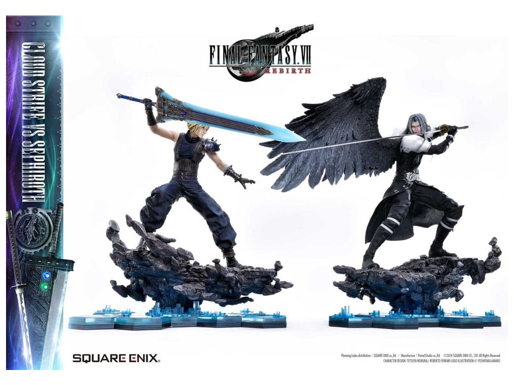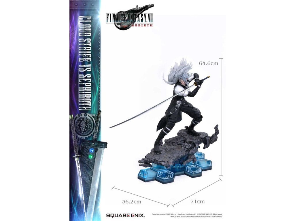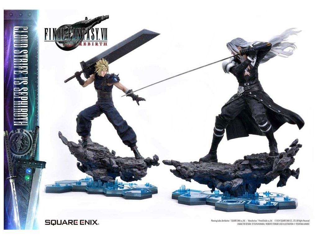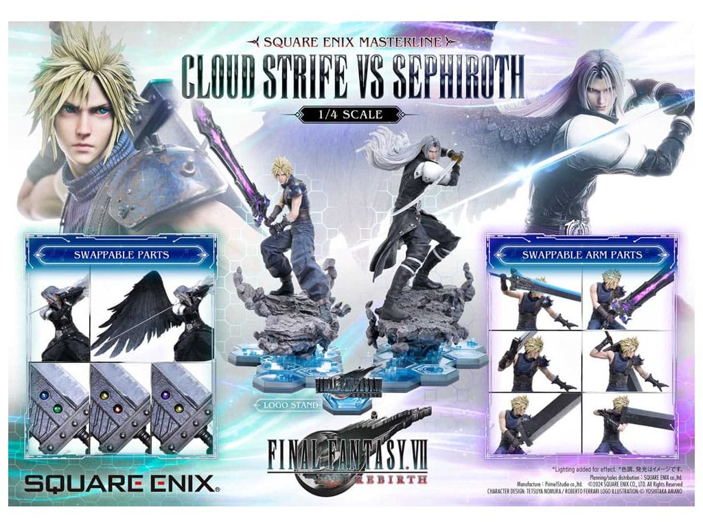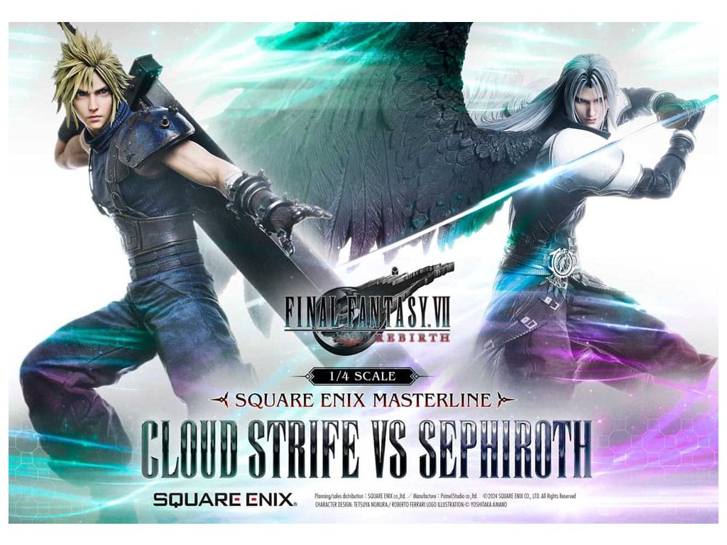 Osud bojovat o planetu, vyprávěný prostřednictvím jemného barevného provedení a sochařství. Cloud a Sephiroth z FINAL FANTASY VII REBIRTH jsou převedeni na život jako socha v měřítku 1/4, zdokonaleni v 3D. SQUARE ENIX a Prime 1 Studio opět spojily síly, aby vám přinesly vysoce ceněný sběratelský předmět SQUARE ENIX MASTERLINE. Cloud Strife vs. Sephiroth z FINAL FANTASY VII REBIRTH se připojuje k řadě těchto soch, které přitahují pozornost sběratelů z celého světa. Cloudova bitva je připravena, s půl-obrázkovy postojem, drží svůj velký meč vedle svého těla. Sephirothův elegantní postoj nese jeho prodloužený meč, plný tiché hrozby. Překonávají své osudy a své minulosti, obě postavy nabízejí úchvatný postoj, znovu vytvářející okamžik, kdy se konečně postaví v realistickém měřítku 1/4. Meč Buster může být vybaven jakýmkoli ze dvou pěti Materii, Masamune září krásným vzorem na čepeli, Cloudovy vlasy vypadají jako na trní a uhlíkově černé křídlo, které se táhne od Sephirothova pravého ramene. Každý detail a tvar zachycují jejich charakteristiky a jsou vyplněny řemeslníkem. Modré šestiúhelníky, které pokrývají dno speciální základny, se také používají na soše Zacka Faira ze stejné série, což vytváří pocit jednoty, když jsou umístěny vedle sebe. Cloud vs Sephiroth set obsahuje všechny další díly z deluxe verzí každé postavy. Sephiroth zahrnuje horní část těla bez křídla, Cloud zahrnuje několik dalších dílů na ruce a křišťálové meče - ale také Umbral Blade, bonusovou zbraň, která je exkluzivní pro tento set. Můžete cítit bohatý příběh za postavou z vynikajícího sochařství a barvení tohoto mistrovského díla. Požadující to nejlepší ve všech aspektech, tato 3D tvorba vám umožní stát se svědkem REBIRTHu osudového boje ve vaší sbírce! Materiál: Polystone / Některé části využívají jiné materiály Přibližná velikost výrobku: Cloud: 68 x 44 x 52 cm 54 x 33 x 64 cm (když je meč Buster držen oběma rukama), Sephiroth: 69 x 41 x 72 cm Součásti balení: Cloud Strife:- Meč Buster- Křišťálový meč- Umbral Blade (bonusová zbraň setu Cloud vs Sephiroth)- 3 x pravá ruka - 1 x levá ruka - 2 x sada obou rukou - 5 x Materia - Speciální základna- Podpěrný sloup Sephiroth:- 2 x horní část těla - Speciální základna- Podpěrný sloup- Stojan s logem FINAL FANTASY VII REBIRTH