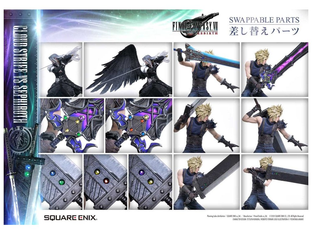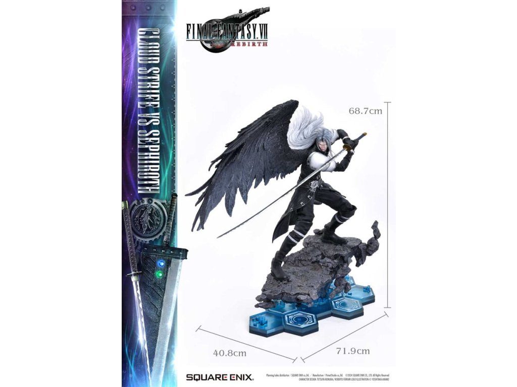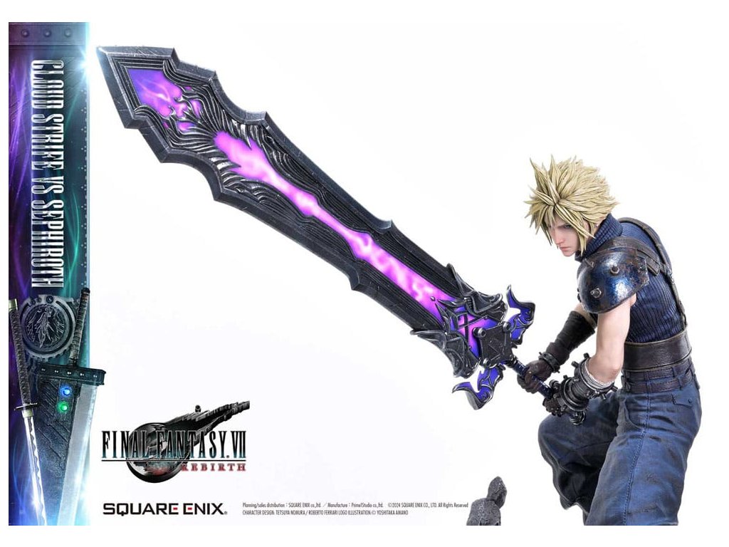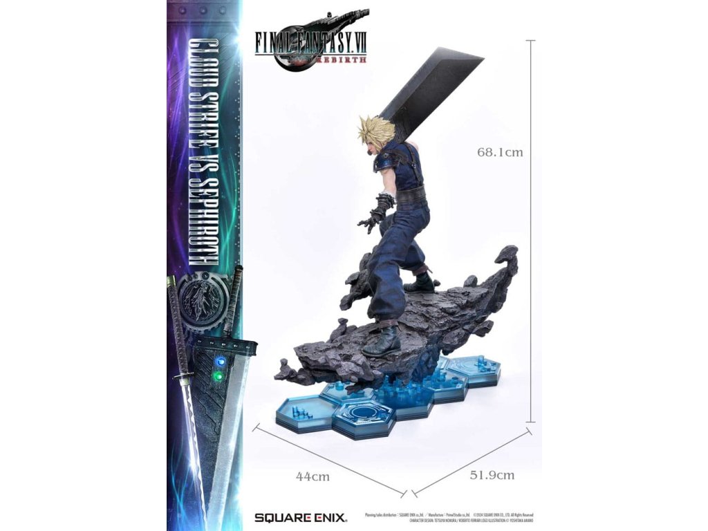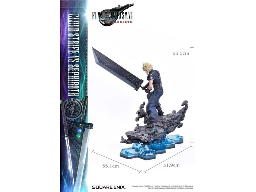 Osud bojovat o planetu, vyprávěný prostřednictvím jemného barevného provedení a sochařství. Cloud a Sephiroth z FINAL FANTASY VII REBIRTH jsou převedeni na život jako socha v měřítku 1/4, zdokonaleni v 3D. SQUARE ENIX a Prime 1 Studio opět spojily síly, aby vám přinesly vysoce ceněný sběratelský předmět SQUARE ENIX MASTERLINE. Cloud Strife vs. Sephiroth z FINAL FANTASY VII REBIRTH se připojuje k řadě těchto soch, které přitahují pozornost sběratelů z celého světa. Cloudova bitva je připravena, s půl-obrázkovy postojem, drží svůj velký meč vedle svého těla. Sephirothův elegantní postoj nese jeho prodloužený meč, plný tiché hrozby. Překonávají své osudy a své minulosti, obě postavy nabízejí úchvatný postoj, znovu vytvářející okamžik, kdy se konečně postaví v realistickém měřítku 1/4. Meč Buster může být vybaven jakýmkoli ze dvou pěti Materii, Masamune září krásným vzorem na čepeli, Cloudovy vlasy vypadají jako na trní a uhlíkově černé křídlo, které se táhne od Sephirothova pravého ramene. Každý detail a tvar zachycují jejich charakteristiky a jsou vyplněny řemeslníkem. Modré šestiúhelníky, které pokrývají dno speciální základny, se také používají na soše Zacka Faira ze stejné série, což vytváří pocit jednoty, když jsou umístěny vedle sebe. Cloud vs Sephiroth set obsahuje všechny další díly z deluxe verzí každé postavy. Sephiroth zahrnuje horní část těla bez křídla, Cloud zahrnuje několik dalších dílů na ruce a křišťálové meče - ale také Umbral Blade, bonusovou zbraň, která je exkluzivní pro tento set. Můžete cítit bohatý příběh za postavou z vynikajícího sochařství a barvení tohoto mistrovského díla. Požadující to nejlepší ve všech aspektech, tato 3D tvorba vám umožní stát se svědkem REBIRTHu osudového boje ve vaší sbírce! Materiál: Polystone / Některé části využívají jiné materiály Přibližná velikost výrobku: Cloud: 68 x 44 x 52 cm 54 x 33 x 64 cm (když je meč Buster držen oběma rukama), Sephiroth: 69 x 41 x 72 cm Součásti balení: Cloud Strife:- Meč Buster- Křišťálový meč- Umbral Blade (bonusová zbraň setu Cloud vs Sephiroth)- 3 x pravá ruka - 1 x levá ruka - 2 x sada obou rukou - 5 x Materia - Speciální základna- Podpěrný sloup Sephiroth:- 2 x horní část těla - Speciální základna- Podpěrný sloup- Stojan s logem FINAL FANTASY VII REBIRTH