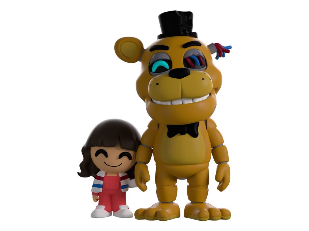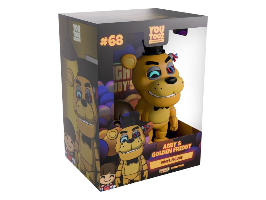 Je čas jít se hrát.'Hej Abby! Kdo je tvůj nový kamarád? Samozřejmě, že může jít hrát s námi! Freddy je s úsměvem na tlamě vysoký 4,5 palce a z jedné oční dutiny září jasná modrá duhovka, zatímco z druhé trčí volné kabely, které odpovídají jeho chybějícímu uchu. Na své zlatavě hnědé hlavě má jednoduchý černý cylindr a pod svým silným bradovým výběžkem černý plastron a jeho silně profilované ruce visí po jeho stranách, zatímco roztomilá Abby drží jeho ruku. Abby, která je nadšená z dobrodružství se svým zlatým kamarádem, má obrovský úsměv na tváři pod rovnou ofinou a nosí červený, modrý a bílý kardigan přes růžový kombinezon. Z vnějšku jejich balení vykukuje Zlatý Freddy temnými dveřmi. V interiéru je plno málo osvětlených barevných kuliček, které se rozlijí po ochranném obalu, zatímco jejich figurky jsou vidět skrz velké čiré okno na přední straně balení. Tento sběratelský předmět je dodáván v matném, lemovaném, ochranném vnějším rukávu a v plastovém ochranném obalu na míru pro maximální ochranu během přepravy.O Five Nights at Freddy's:Five Nights at Freddy's je survival hororová hra vytvořená Scottem Cawthonem. Hra je nastavena tak, že hráč pracuje jako noční strážce v rodinné pizzerii Freddy Fazbear, kde je úkolem vyrovnat se se sbírkou sentientních animatroniků. Krátce po vydání hry v roce 2014 získala kultovní následování a rychle se vyvinula v komplexní fiktivní vesmír plný příběhů a různých spin-offů.