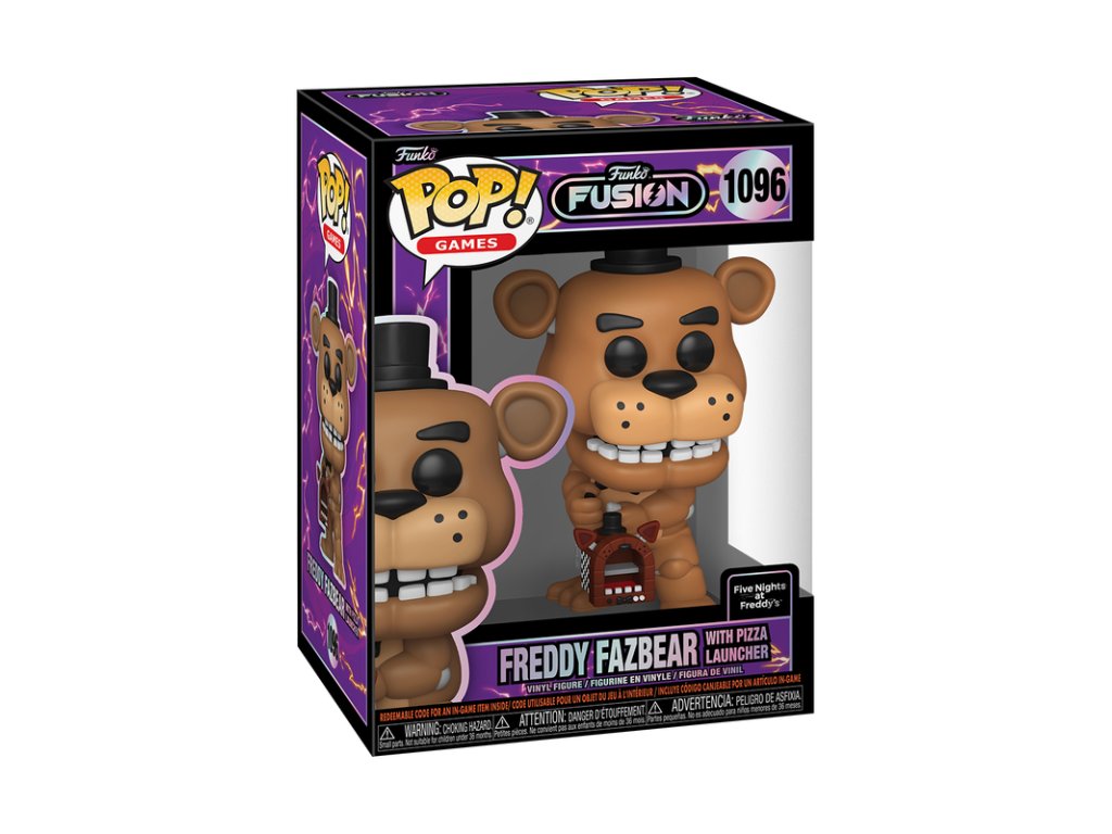 Stylová přibližně 10,9 cm vysoká vinylová sběratelská figurka Freddy Fazbear with Pizza Launcher (Funko Fusion) inspirovaná videohrou Five Nights at Freddy's z edice Funko POP! Games.