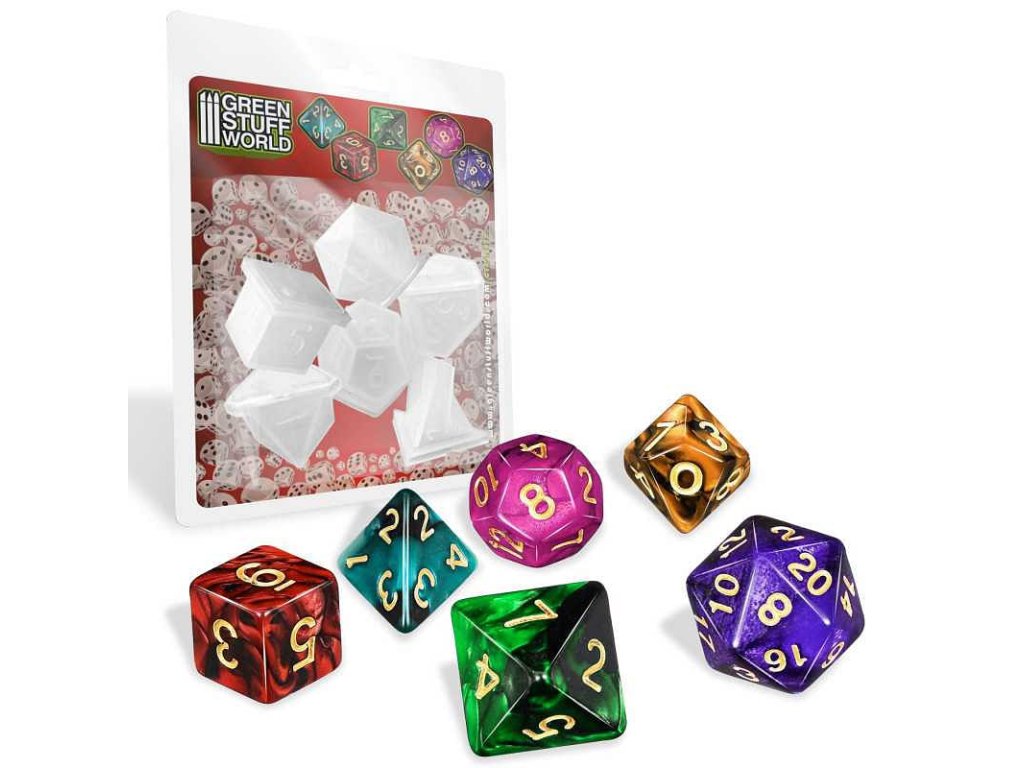 Sada obsahuje silikonové formičky na tvorbu mnohostěnných RPG kostek: čtyřstěnnou, šestistěnnou, osmistěnnou, desetistěnnou, dvanáctistěnnou a dvacetistěnnou. Vhodné pro různé typy resinu (UV, epoxy, polyester, polyurethan), vosk, mýdlo, polymerové jíly a další. Odolné do teploty 200ºC.