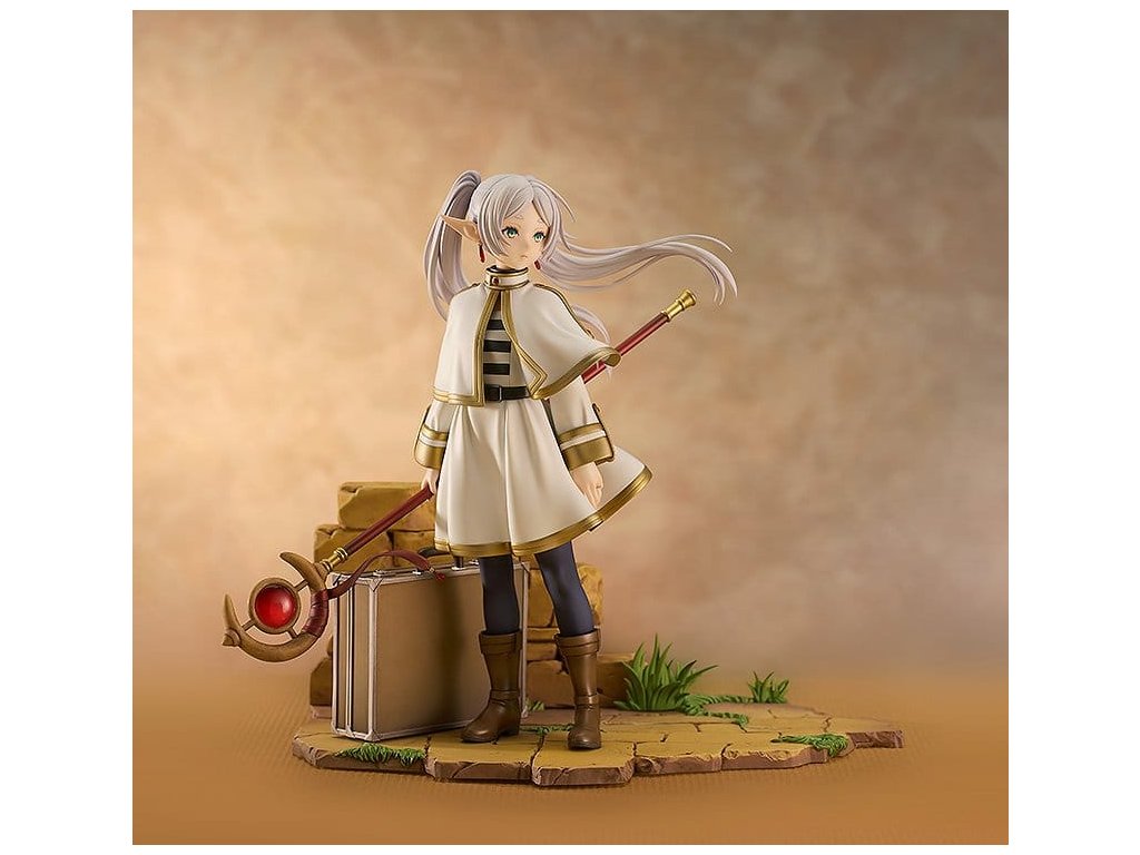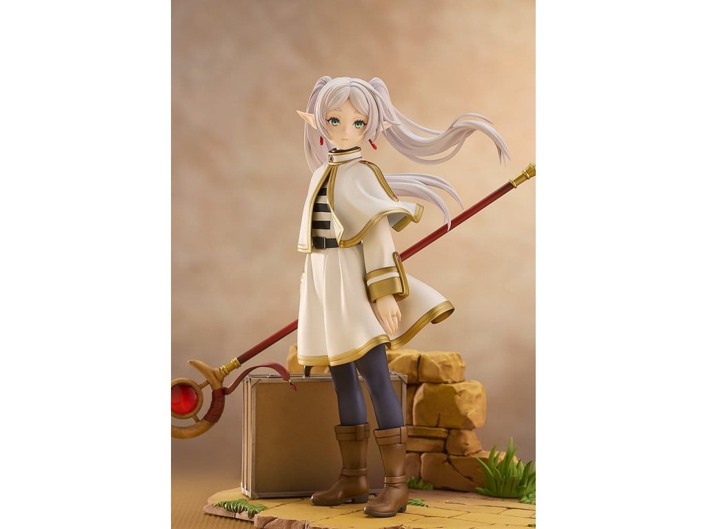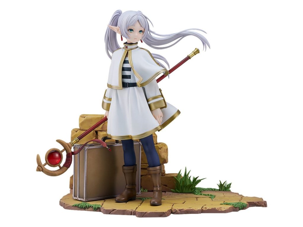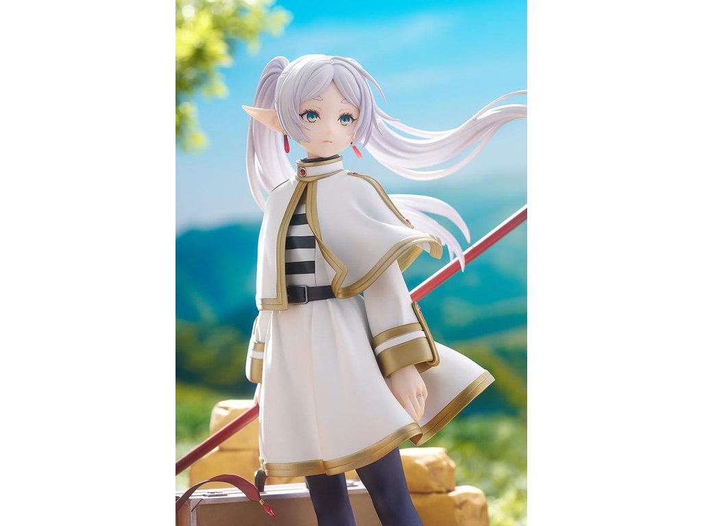 Z anime série 'Frieren: Konec cesty' přichází socha měřítka kouzelnice Frieren. Tato figura dokonale zahrnuje bohatý svět této série ve formě měřítkové figury. Frieren byla věrně zachycena ve formě figury se smutným výrazem na tváři, zírajíc na pomíjivé záření západu slunce, jako by přemýšlela o své dosavadní cestě nebo toužila po někom velmi drahém. Nejen Frieren sama, ale i její milovaný kufřík a hůl byly pečlivě zrekonstruovány do formy figury. Realisticky opotřebované textury jejích věcí vyjadřují mnoho let, které strávila s Frieren. Jemný design prstenu zrcadlové lotosové květiny na její levé ruce byl také pečlivě zachován. Určitě ji přidejte do své sbírky a užijte si prohlížení každého detailu, který tato figura nabízí.