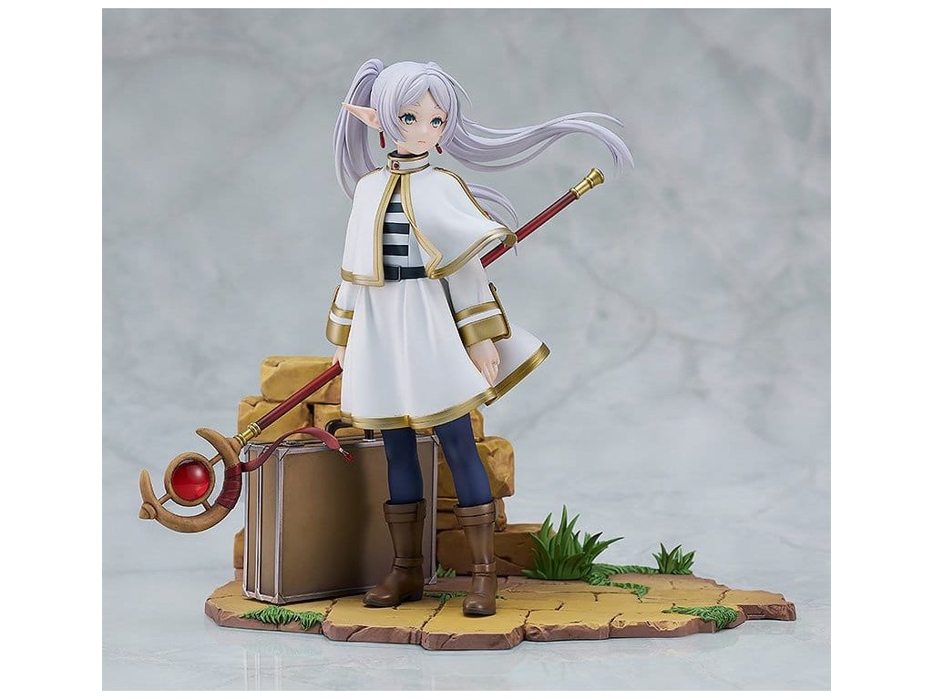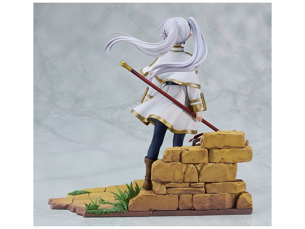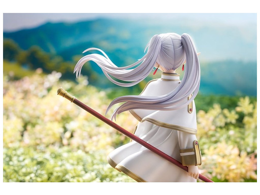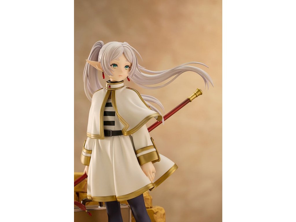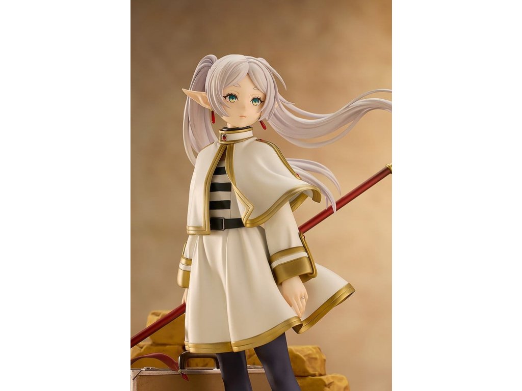 Z anime série 'Frieren: Konec cesty' přichází socha měřítka kouzelnice Frieren. Tato figura dokonale zahrnuje bohatý svět této série ve formě měřítkové figury. Frieren byla věrně zachycena ve formě figury se smutným výrazem na tváři, zírajíc na pomíjivé záření západu slunce, jako by přemýšlela o své dosavadní cestě nebo toužila po někom velmi drahém. Nejen Frieren sama, ale i její milovaný kufřík a hůl byly pečlivě zrekonstruovány do formy figury. Realisticky opotřebované textury jejích věcí vyjadřují mnoho let, které strávila s Frieren. Jemný design prstenu zrcadlové lotosové květiny na její levé ruce byl také pečlivě zachován. Určitě ji přidejte do své sbírky a užijte si prohlížení každého detailu, který tato figura nabízí.
