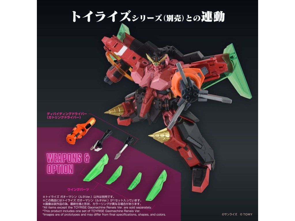 Ze seriálu "The King of Braves GaoGaiGar Final" se do řady Toyrise připojují Gao Machines (RENAIS Ver.)! Obsahuje: Gao Machines Liner Gao II – Drill Gao II – Stealth Gao III. Sestavte plně kombinovanou formu se všemi Gao Machines, které se objevily v HAKAIOH, bez zbytečných dílů. (Poznámka: Pro vytvoření kombinovaného režimu je nutné samostatně dokoupit "Toyrise GaoFar RENAIS Ver.".) Jako originální prvek Toyrise může být každá Gao Machine také nasazena jako výzbroj. Sada je vybavena 5mm čepy po celém rozsahu, což umožňuje uživatelské vlastní přestavby. Navíc kombinací se samostatně prodávanými "Toyrise Genesic GaoGaiGar", "Toyrise GaoFighGar" a "Toyrise GaoGaiGar" je možné dosáhnout ještě větší customizace! Upozornění: V závislosti na zvolené kombinaci nemusí být figurka schopna stát samostatně. Pro kombinaci s "Toyrise GaoFighGar (RENAIS Ver.)" je nutné samostatně zakoupit "Toyrise GaoFar RENAIS Ver.".