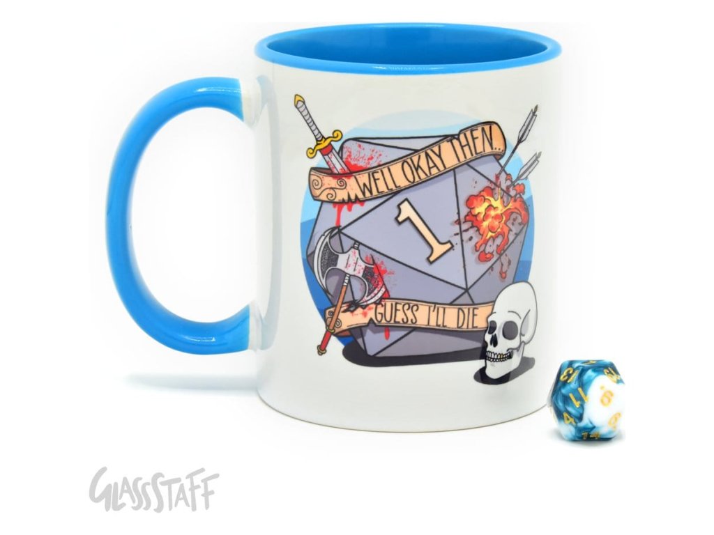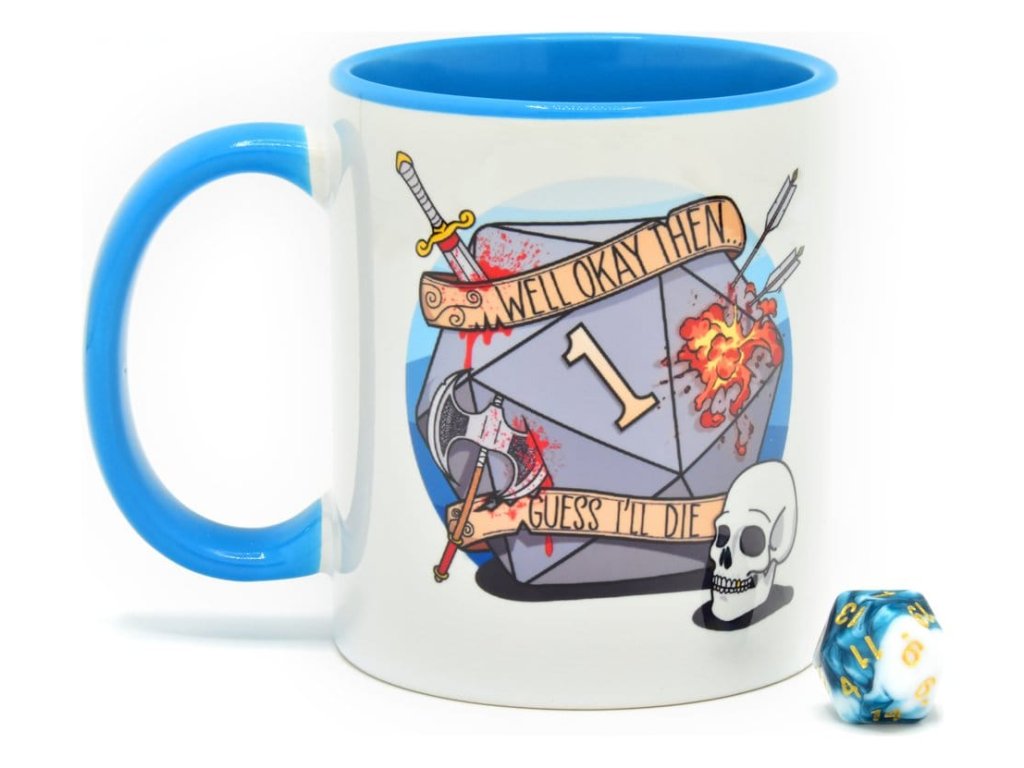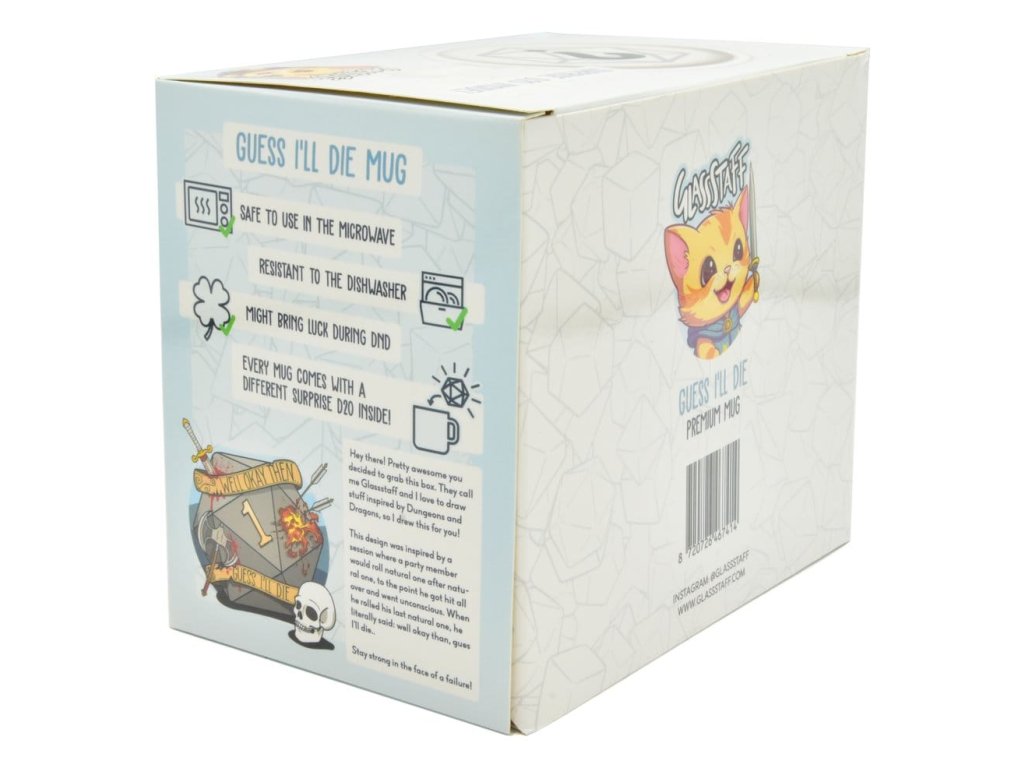 Inspirovali jsme se sezením, kdy byl náš člen skupiny postižen jedničkou za jedničkou, až byl znovu a znovu zasažen a upadl do bezvědomí. Když hodil svou poslední přirozenou jedničku, doslova řekl: no dobře, asi zemřu. Přijal to jako šampion a tak vznikl tento design. Tento hrnek DnD je perfektní pro kávu, čaj a horkou čokoládu během těch intenzivních sezení DnD!! Hrnek je potištěn vysoce kvalitním sublimačním tiskem, což z něj dělá oblíbený dárek pro každého skutečného milovníka horkých nápojů. Design je vytištěn na obou stranách hrnku, takže si ho můžete užít vy i vaši členové skupiny! Tento hrnek je speciálně vytvořen s myšlenkou, že bude darován vám, vašim členům skupiny, přátelům a rodině. Spolu s malým dárkem kostky D20 v každém hrnku, budete moci s každým chvílí užívání vašeho nápoje; hodit pro iniciativu. Prezentuje se v dekorativní krabici s okénkem, hrnek je vyroben z keramiky, což ho činí vhodným do myčky nádobí i do mikrovlnné trouby.
