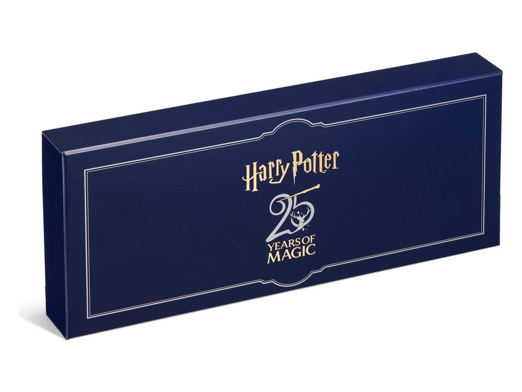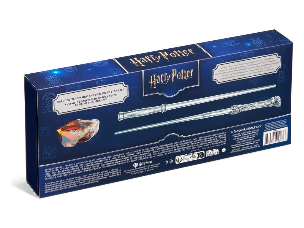 Připojte se k oslavě 25 let od prvního filmu Harry Potter a Kámen mudrců. The Noble Collection s potěšením oznamuje velmi vzrušující sadu hůlek, která připomíná Harryho první dobrodružství a závod s Temným pánem o tajemný kámen. Tato sada, speciálně vytvořená pro stříbrné výročí filmů, obsahuje repliky Harryho první hůlky z prvních dvou filmů a ikonické hůlky z jmelí, kterou používá ve zbývajících filmech. Obě hůlky jsou vyrobené z vysoce kvalitní pryskyřice a jsou opatřeny okouzlujícím antikním stříbrným povrchem. Uzavřené v modré sběratelské krabici, doplněné o zlaté a stříbrné prvky k 25. výročí, sada také obsahuje repliku rekvizity Kámen mudrců přesně podle filmu.