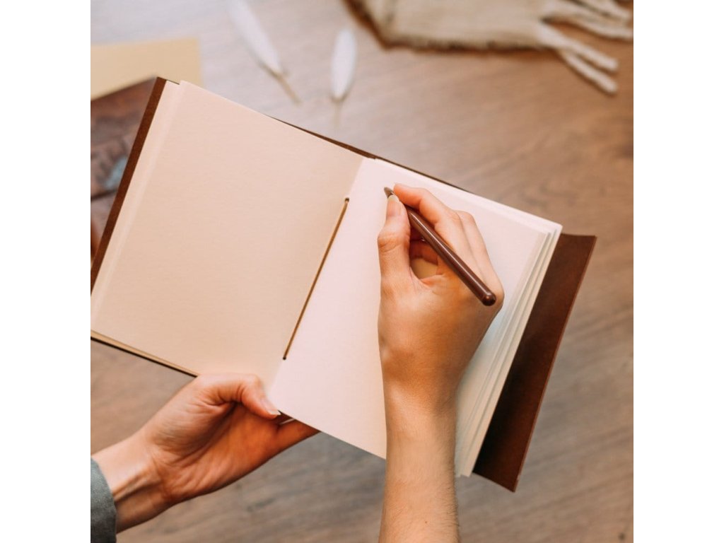 - PU měkký obal sešitu o rozměrech 22,5 x 17 x 2,6 cm s razením a personalizovaným tiskem - Sešitý vazba a boční uzavírání pomocí dvou šňůrek - Sešit je vyrobený ručním šitím a obsahuje 90 listů (180 stran) prázdného recyklovaného krémově bílého papíru bez kyselin.