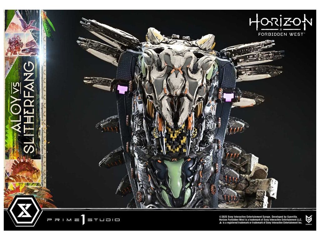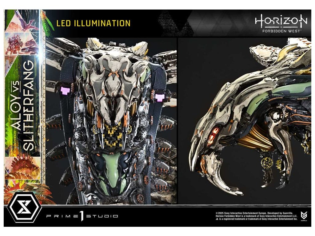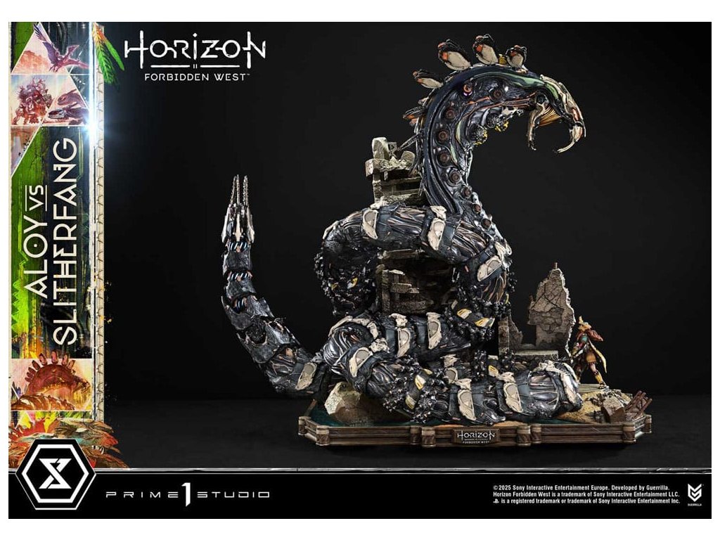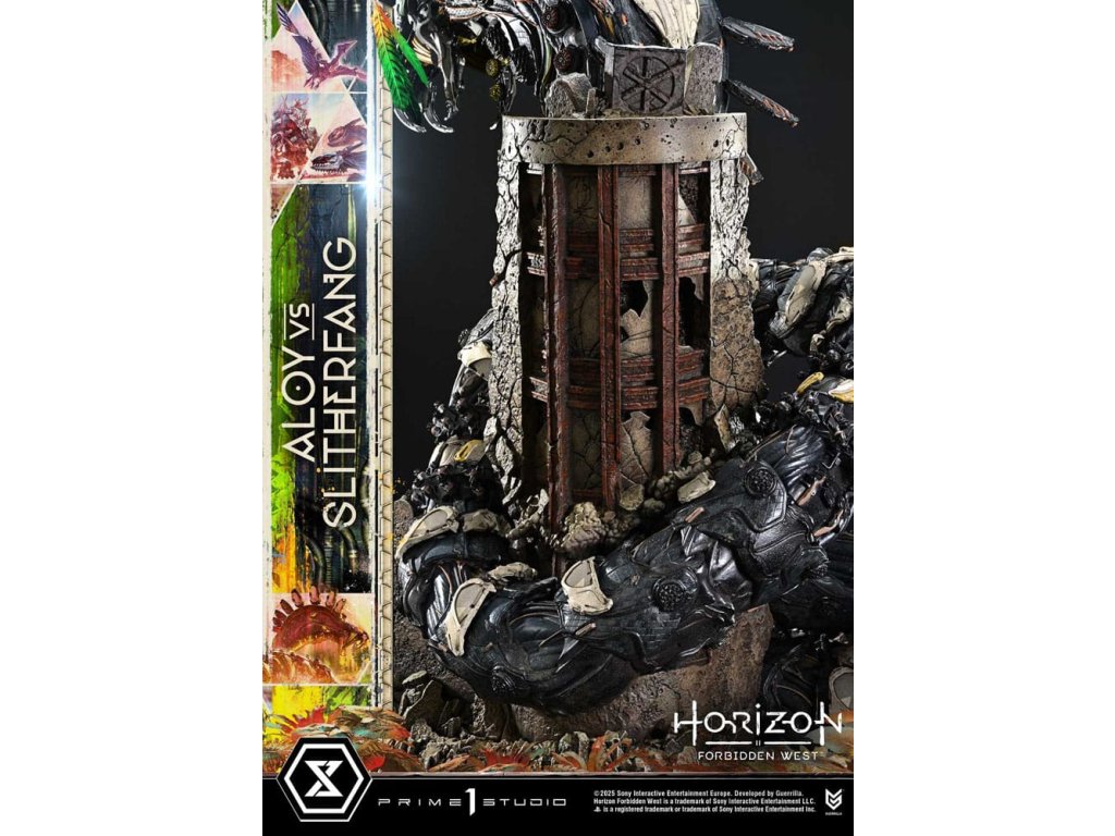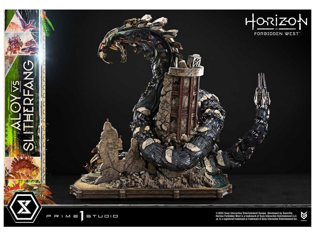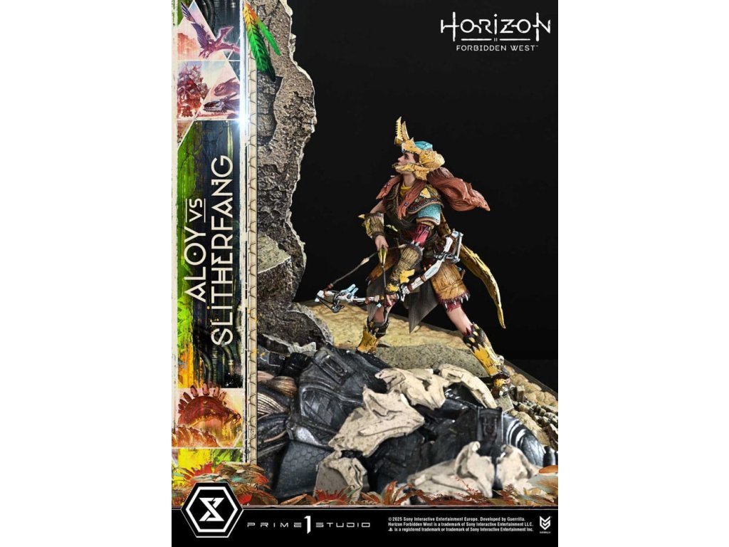 Lovec napíná šíp. Ocelový had zvedá hlavu. Bitva mezi starobylými ruinami zachycena v diorámě vysoké hustoty. Jak lidstvo čelí nové krizi, cesta napříč americkým západem se odvíjí v ''Horizon Zakázaný Západ''. Z této druhé kapitoly - jedné, která představuje evoluci franchisy - se Aloy vs. The Slitherfang připojuje k Ultimátní Dioráma Masterline. Inspirací byl úkol ''Dosáhnout na hvězdy'' - ve kterém Aloy prohledává starověké ruiny v hledání naděje nalezené v moudrosti starých - toto dioráma znovu vytváří vrcholnou bitvu z tohoto úkolu. Slitherfang se motal kolem rozbitých ruin. Aloy odolává, zaměřuje se na rozhodující moment. Průsečíky jejich pohledů, ohromující rozdíl v měřítku a napjatá vzdálenost mezi nimi jsou pečlivě komponovány tak, aby zachytili okamžik plný napětí. Zvedající svou zářivou hlavu, Slitherfang ukazuje ostré hrany a složitou vnitřní mechaniku na těle téměř 80 cm vysokém. Střídání textur na každé součásti, překrývající se brnění navržené tak, aby vyvolávalo pocit mechanického pohybu a prach držící se na jeho povrchu, to vše zvyšuje jeho přítomnost. Jeho oči a ocas svítí díky LED osvětlení, což zesiluje hrozbu kovového zvířete. Zarudlé tváře a soustředěný pohled Aloy. Opotřebované textury pečlivě namalované na její stín Death-Seeker a Tenakth Vanquisher. Její malý rámec nese úžasný bohatství detailů a odhodlání. Od napětí v jejích prstech, jak napíná šíp, po dynamický pohyb jejích copánků, každý nuance přispívá k příběhu. Tato bonusová verze také zahrnuje další hlavovou sošku s tvářovou malbou Tenakth Vindicator. Jeho realistické černé, žluté a červené vzorování - kompletní s přirozenými variacemi - přidává filozofii válečníka na vaše zobrazení. Lovec a ocelový had, čelící si mezi starobylými ruinami. Dramatický moment z Zakázaného západu, přivedený k životu mistrovským sochařstvím a malbou. Specifikace produktu: - Zakázaný Západ - podstavec na téma - LED osvětlení (oči a ocas Slitherfangu) Metoda LED napájení: bude upřesněna * Připravte baterie, USB kabely nebo jiné potřebné položky v závislosti na konečné metodě napájení. Orientační datum vydání: srpen 2027