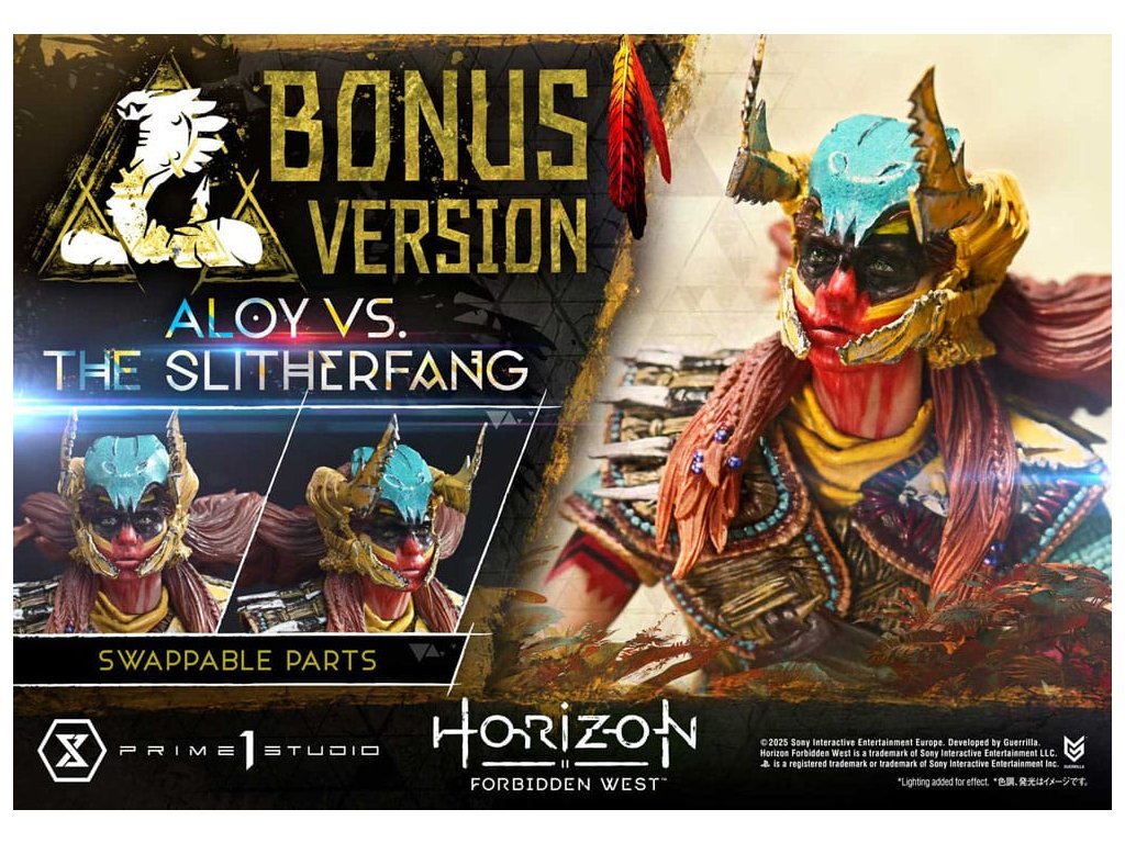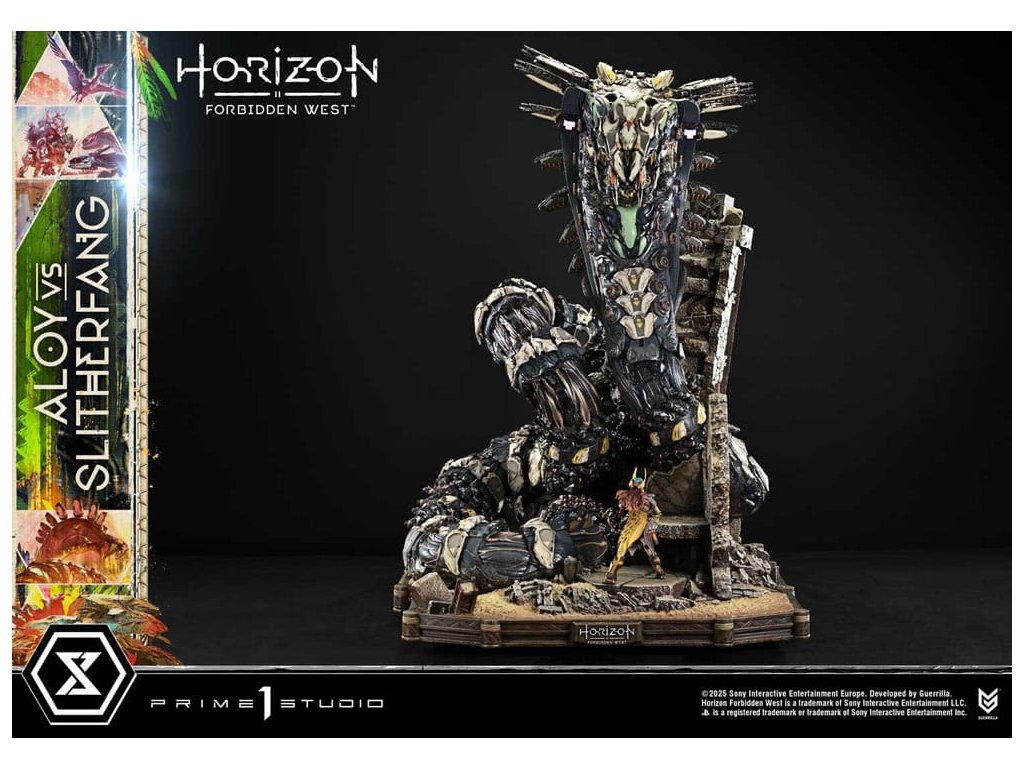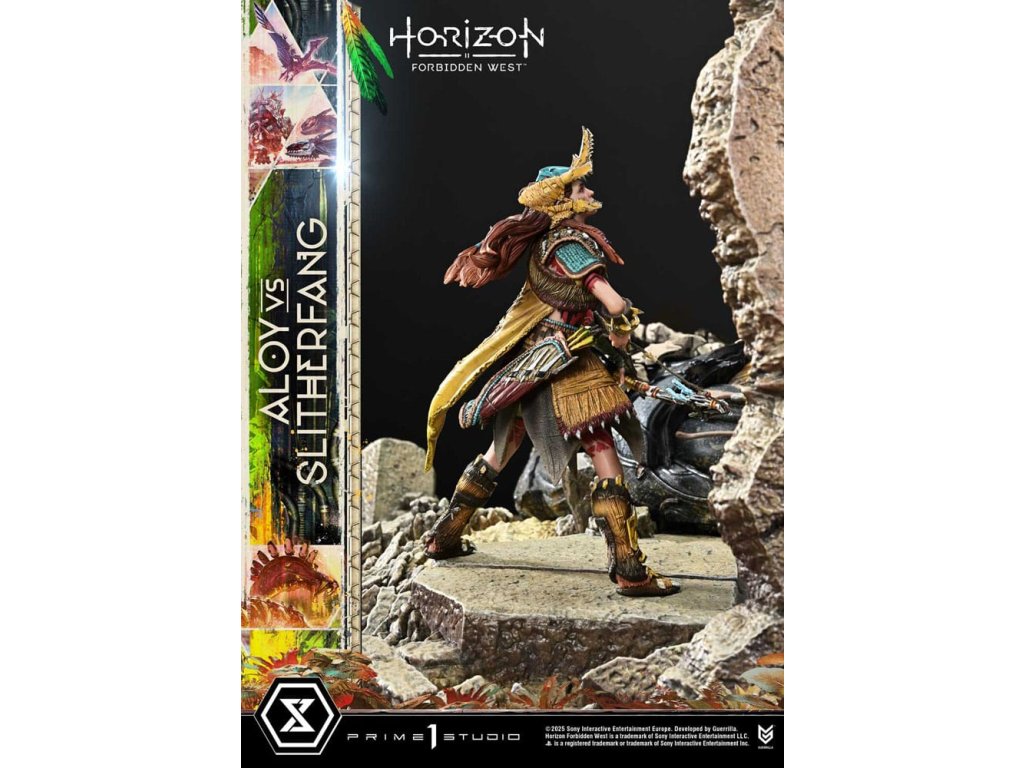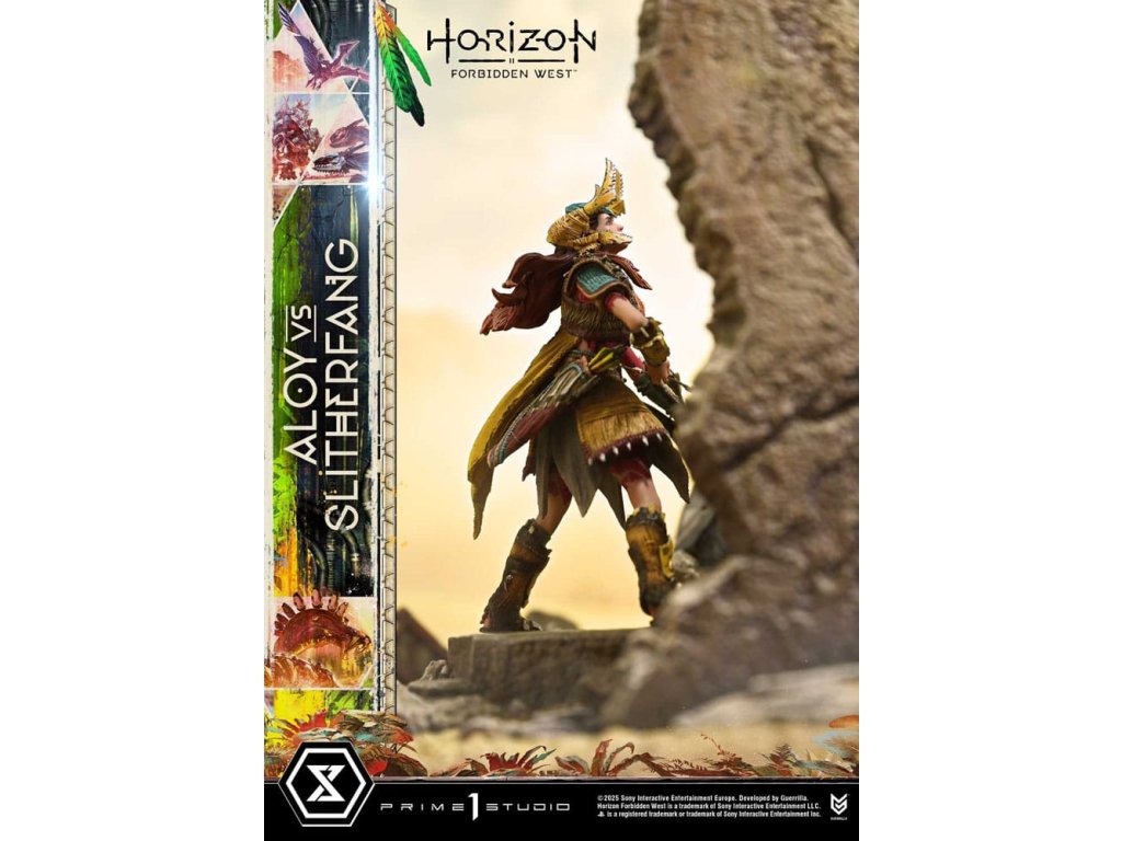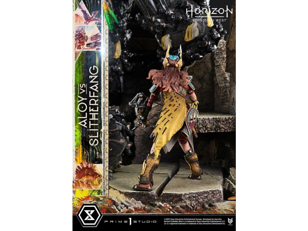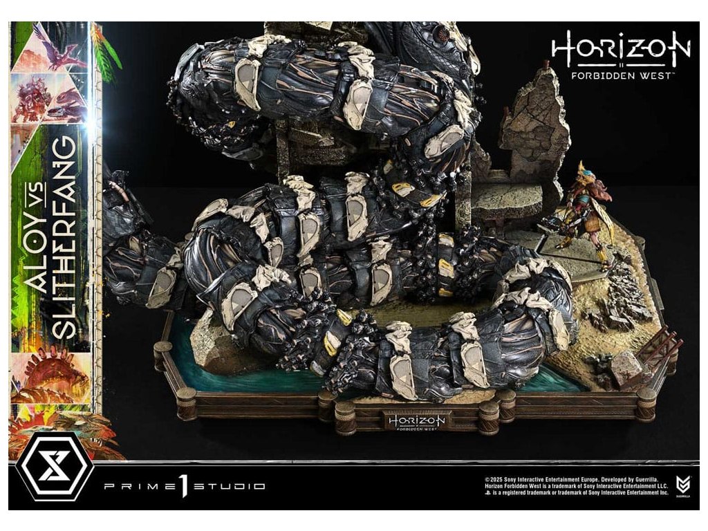 Lovec natahuje svou šípu. Ocelový had zvedá hlavu. Bitva uprostřed starobylých ruin, zachycená v dioramatu vysoké hustoty. Když lidstvo čelí nové krizi, rozvíjí se cesta napříč americkým západem v 'Horizon Forbidden West'. Z této druhé kapitoly - jedné, která vystihuje evoluci série - se Aloy vs. The Slitherfang připojuje k Ultimate Diorama Masterline. Insiprováno úkolem 'Reach For The Stars', ve kterém Aloy prohledává starobylé ruiny v hledání naděje nalezené v moudrosti Starých - toto diorama znovu vytváří rozhodující bitvu z tohoto úkolu. On the Slitherfang korálové okolo zřícených ruin. Aloy stojí pevně, míří na rozhodující okamžik. Jejich protínající se lini je zraku, ohromující rozdíl v měřítku a dýchání-těsnící vzdálenost mezi nimi jsou vše pečlivě složeny, aby zachytily okamžitý plný napětí. Zvedající svou zářící hlavu, The Slitherfang předvádí ostré hrany a složitý interní mechanismus napříč tělem téměř 80 cm vysokým. Různé textury napříč každou komponentou, překrývající se obrněné plotny upravené tak, aby evokovaly mechanický rozsah pohybu, a prach přilnutý k jeho povrchu vše zvyšuje jeho přítomnost. Jeho oči a ocas svítí LED osvětlením, čímž se zvyšuje hrozba kovové šelmy. Tváře Aloy zaryté a zaměřený pohled. Opotřebované textury pečlivě namalované na její Death-Seeker's Shadow a Tenakth Vanquisher. Její malý rám nese velmi detailní a rozhodný vzhled. Od napětí v jejích prstech, když nacouvá šíp, po dynamický průběh jejích copánků, každý nuance přispívá k příběhu. Tato bonusová verze také zahrnuje další hlavu sošky s Tenakth Vindicator malbou na obličeji. Její realistické černé, žluté a červené vzory - kompletní s přirozenými variacemi - přidávají k filozofii bojovníka na vaši zobrazení. Lovec a ocelový had, čelí v starobylých ruinách. Dramatický moment z Forbidden West, přiveden k životu mistrovským sochařením a malbou. Specifikace produktu: - Základna tématu Horizon Forbidden West - 1 x výměnná hlava Aloy (holá tvář) - LED osvětlení (oči a ocas The Slitherfang) - 1 x výměnná hlava Aloy (face paint: Tenakth Vindicator) Způsob napájení LED: TBD * Připravte si baterie, USB kabely nebo jiné potřebné předměty v závislosti na konečné metodě napájení. Limitováno na 400 kusů. Orientační datum vydání: srpen 2027