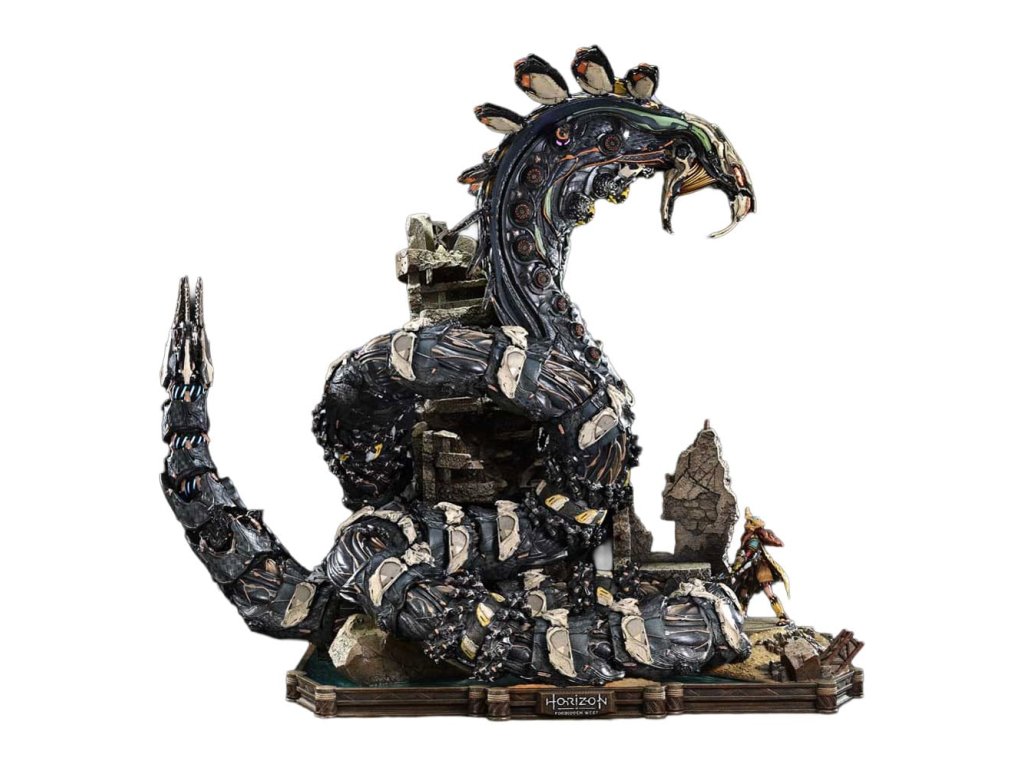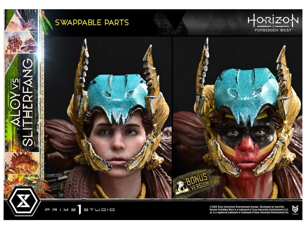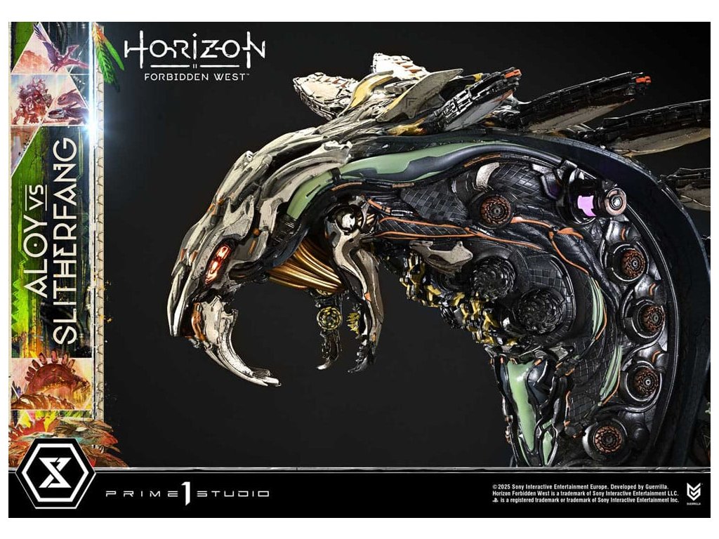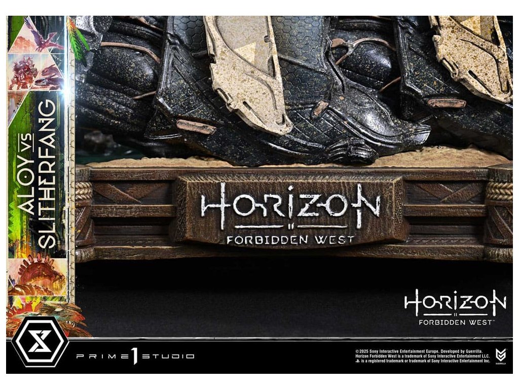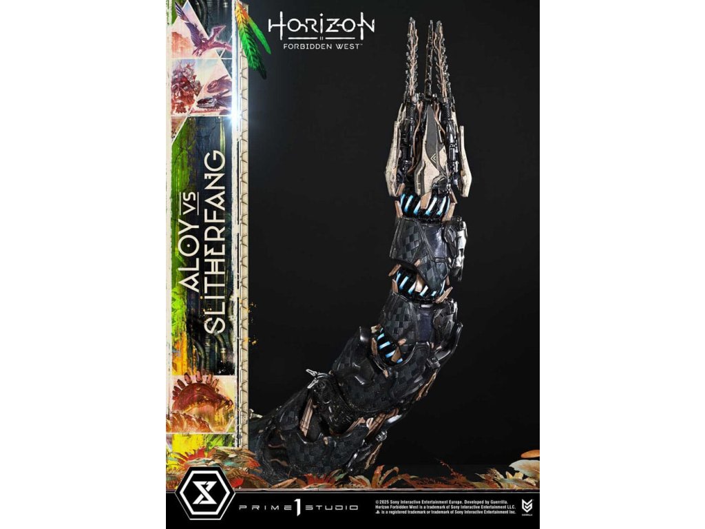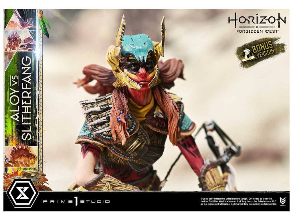 Lovec natahuje svou šípu. Ocelový had zvedá hlavu. Bitva uprostřed starobylých ruin, zachycená v dioramatu vysoké hustoty. Když lidstvo čelí nové krizi, rozvíjí se cesta napříč americkým západem v 'Horizon Forbidden West'. Z této druhé kapitoly - jedné, která vystihuje evoluci série - se Aloy vs. The Slitherfang připojuje k Ultimate Diorama Masterline. Insiprováno úkolem 'Reach For The Stars', ve kterém Aloy prohledává starobylé ruiny v hledání naděje nalezené v moudrosti Starých - toto diorama znovu vytváří rozhodující bitvu z tohoto úkolu. On the Slitherfang korálové okolo zřícených ruin. Aloy stojí pevně, míří na rozhodující okamžik. Jejich protínající se lini je zraku, ohromující rozdíl v měřítku a dýchání-těsnící vzdálenost mezi nimi jsou vše pečlivě složeny, aby zachytily okamžitý plný napětí. Zvedající svou zářící hlavu, The Slitherfang předvádí ostré hrany a složitý interní mechanismus napříč tělem téměř 80 cm vysokým. Různé textury napříč každou komponentou, překrývající se obrněné plotny upravené tak, aby evokovaly mechanický rozsah pohybu, a prach přilnutý k jeho povrchu vše zvyšuje jeho přítomnost. Jeho oči a ocas svítí LED osvětlením, čímž se zvyšuje hrozba kovové šelmy. Tváře Aloy zaryté a zaměřený pohled. Opotřebované textury pečlivě namalované na její Death-Seeker's Shadow a Tenakth Vanquisher. Její malý rám nese velmi detailní a rozhodný vzhled. Od napětí v jejích prstech, když nacouvá šíp, po dynamický průběh jejích copánků, každý nuance přispívá k příběhu. Tato bonusová verze také zahrnuje další hlavu sošky s Tenakth Vindicator malbou na obličeji. Její realistické černé, žluté a červené vzory - kompletní s přirozenými variacemi - přidávají k filozofii bojovníka na vaši zobrazení. Lovec a ocelový had, čelí v starobylých ruinách. Dramatický moment z Forbidden West, přiveden k životu mistrovským sochařením a malbou. Specifikace produktu: - Základna tématu Horizon Forbidden West - 1 x výměnná hlava Aloy (holá tvář) - LED osvětlení (oči a ocas The Slitherfang) - 1 x výměnná hlava Aloy (face paint: Tenakth Vindicator) Způsob napájení LED: TBD * Připravte si baterie, USB kabely nebo jiné potřebné předměty v závislosti na konečné metodě napájení. Limitováno na 400 kusů. Orientační datum vydání: srpen 2027