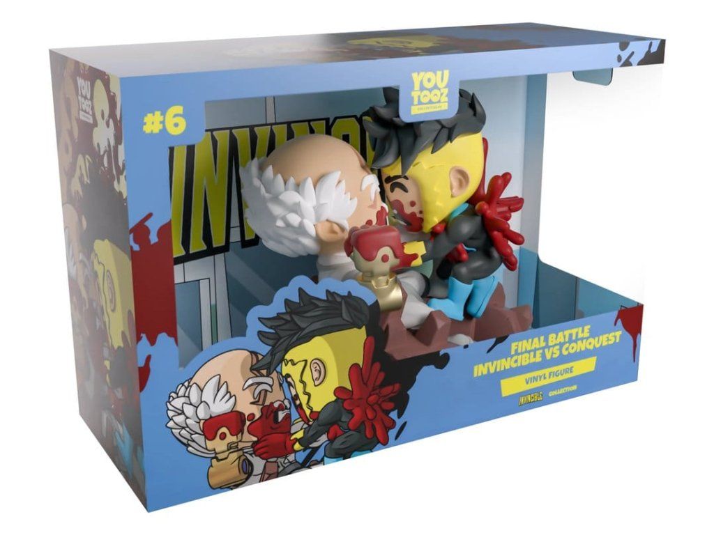 „Řekni mi, jak jsi žil!“ Závěrečný souboj Invincible s Conquestem se přenesl do Youtooz v jejich brutálním a krvavém návratu! Figurka vysoká 4,6 palce (cca 12 cm) zobrazuje Invincible, jak má ruku sevřenou na Conquestově krku a drtí ho o hromadu ostrých kamenů; krev pokrývá obličeje obou postav a Invincibleova maska je roztrhaná po okrajích, odhalující jeho zkrušený výraz. Conquest zatlačí pěst přímo do Invincibleova hrudníku, čímž ze zad vystřikne obrovská sprška krve; zvedá krvavě promočenou pěst a přes jeho obličej a hlavu se táhne výrazná jizva směrem k krátkým bílým vlasům. Vnější obal napodobuje brutální scénu přímo z komiksu. Uvnitř je naopak zobrazen nedotčený panoramat města pod jasně modrou oblohou, které se rozprostírá i na ochranném návleku, zatímco figurky jsou viditelné skrz velké průhledné okénko na přední straně obalu. Tento sběratelský kousek je zasílán v matném, raženém ochranném vnějším návleku a v plastovém obalu na míru pro maximální ochranu během přepravy. O seriálu Invincible: Invincible je animovaný superhrdinský seriál vytvořený Robertem Kirkmanem pro Amazon Prime Video a vychází z komiksové série se stejným názvem. Sleduje sedmnáctiletého Marka Graysona, který se potýká se svým osobním životem i s očekáváními a tvrdou realitou stát se superhrdinou pod vedením svého otce, nejsilnějšího hrdiny na planetě.