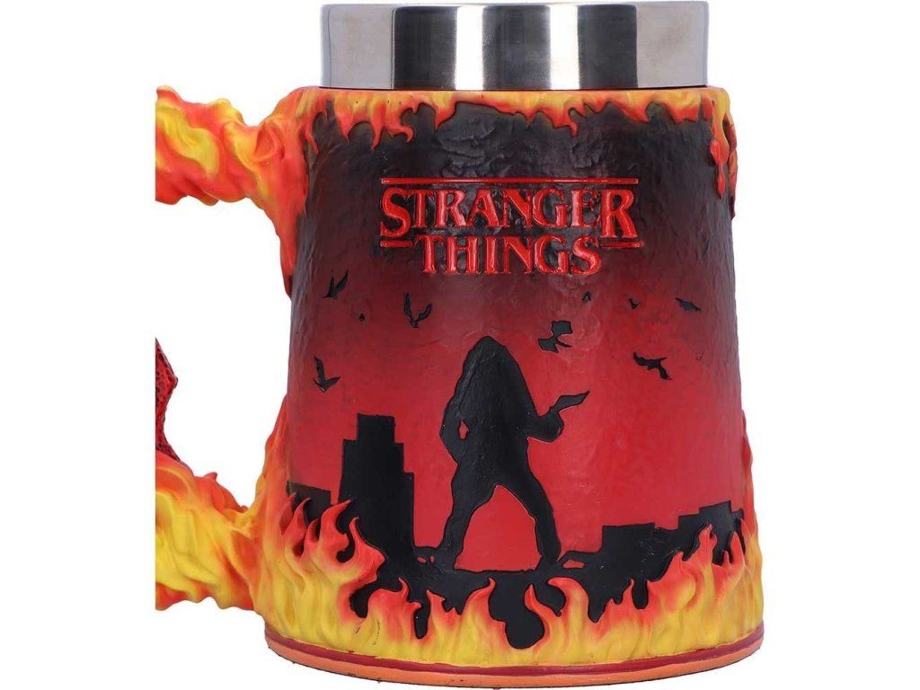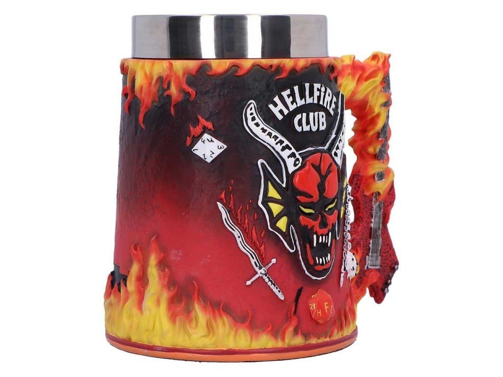 Korbel s ohnivě rudým designem zdobí logo Hellfire Clubu z populárního seriálu Stranger Things, na zadní straně pak najdeš ikonickou scénu z tohoto seriálu - siluetu Eddieho Munsona hrajícího na elektrickou kytaru. Dopřej si pár doušků něčeho pekelně dobrého a vychutnej si atmosféru Upside Down! Korbel je ručně malovaný a má vyjímatelný nerezový vnitřek pro snadné mytí. Tento oficiálně licencovaný kousek udělá radost sběratelům, ale hodí se i pro každodenní popíjení.