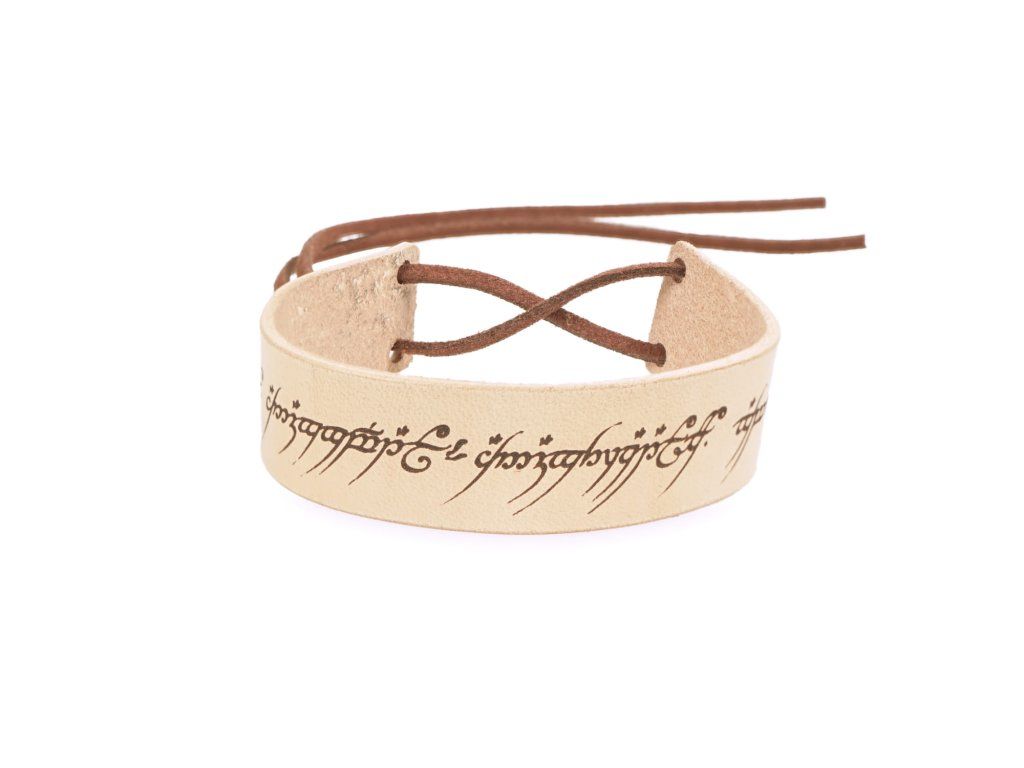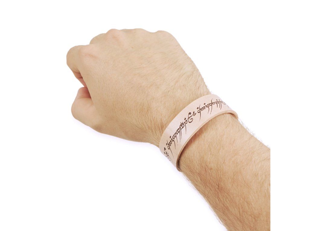 Tento stylový kožený náramek Jeden prsten vás rozhodně do temnoty nesváže! Originální kožený náramek vznikl v naší kožedělné dílně, kde temnota a Saruman mají vstup odepřen. Kožený náramek z lakované hovězí kůže o šířce 2 cm s nápisem z Prstenu moci nadchne každého fanouška Pána prstenů. Náramek je dlouhý 18 cm a zavazuje se pomocí kožené šňůrky. Na přání lze obvod upravit.