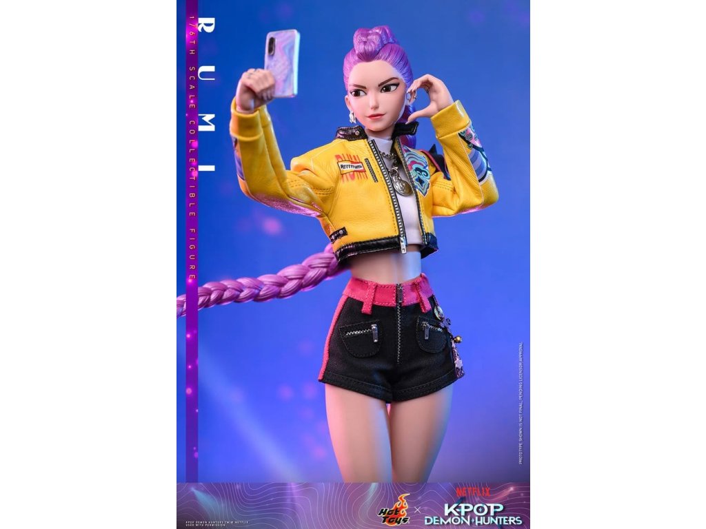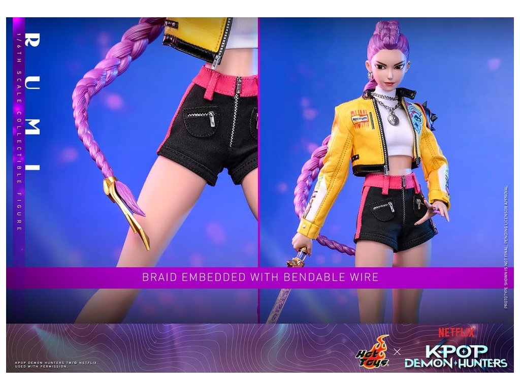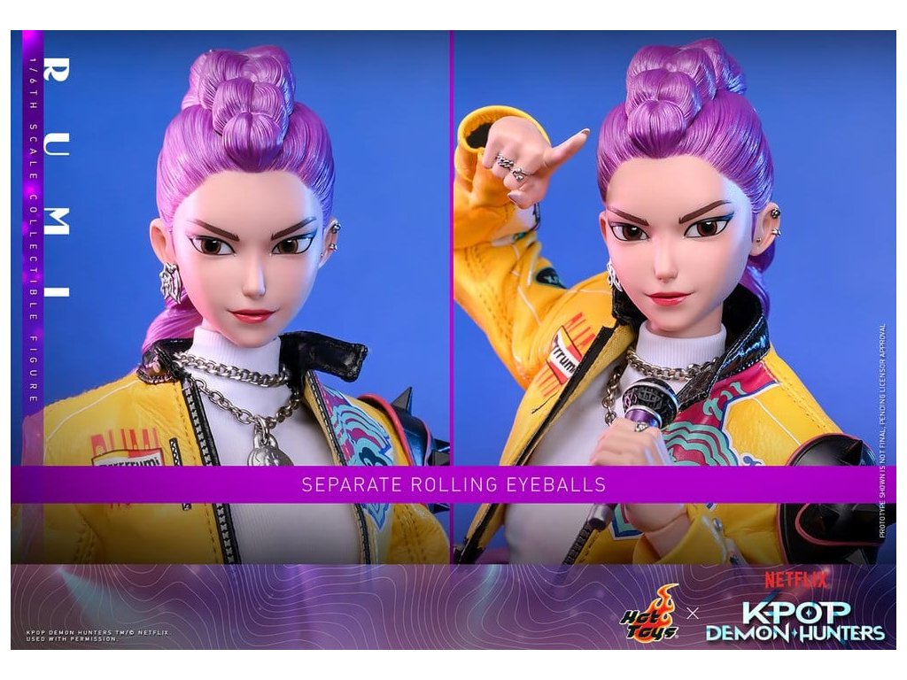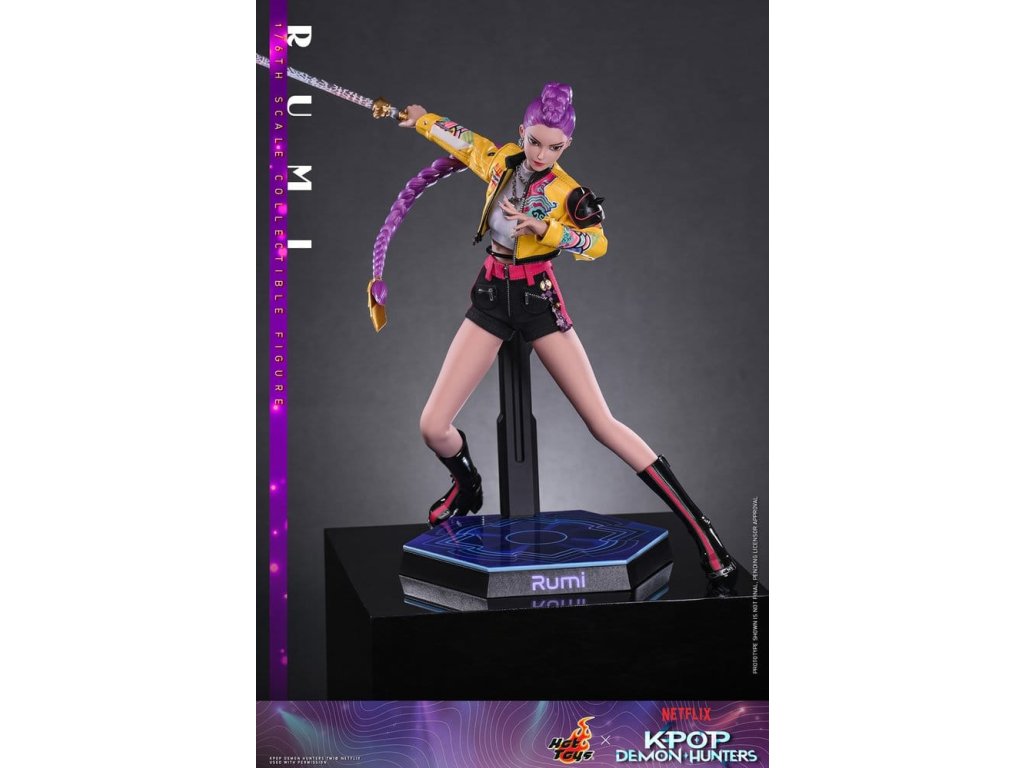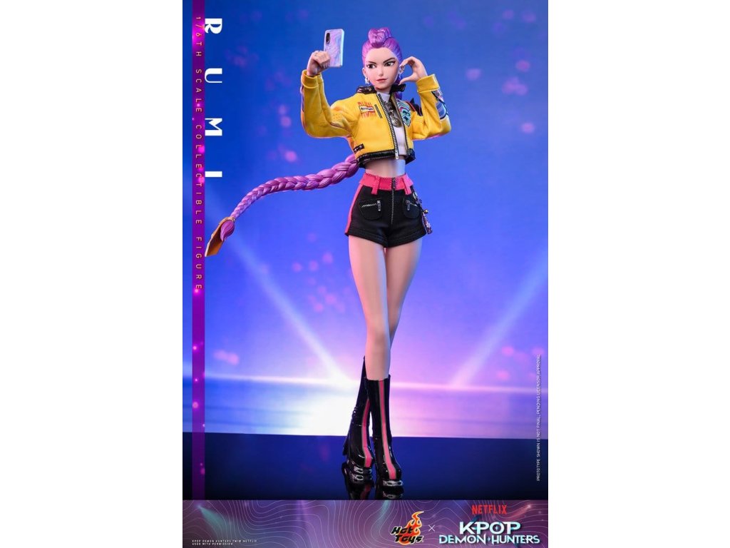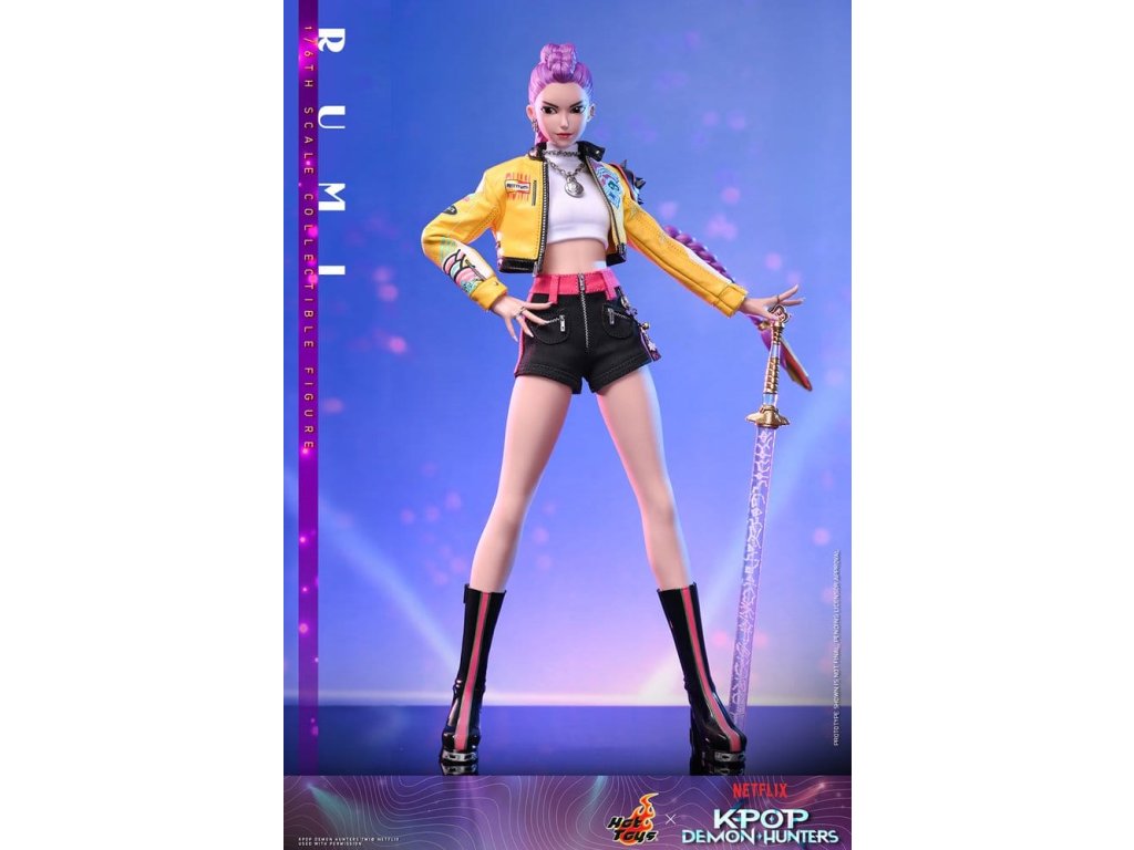 "Dobře, je čas na naše předzápasové ramyeon!" - Rumi. V KPop Demon Hunters je Rumi, charismatická lídryně a hlavní zpěvačka celosvětové senzace K-pop HUNTR/X, která ovládá scénu díky svému silnému hlasu a sebevědomé přítomnosti. Ohromuje fanoušky energickými výkony, zatímco tajně chrání lidstvo před démonickými silami, které hrozí, že rozbijí Honmoon. Sideshow a Hot Toys s hrdostí prezentuje sběratelskou figurku Rumi v šesté velikosti, která zachycuje její energii a ikonický styl v ohromujícím detailu. Figurka má nově vyvinutou hlavu se dvěma vyměnitelnými tvářemi (s úsměvem a zpěvem), obě vybavené oddělenými očima pro realistické zobrazení. Její typický účes s fialovými draky je zabudovaný, což umožňuje expresivní pozování, které odráží její pohyb na scéně. Tělo šesté figury je nově vyvinuté a je vyrobeno z silikonového materiálu pro dosažení bezšvého spojovacího designu. Osm kusů nově vyvinutých vyměnitelných rukou se sochařsky zpracovanými prstýnky a detaily na laku na nehty umožňuje širokou škálu expresivních gest, od póz představení až po bojové postoje. Rumi je připravena ve svém pečlivě vyrobeném oblečení pro její vystoupení "Jak se to dělá", které obsahuje odvážnou žlutou kraťasovou bundu s potiskem a ostnatou levou ramenní výplní, bílý rolák, kovové náhrdelníky, kraťasové kalhoty zdobené fialovým přívěskem norigae a párem lýtkových bot na platformě - zcela zachycuje její nápadnou estetiku na scéně. Když se hudba změní v boj, Rumi ovládá svůj Sain-geom (čtyřtigrý meč) - krásně vyrobenou zbraň s průhledným čepelí vyrytými souhvězdími a zlatou rukojetí, která symbolizuje jak tradici, tak moc. Úplný set příslušenství specifického pro postavu oživuje její svět, včetně mikrofonu, smartphonu, nádobky na nudle, funkčního světla HUNTR/X, holografického podpisu na plakátě, holografického praporu, lenticulárního pozadí postavy, a speciálně navrženého stojánku na figury s motivem scény pro dokončení výstavy. Rumi je divoká na scéně a nezastavitelná v bitvě, je tady s ostatními členy skupiny - předobjednávejte nyní a sejděte celou skupinu HUNTR/X ve svém výstavním prostoru! Orientační datum vydání: červen 2027