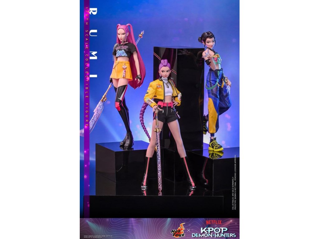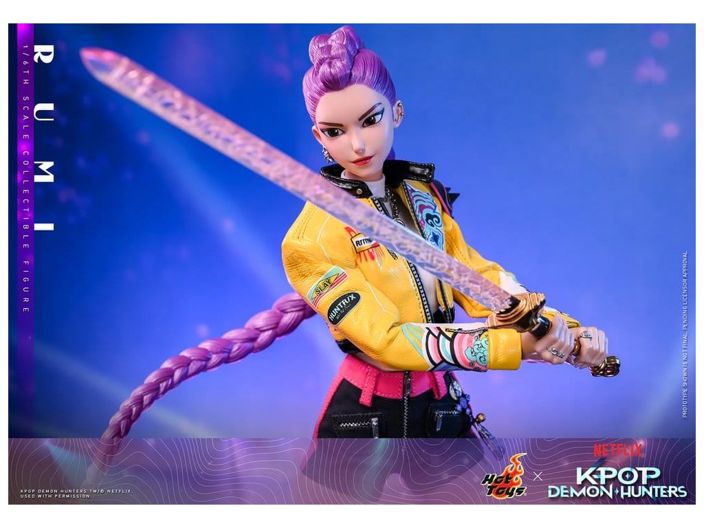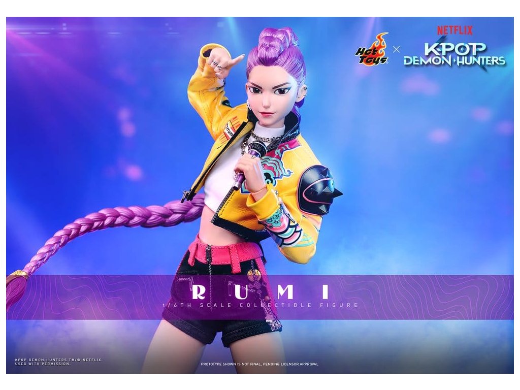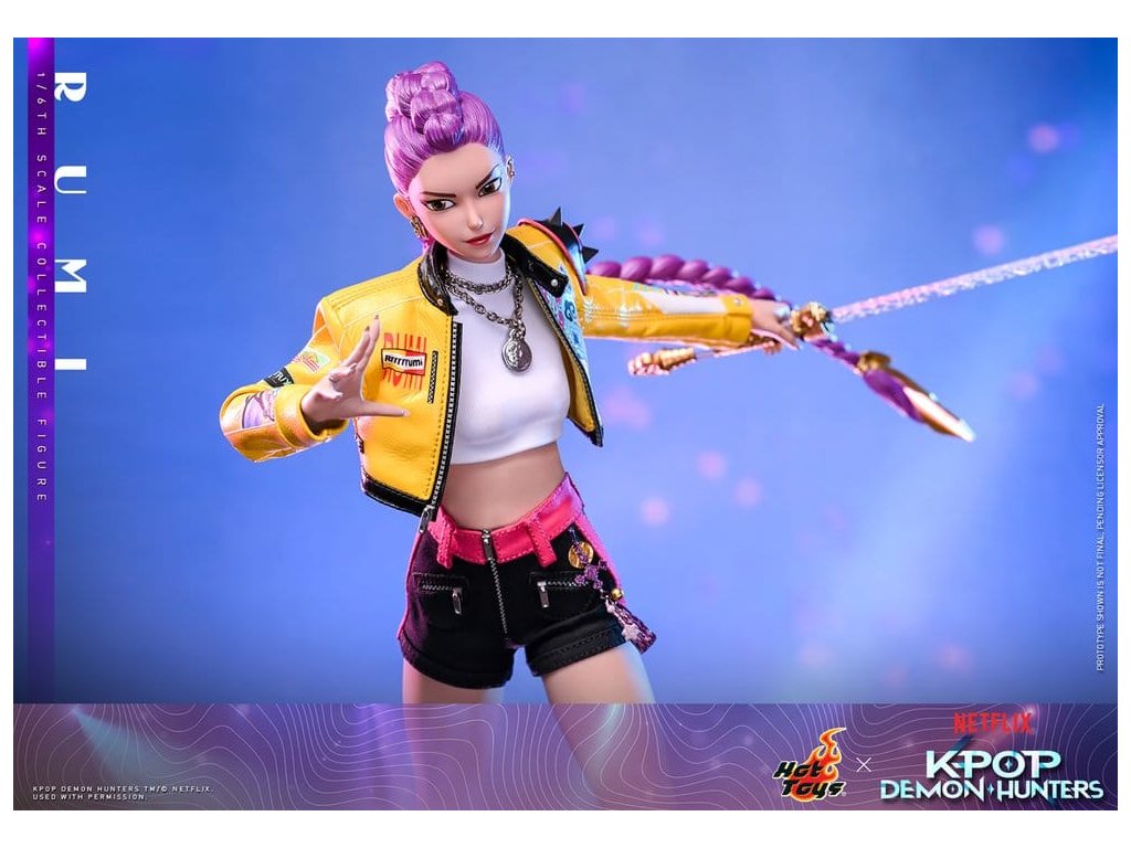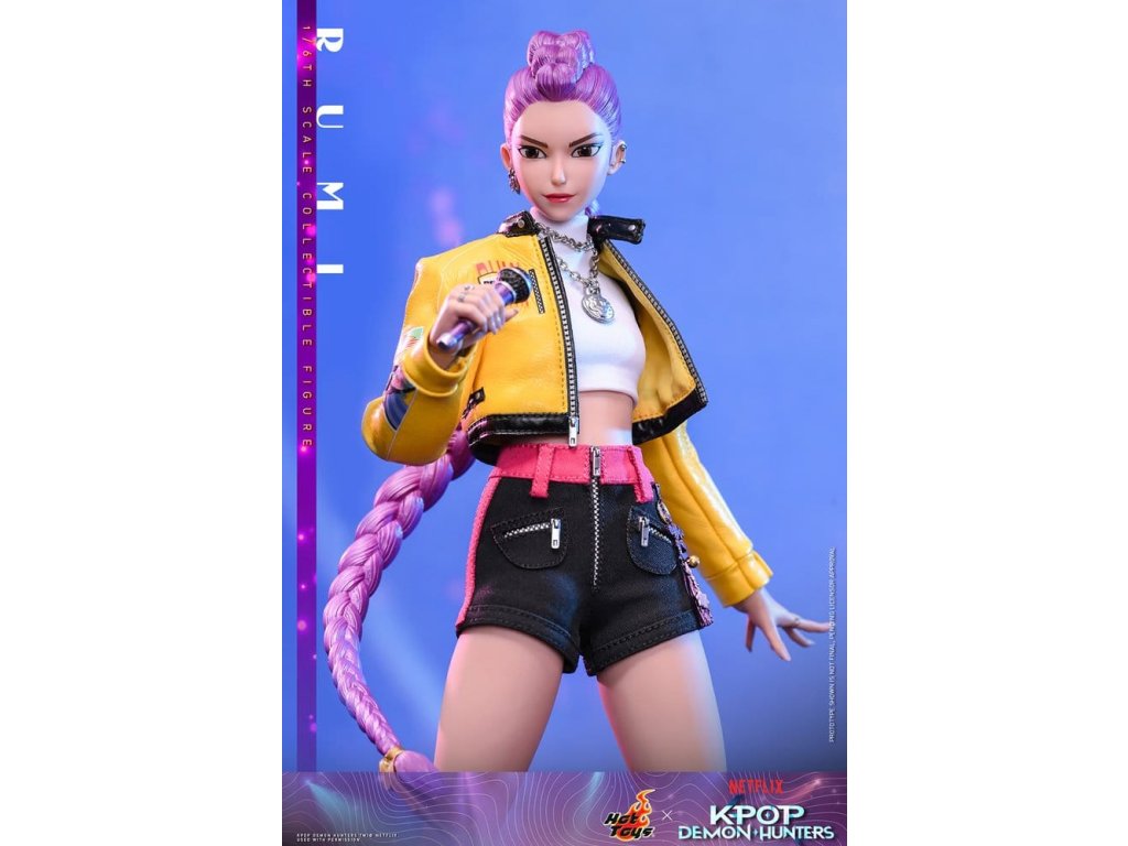 "Dobře, je čas na naše předzápasové ramyeon!" - Rumi. V KPop Demon Hunters je Rumi, charismatická lídryně a hlavní zpěvačka celosvětové senzace K-pop HUNTR/X, která ovládá scénu díky svému silnému hlasu a sebevědomé přítomnosti. Ohromuje fanoušky energickými výkony, zatímco tajně chrání lidstvo před démonickými silami, které hrozí, že rozbijí Honmoon. Sideshow a Hot Toys s hrdostí prezentuje sběratelskou figurku Rumi v šesté velikosti, která zachycuje její energii a ikonický styl v ohromujícím detailu. Figurka má nově vyvinutou hlavu se dvěma vyměnitelnými tvářemi (s úsměvem a zpěvem), obě vybavené oddělenými očima pro realistické zobrazení. Její typický účes s fialovými draky je zabudovaný, což umožňuje expresivní pozování, které odráží její pohyb na scéně. Tělo šesté figury je nově vyvinuté a je vyrobeno z silikonového materiálu pro dosažení bezšvého spojovacího designu. Osm kusů nově vyvinutých vyměnitelných rukou se sochařsky zpracovanými prstýnky a detaily na laku na nehty umožňuje širokou škálu expresivních gest, od póz představení až po bojové postoje. Rumi je připravena ve svém pečlivě vyrobeném oblečení pro její vystoupení "Jak se to dělá", které obsahuje odvážnou žlutou kraťasovou bundu s potiskem a ostnatou levou ramenní výplní, bílý rolák, kovové náhrdelníky, kraťasové kalhoty zdobené fialovým přívěskem norigae a párem lýtkových bot na platformě - zcela zachycuje její nápadnou estetiku na scéně. Když se hudba změní v boj, Rumi ovládá svůj Sain-geom (čtyřtigrý meč) - krásně vyrobenou zbraň s průhledným čepelí vyrytými souhvězdími a zlatou rukojetí, která symbolizuje jak tradici, tak moc. Úplný set příslušenství specifického pro postavu oživuje její svět, včetně mikrofonu, smartphonu, nádobky na nudle, funkčního světla HUNTR/X, holografického podpisu na plakátě, holografického praporu, lenticulárního pozadí postavy, a speciálně navrženého stojánku na figury s motivem scény pro dokončení výstavy. Rumi je divoká na scéně a nezastavitelná v bitvě, je tady s ostatními členy skupiny - předobjednávejte nyní a sejděte celou skupinu HUNTR/X ve svém výstavním prostoru! Orientační datum vydání: červen 2027